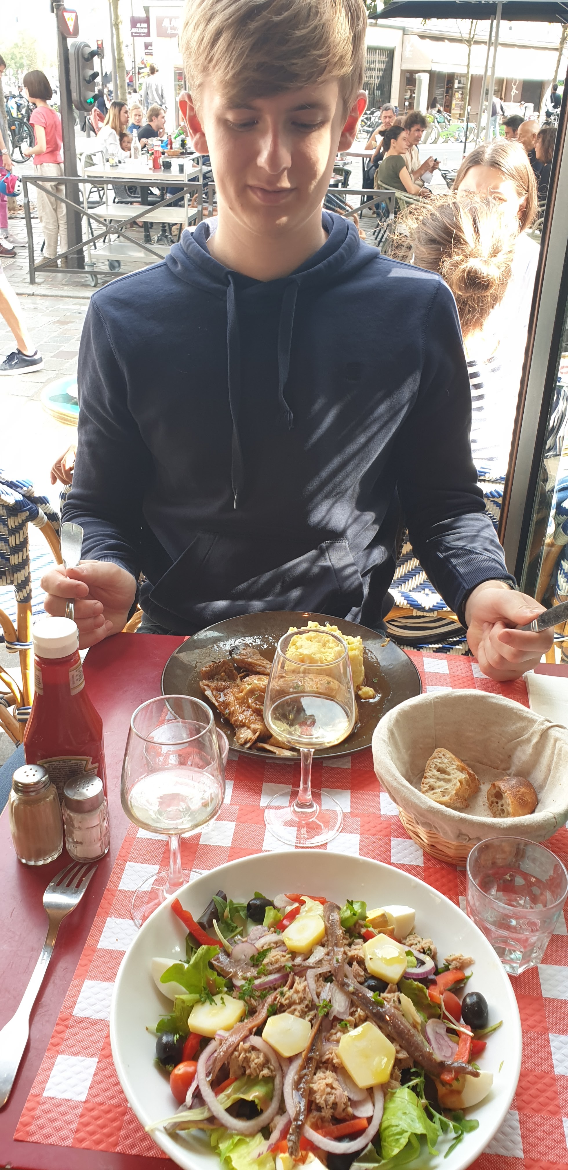 J'ai trouvé cet endroit au hasard et j'ai dîné. Les serveurs étaient sympathiques et parlaient presque tous anglais. Le seul serveur qui ne parlait pas anglais s'est même mis en quatre pour demander à sa collègue comment nous dire profitez de votre soirée alors qu'elle partait pour sa pause ! J'ai pris le tartare de saumon et c'était délicieux, et mon copain a adoré son bol de poulet et de légumes. Un super petit coin pour regarder les gens aussi.