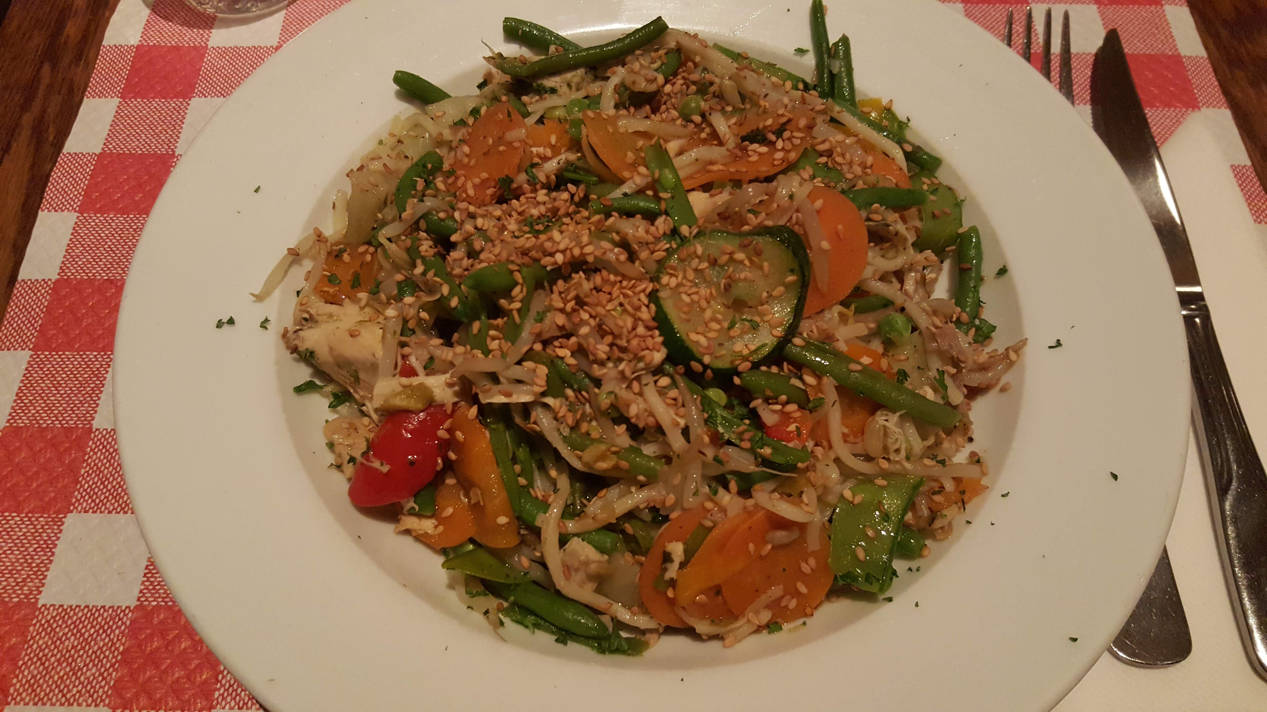 J’ai pris un wok de légumes: vraiment pas bon! Aucun goût, en plus il y avait des nouilles ramollies dedans qui n’étaient pas annoncées sur la carte. (Quand on met “wok de légumes” je m’attendais à voir des légumes et non pas des pâtes comme ingrédient principal…)J’ai payé 13€90 pour ça et j’en ai laissé 3/4. Ambiance sympa, je ne sais pas pour les autres plats, mais c’est sûr que je n’y reviendrai pas …