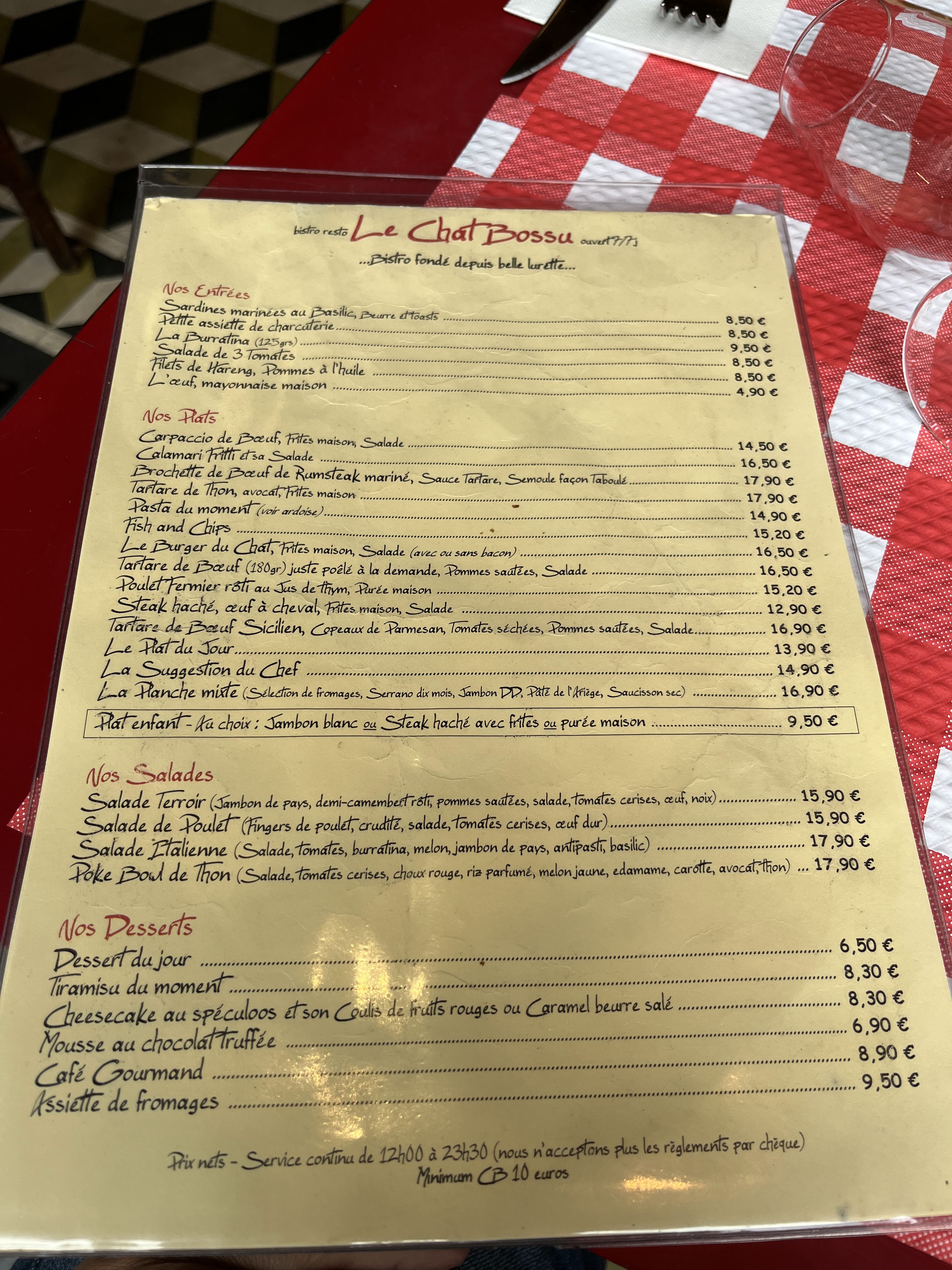 Malheureusement j’ai trouvé ce restaurant mauvais. C’était une déception. Mon tartare sicilien était sucré à cause du ketchup ajouté à la louche , ce n’était pas bon, la mousse au chocolat compacte comme une brique, le vin était franchement mauvais… Ça faisait 2 ans que l’on avait pas été chez le chat bossu et t malheureusement nous avons tous été déçu de cette expérience resto. Dommage car le lieu est sympa et le service très agréable.