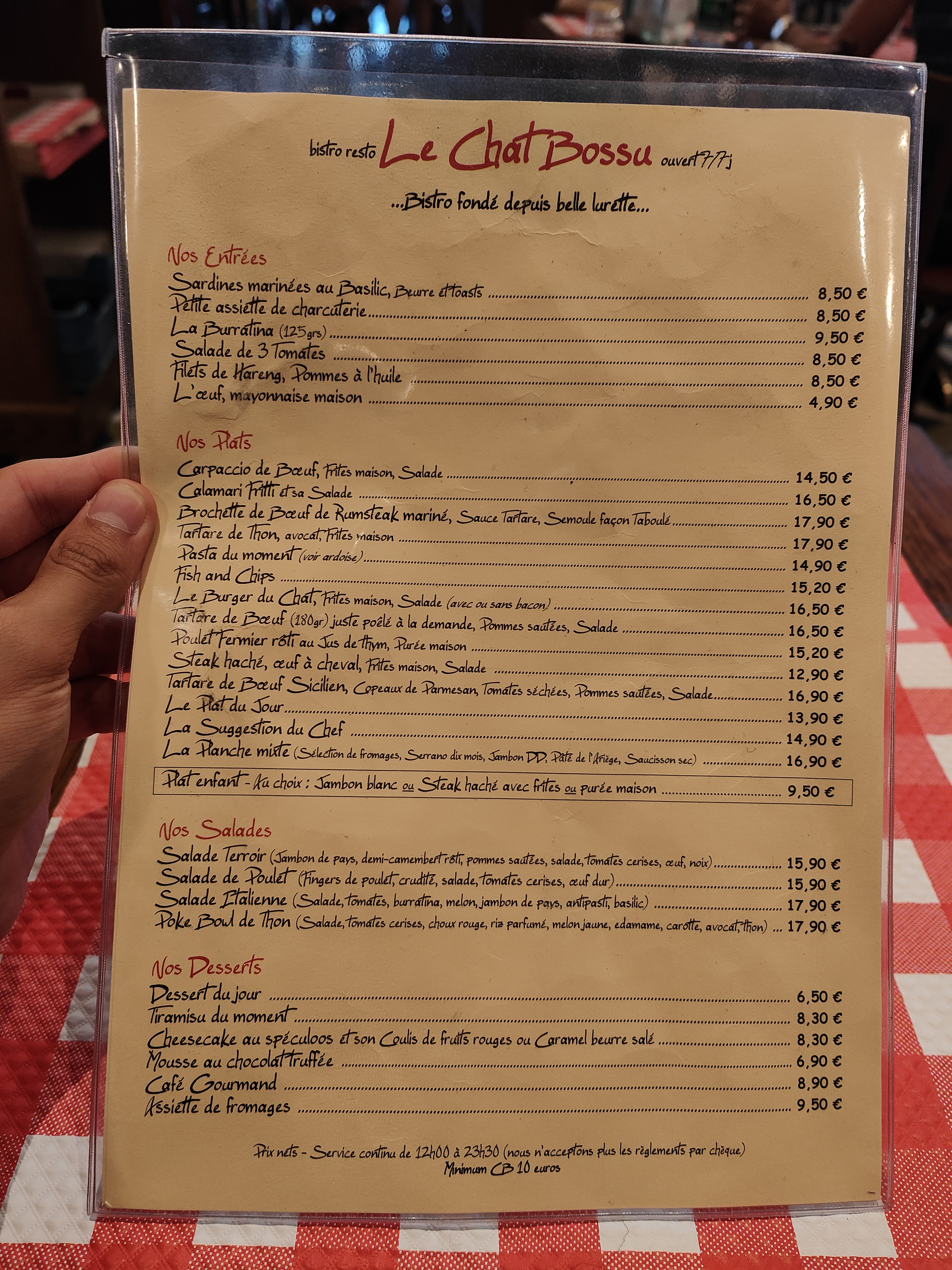 Le burger du chat était croustillant et la viande extra, le personnel sympa et disponible (on s'est présentés à 10 à 22 h 45 et ils nous ont accueillis avec le sourire. Le vin maison aussi excellent. 5 étoiles et c'est la première fois que je les attribue!