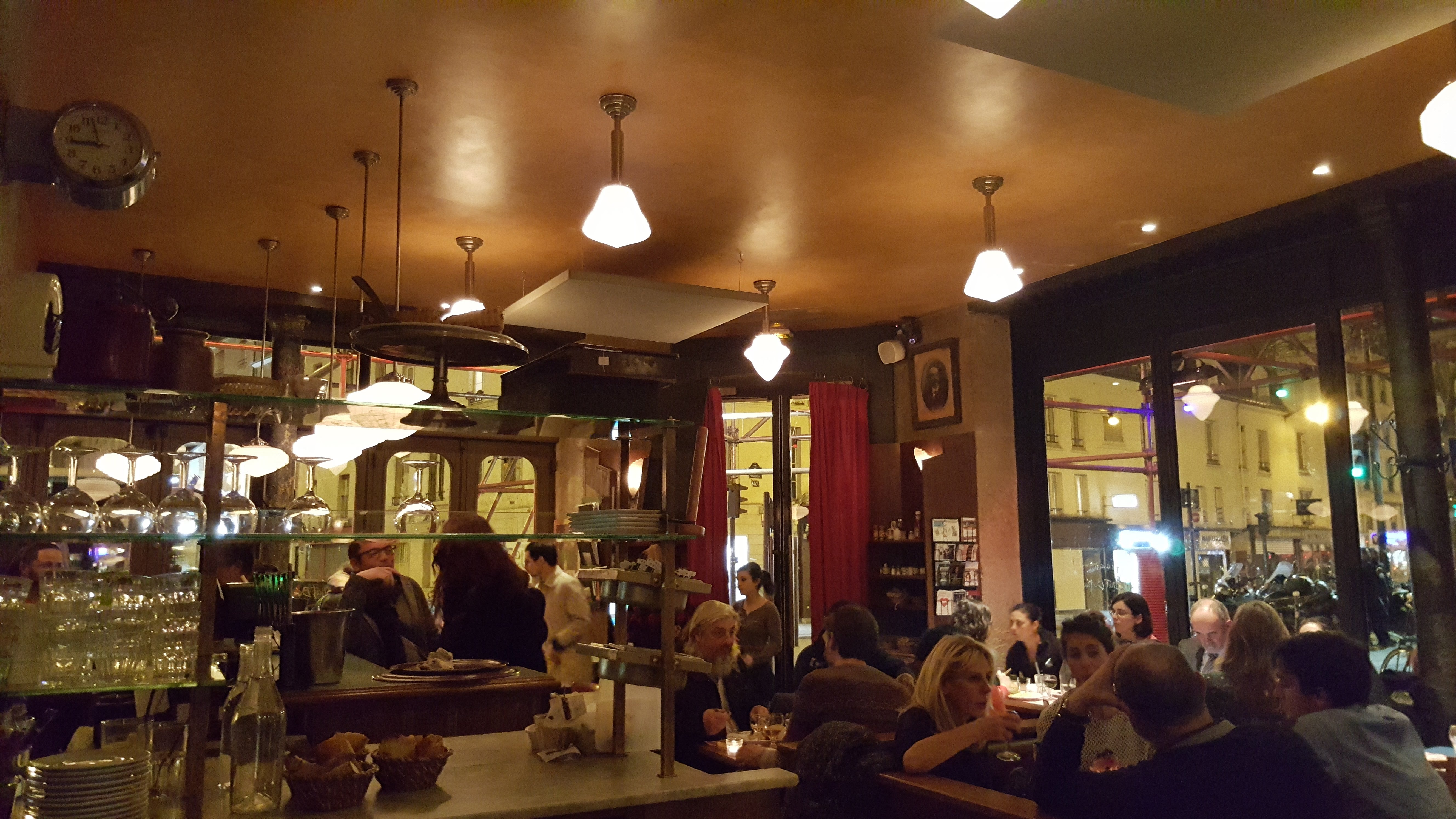 On y a passé de très bons moments. Serveurs très sympas, efficaces et rapides (comme il le faut dans un bistrot). Dernièrement on y est resté 2 heures, on a pris un plateau de fromage pour finir le vin, puis du vin pour finir le fromage ! Comme quoi on y était à l'aise dans ce lieu.