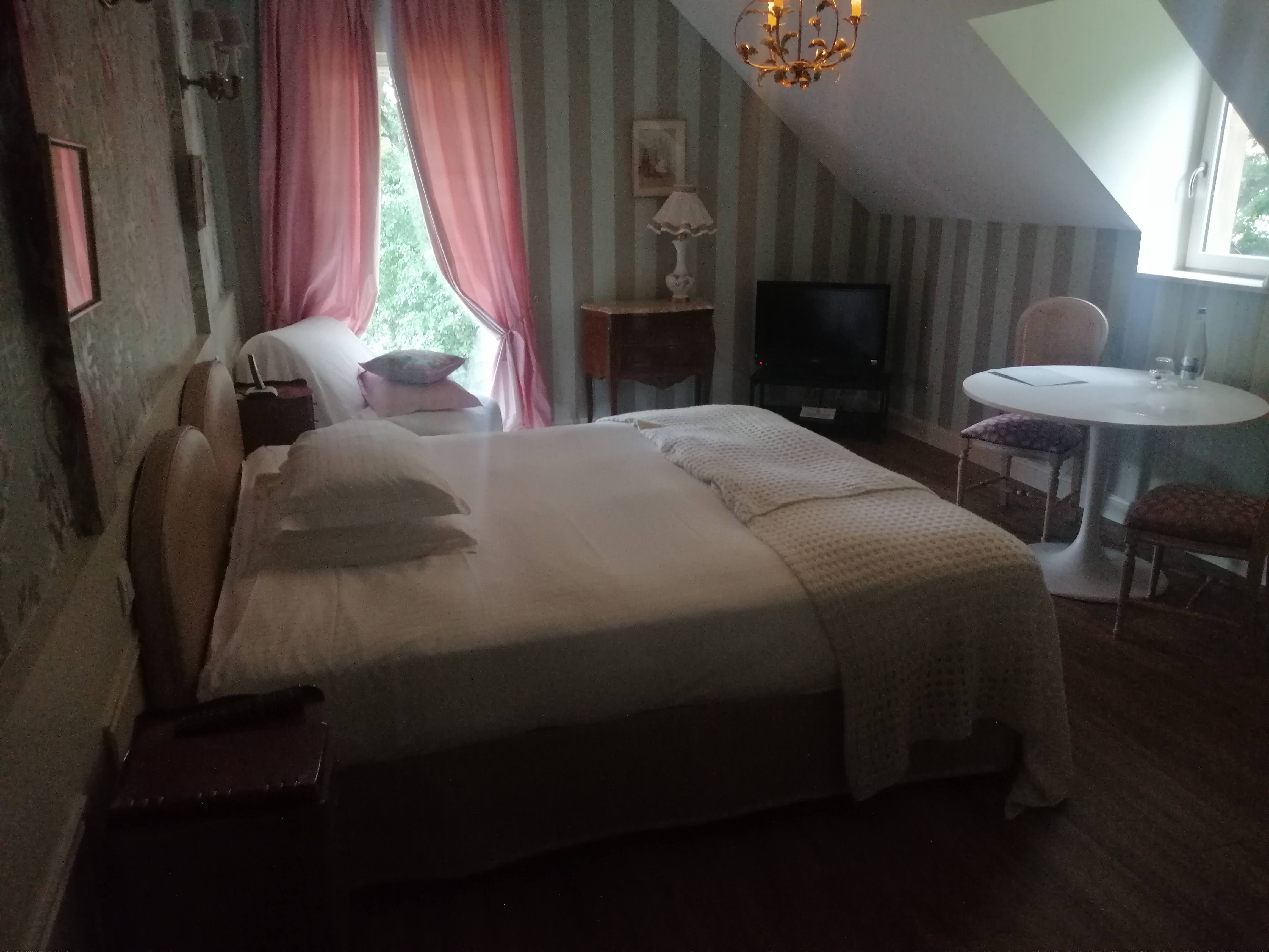 Beau château. Chambre spacieuse. Décoration chargée. Quelques points a revoir. - rideaux dans la chambre déchirée. - Drap taché - salle de bain froide, même avec le chauffage. - sèche cheveux pas adapté. Petit déjeuner moyen. Grappe de raisin déjà consommé par d autres clients. Obligé de se lever pour aller en office demander une deuxième tasse de café ! Pourquoi pas mettre un pot directement sur la table ? Vienoiserie médiocre. - service au minima et sans sourire. Les bases de l'hôtellerie sont à revoir. 4 étoiles maximum.