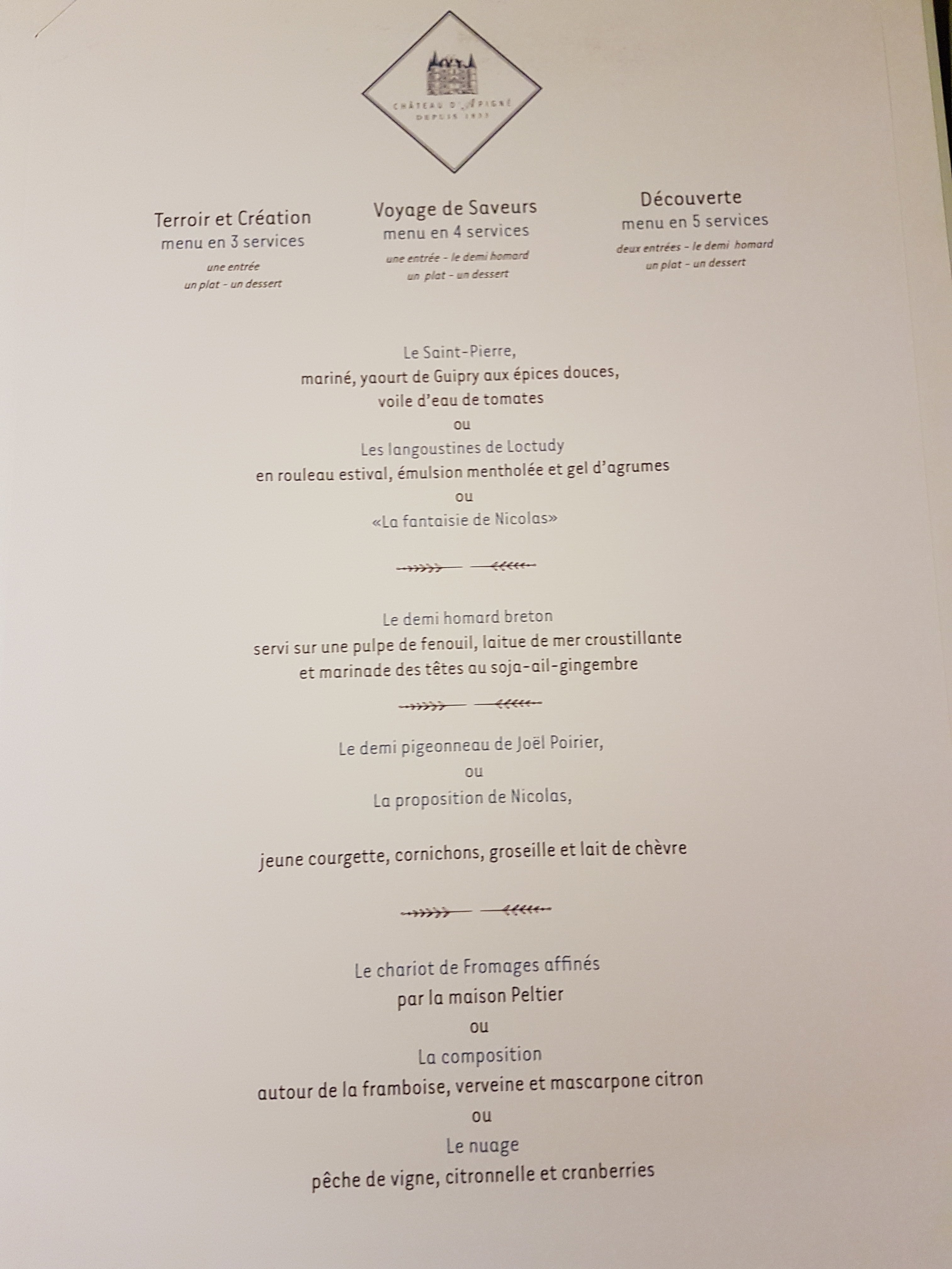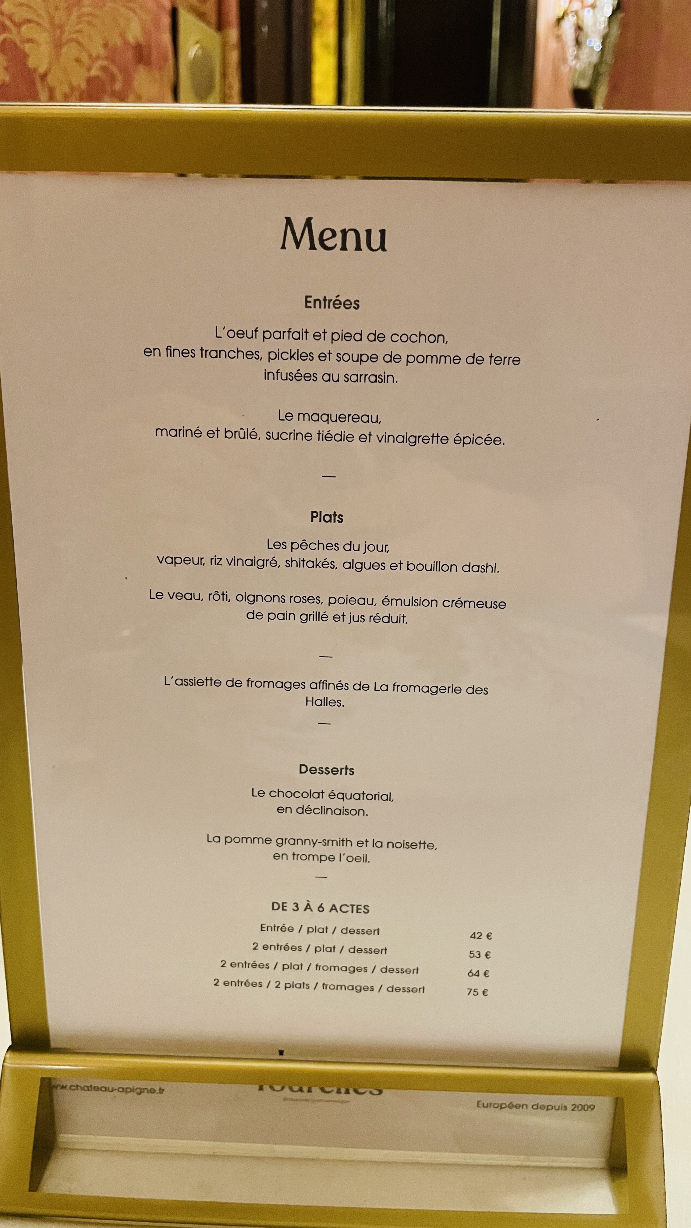 Un pur moment de plaisir gastronomique ! Un cadre chatelain magnifique, des cuissons maîtrisées, des accords audacieux et des assaisonnements justes ! Un vrai regal pour le palet et les yeux! Digne de l'étoile Michelin !