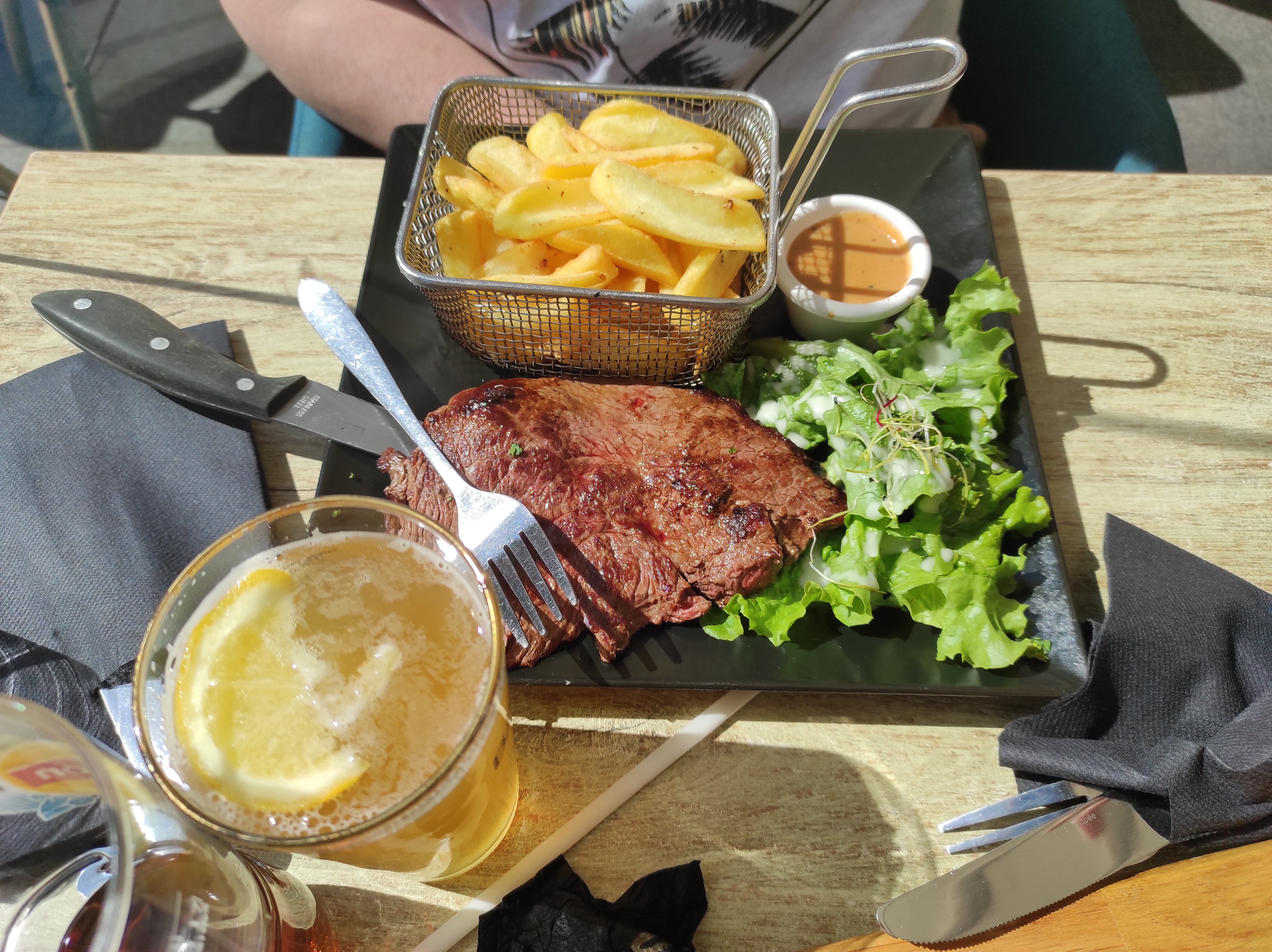 Mon Irish coffee m'a donné mal à la tête le lendemain. Ca ne m'arrive pas souvent. L'alcool n'était peut-être pas tip top. La pièce de boucher était correcte et les frites aussi. Le service était très bien. Serveur attentionné et fiable. Manger sur la terrasse même couverte, ca fait un peu juste en hiver. Y avait un léger courant d'air qui nous a refroidit doucement mais sûrement.