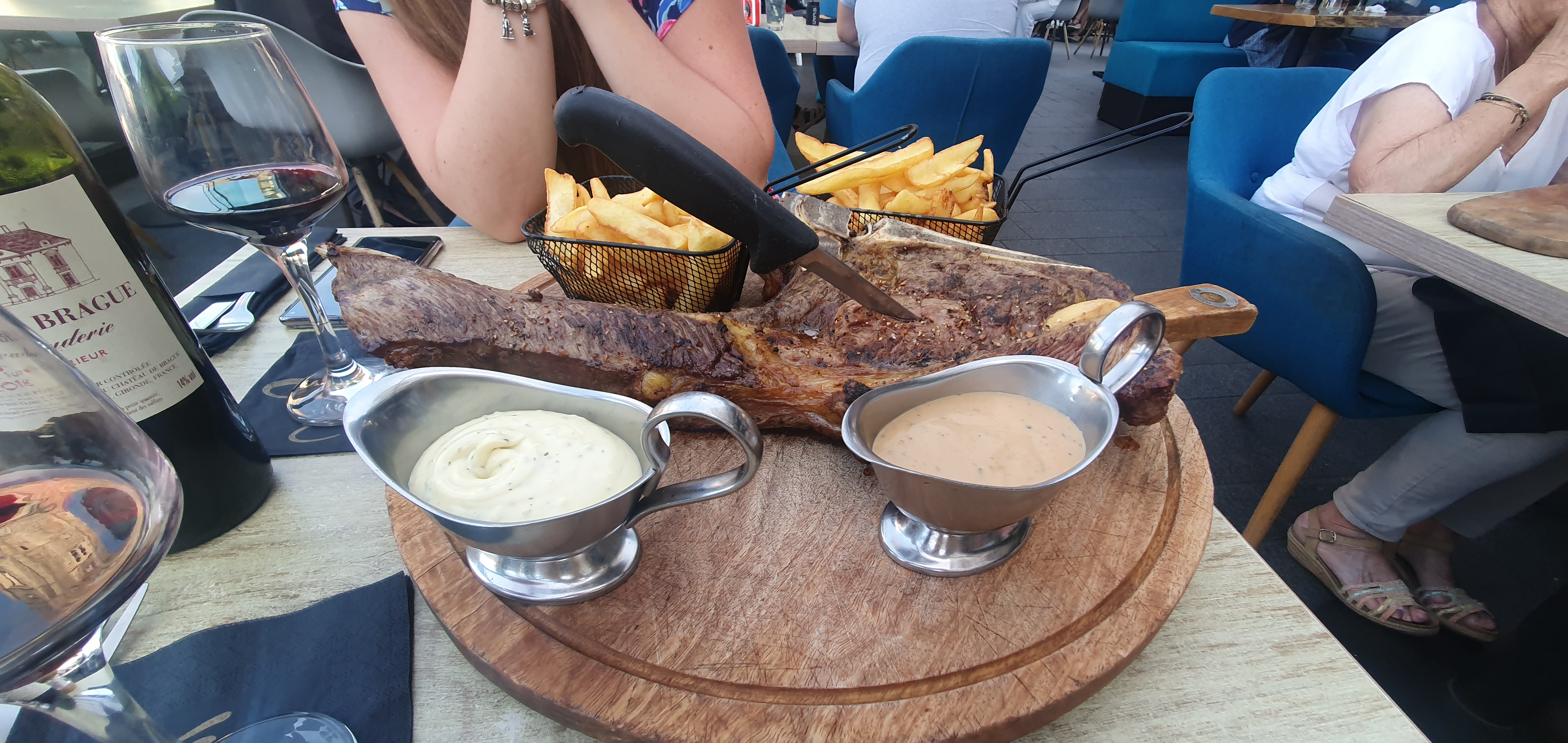 Un restaurant de planches, de bowls, possédant aussi quelques plats. Sont grand point fort est la terasse intérieur et extérieur. Elle s'ouvre et se ferme pour s'adapter à notre temps capricieux. Nous avons bu deux cocktails ( Spritz ) un grand classique du moment avec un tomahawk, une viande de minimum 1kg500, la cuisson était parfaite, juste je suggère de mettre sur une ardoise qui pourrais garder la chaleur de la viande. Le service est très bon, plusieurs fois, on nous as demandé si tout vas bien, personnel souriant, rapide et sympathique. De bon conseils et arrangeants. Le vin est plutôt bon et vous en avez pour tous les prix. Comptez 48€ pour le tomahawk de 1kg500. Une bonne ambiance, pour tous le monde, couple ou familles. Merci pour ce bon repas 😘