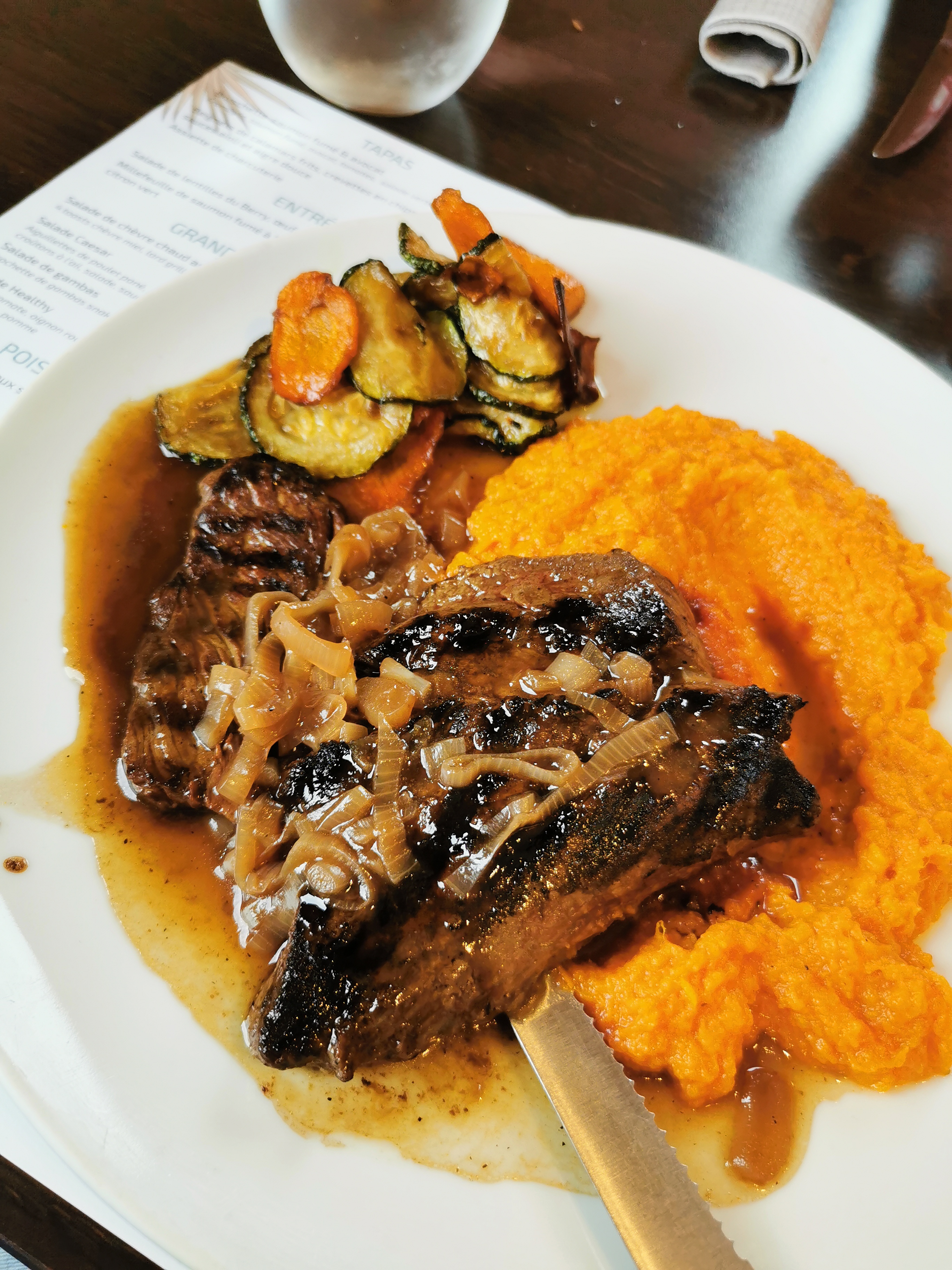Très bon repas avec un onglet à l'échalote, purée de patates douces et chips de légumes, tiramisu au Nutella. Nous reviendrons 😊