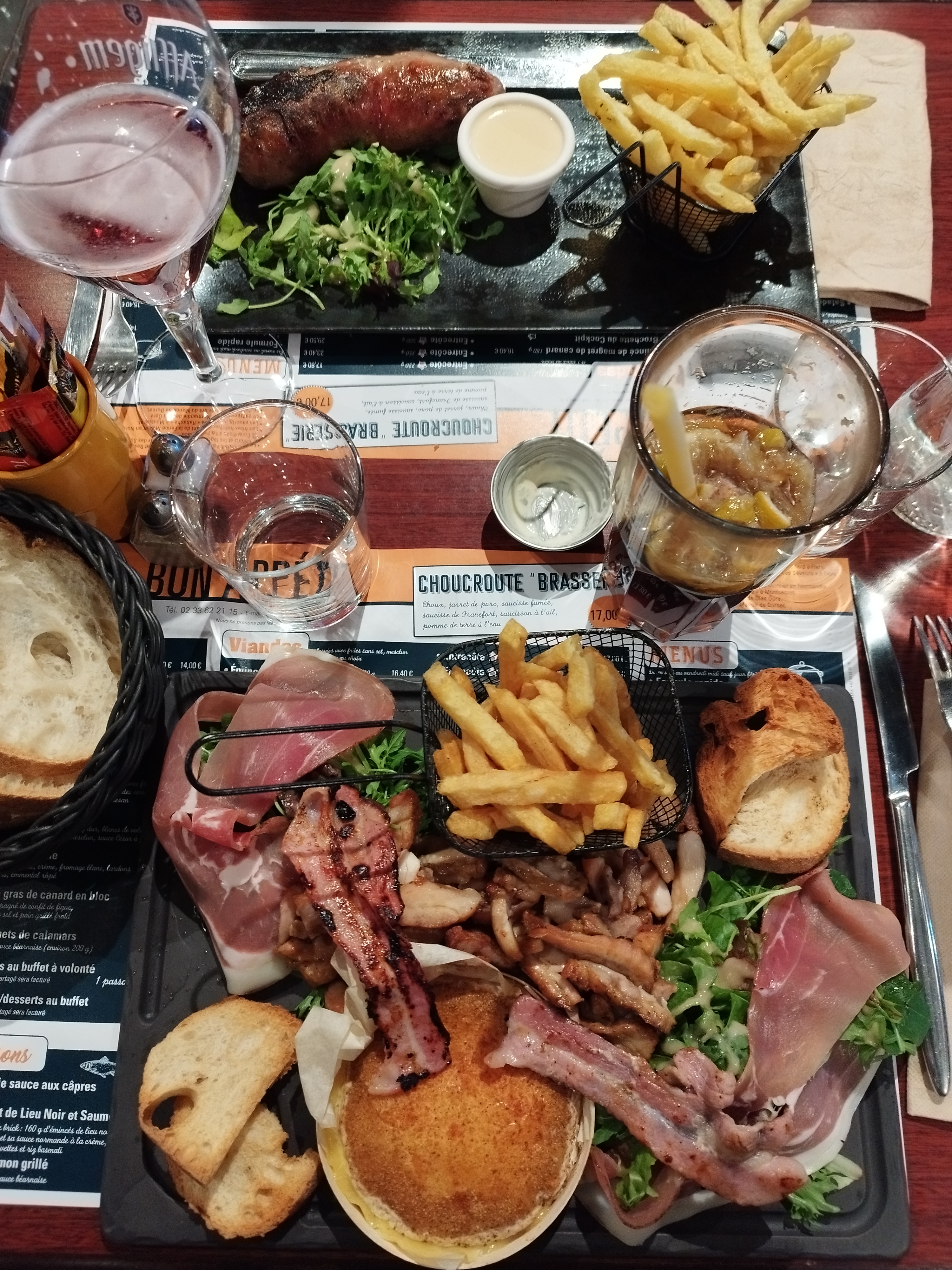 Pareil que le commentaire précédent, digestion difficile, mais moi c'est parce que je me suis gavé. +++ La choucroute on aurait pu manger à deux dessus Bonne diversité de produits pour le buffet entrée. Atmosphère très agréable, employés sympathique, qualité et quantité pour les produits - - - la bière qui trainait sur le comptoir juste complèté de mousse pour me la servir, moyen moyen... Un peu fade la raie..