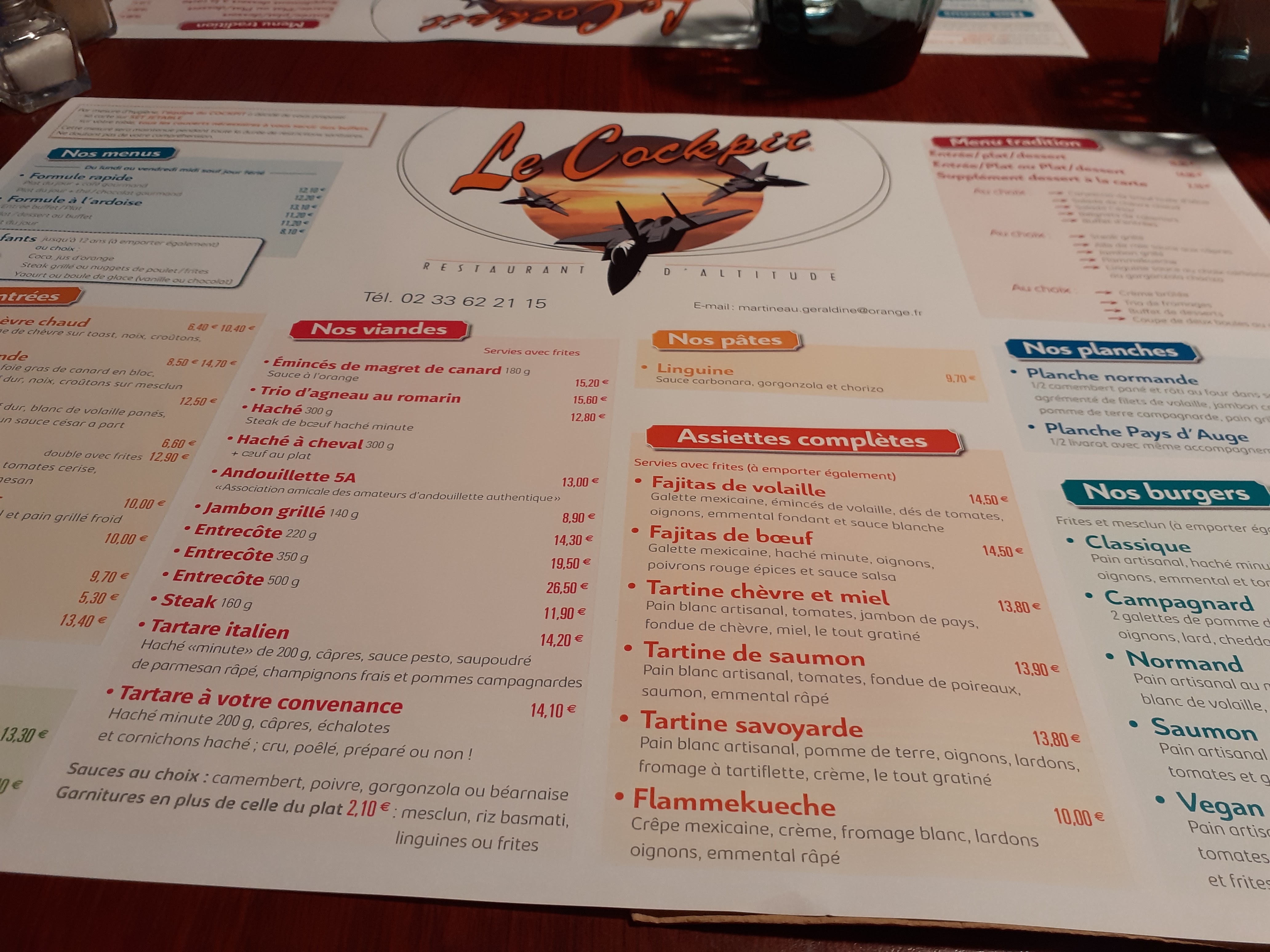 Nous venons pour la première fois, nous n avons pas été déçu , nous avons très bien mangé, le service est très rapide, les serveuses sont très agréables, l intérieur est super, très belle décoration , très bien accueilli brasserie à conseiller à nos amis et à nos proches bonne continuation à toutes l équipe . La Brasserie Le Cockpit se trouve à FLERS de l Orne