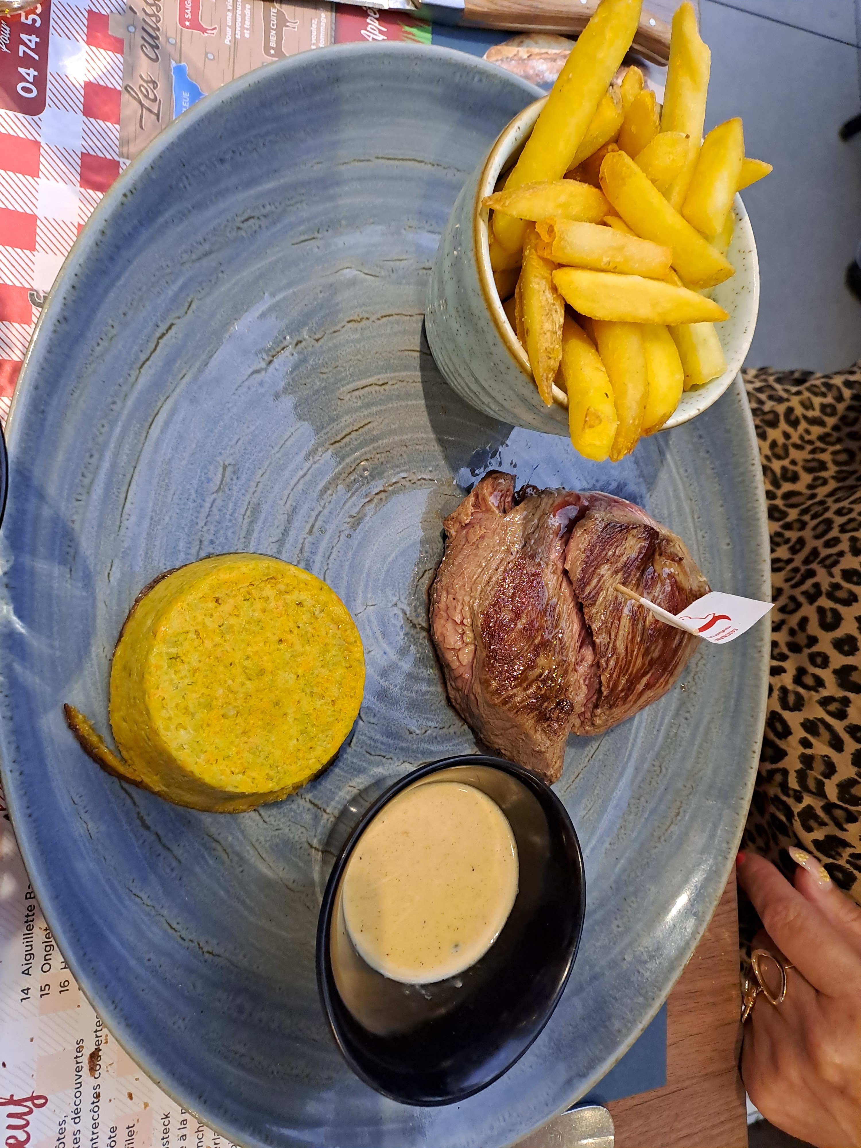 20/04/22 Nouveau passage, toujours aussi bien. Début avril 2022 Très accueillant.le chargeur prêté pour mon tél en fin de batterie.👍 Viande excellente. Si avec votre viande vous est servi avec un beurre persillé, ne prenez pas de sauce, ce serait gâché. Nature avec beurre, niac😛. Dessert tatin, café. Il faut vraiment que je mange plus leger ..., mais pas ce soir.merci à votre équipe. En déplacement, ca me donne la patate. Ah si , chouette le tendu au plafond. J aime aussi la vue sur la cuisine. Il n y a effectivement pas de raison de cacher le chef, Il n est pas puni. Bref, un bon moment. Bonne continuation. Votre client de 2 mètres.🥳🙂