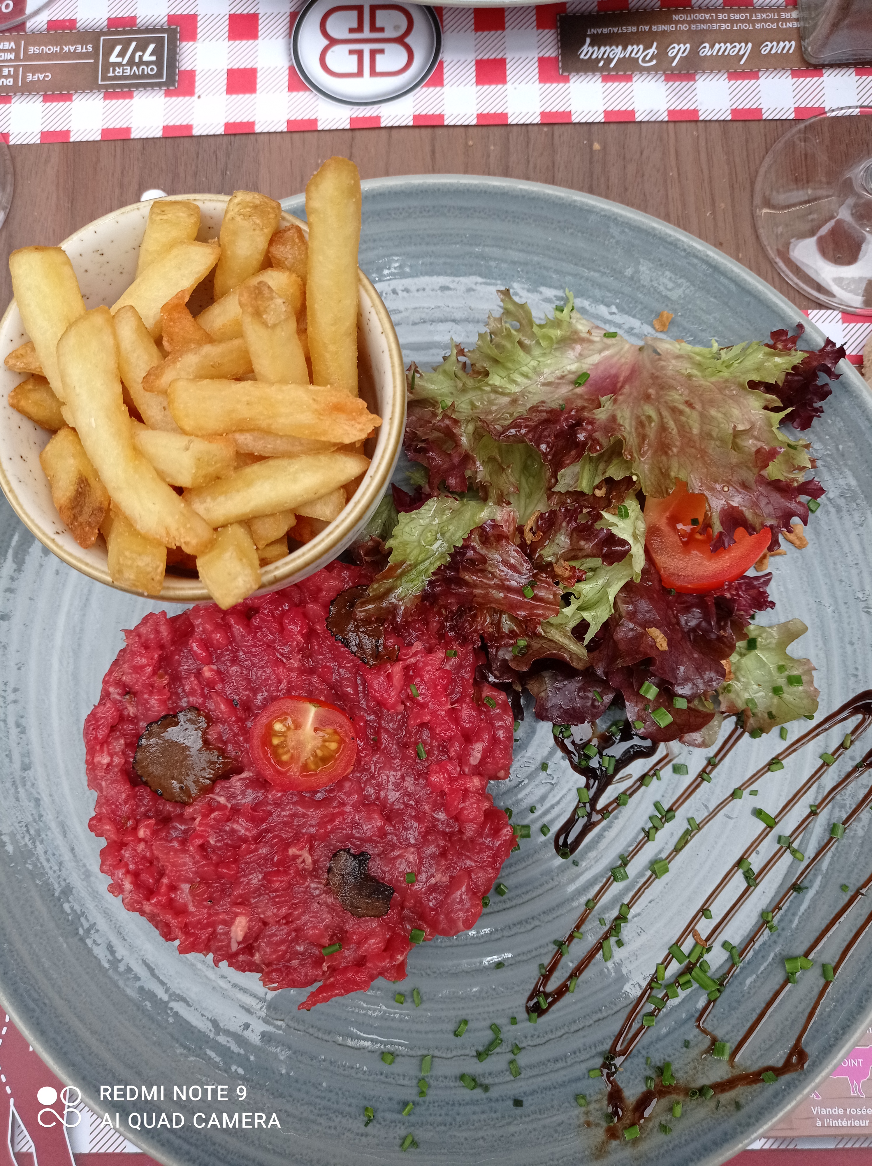 Les tartares et burgers étaient copieux et bons. Les frites servies en accompagnement moelleuses et ne dégoulinaient pas d'huile. L'équipe est souriante, le service plutôt rapide pour un vendredi soir. Seul bémol l'environnement. Une terrasse optimisée au maximum qui de fait est bruyante, vous laisse peu de place et vous oblige à partager la fumée des voisins dans entendre ce qui se dit à votre table.