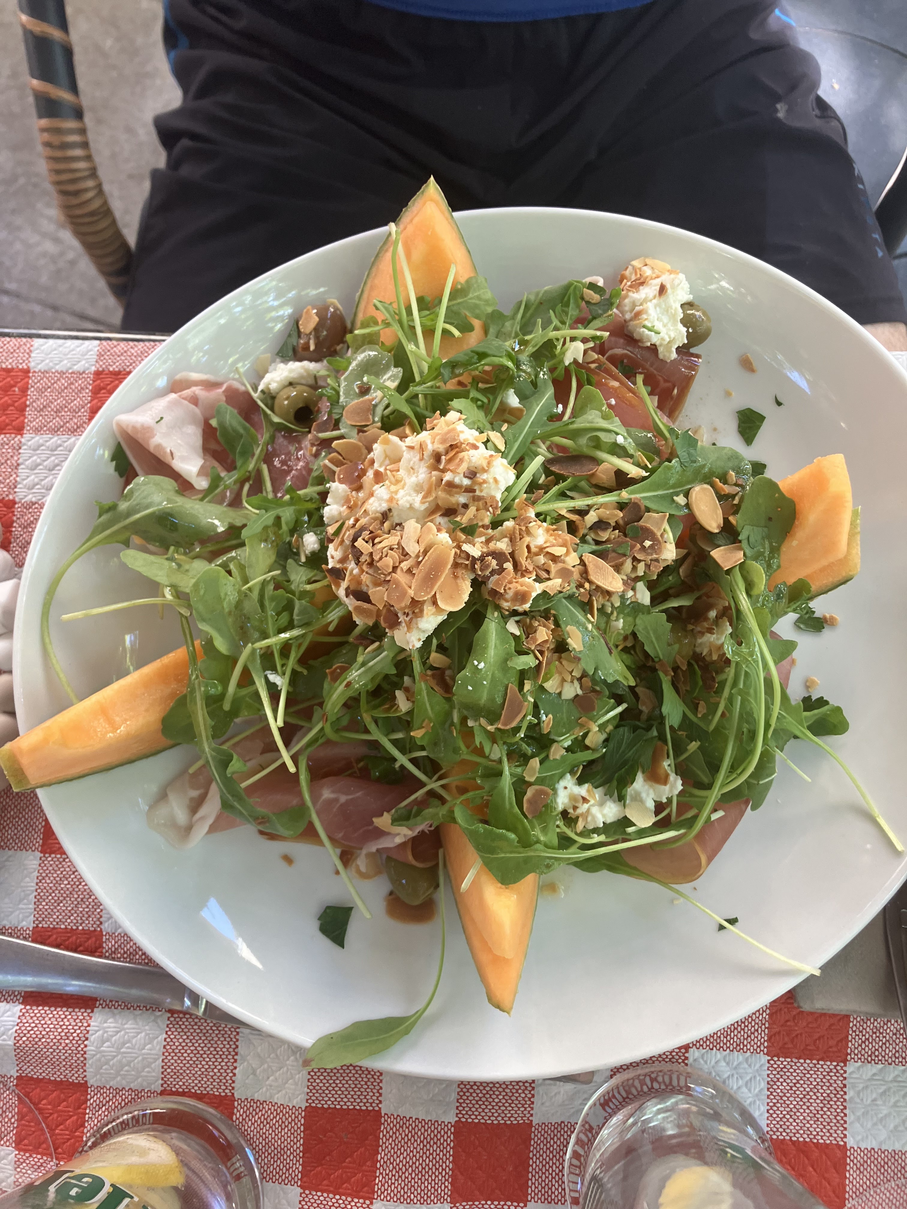 J'ai pris une salade composée , Roquette, Jambons crus , Fromage, et Melon , et des olives . Plat complet et copieux . Me suis régalée . Je vous le recommande , en plus l'accueil très sympathique . Merci à la serveuse bien gentille . Ce sont des menus à la carte . Demander pour des formules tout compris , entrée plat , dessert . Si possible .