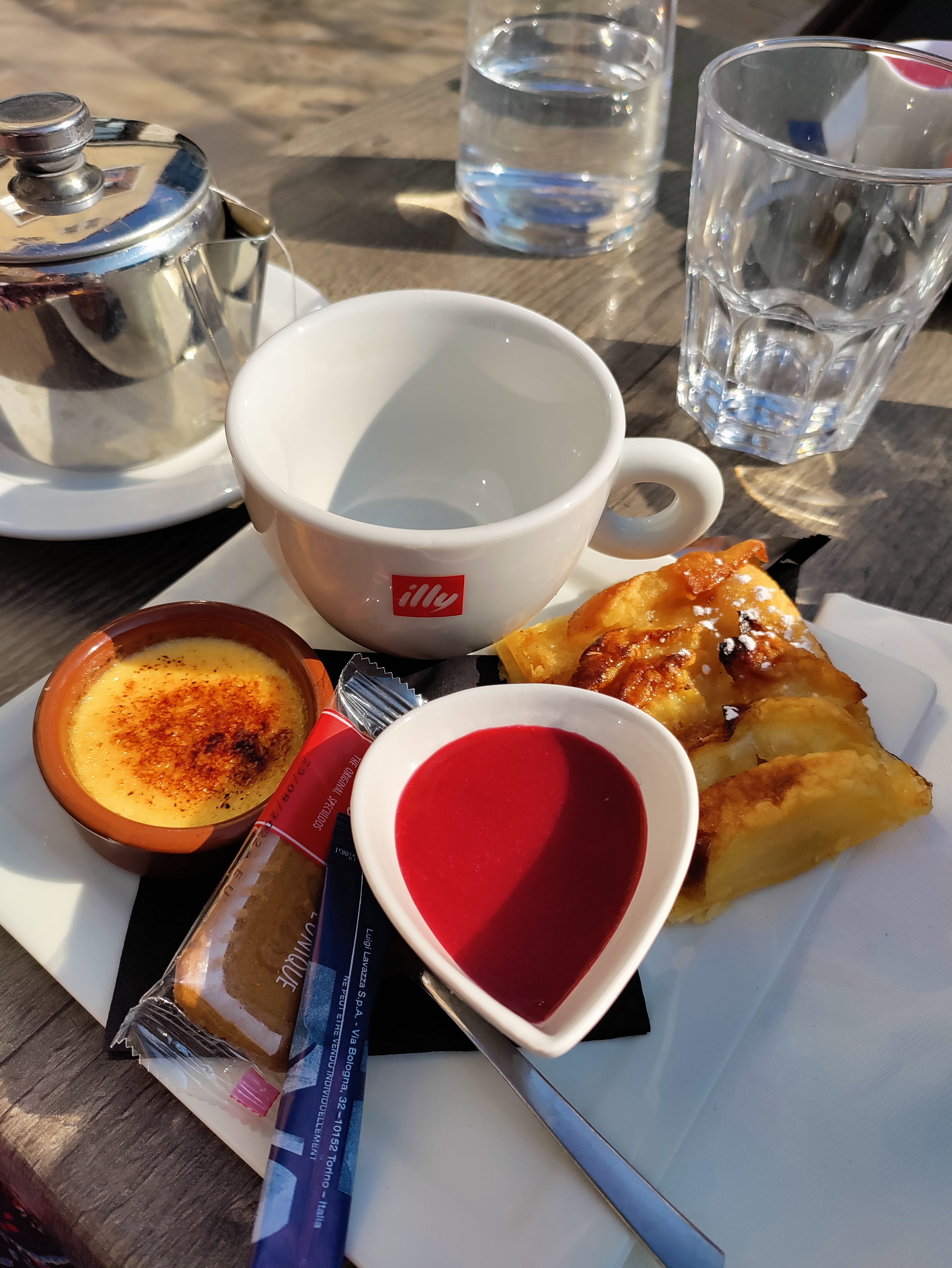 Bonnes chouquettes et bon café sur la terrasse avec une bonne exposition