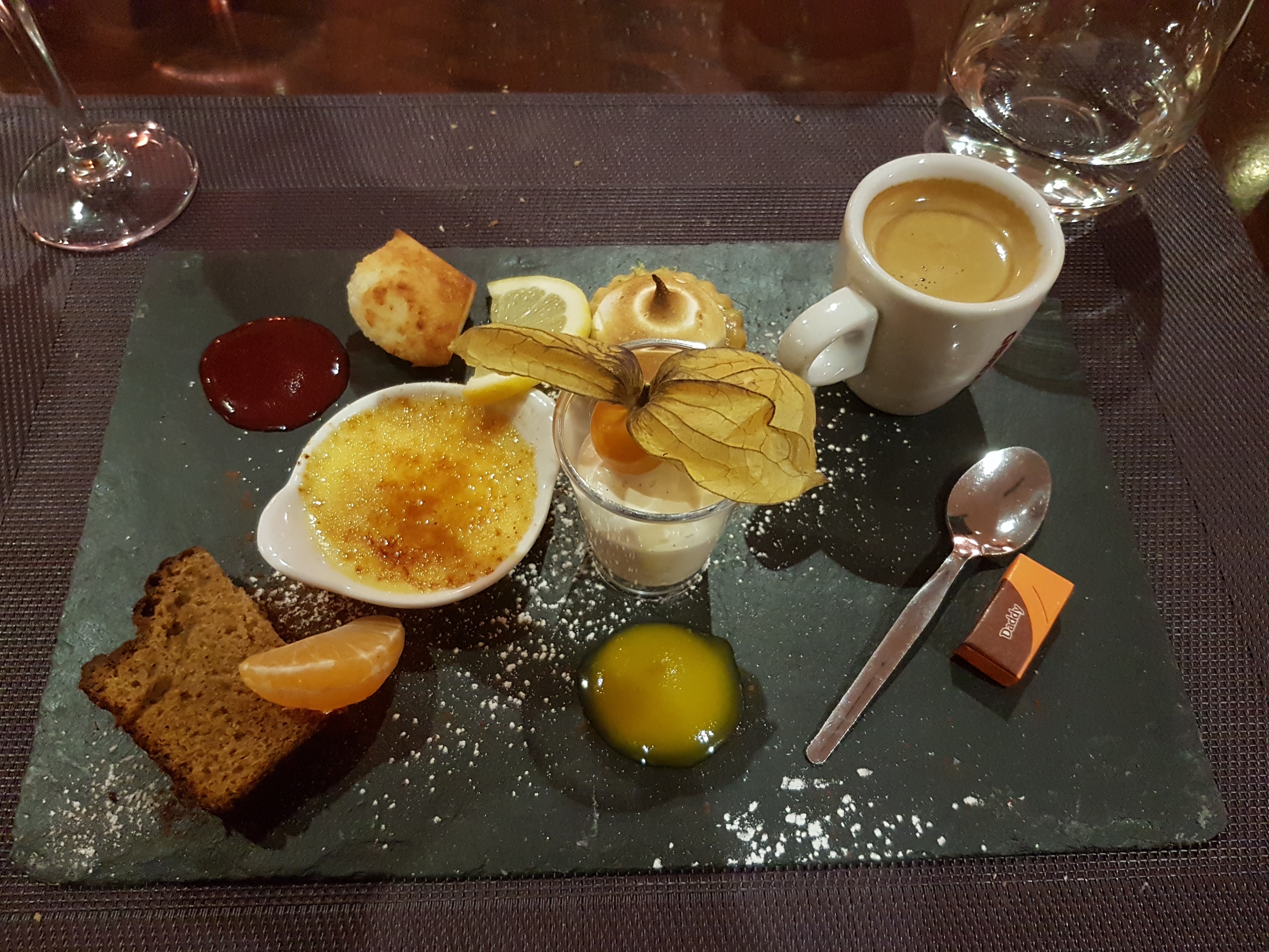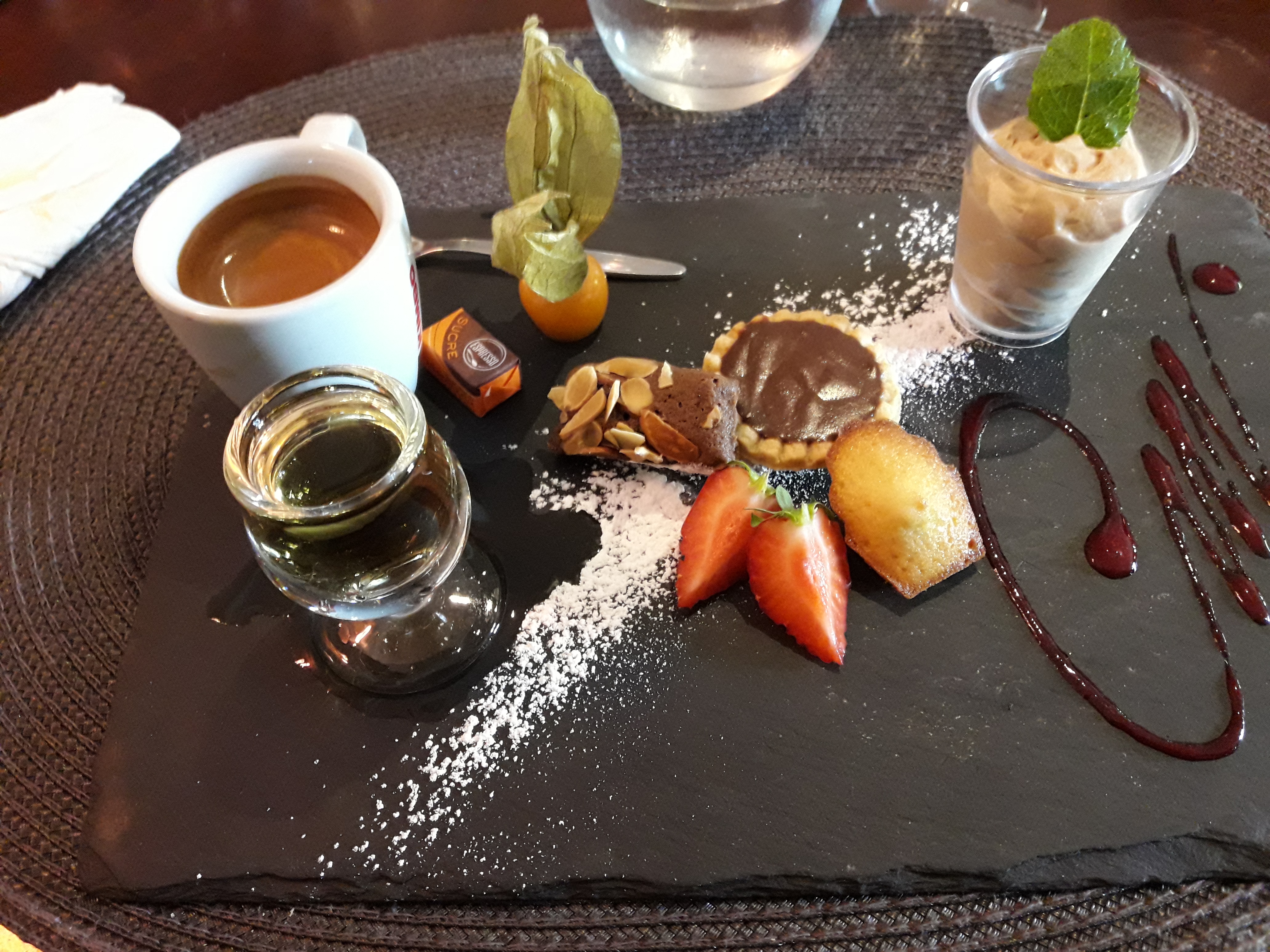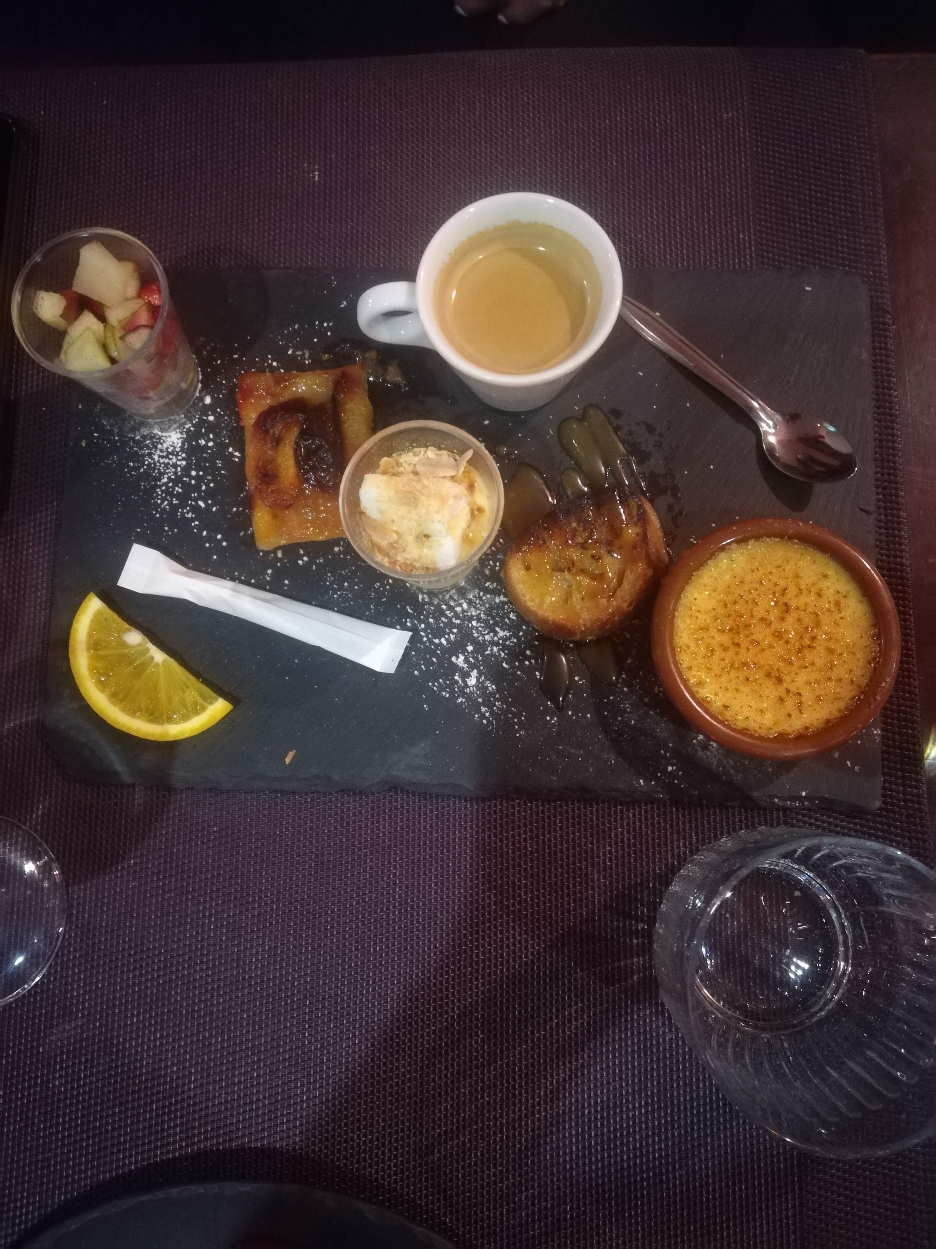 Lieu sympa plat principal très bon mais vraiment dommage pour le café gourmand vraiment NON gourmand du tout .à revoir car 2mm de crème brûlée et des biscuits très sec en pleine chaleur sans parler de la verrine de fraise si on peut appeler ça comme ça .