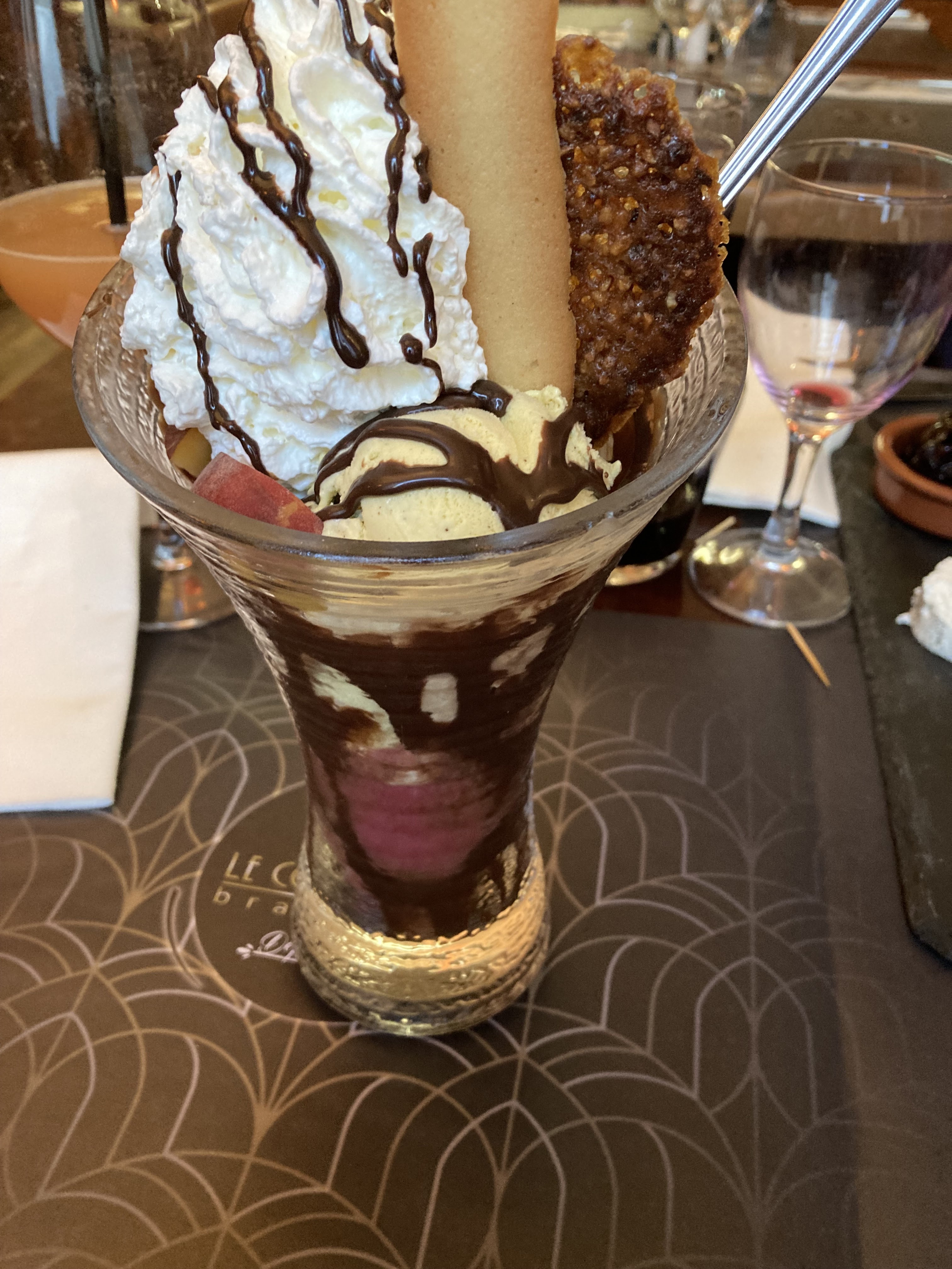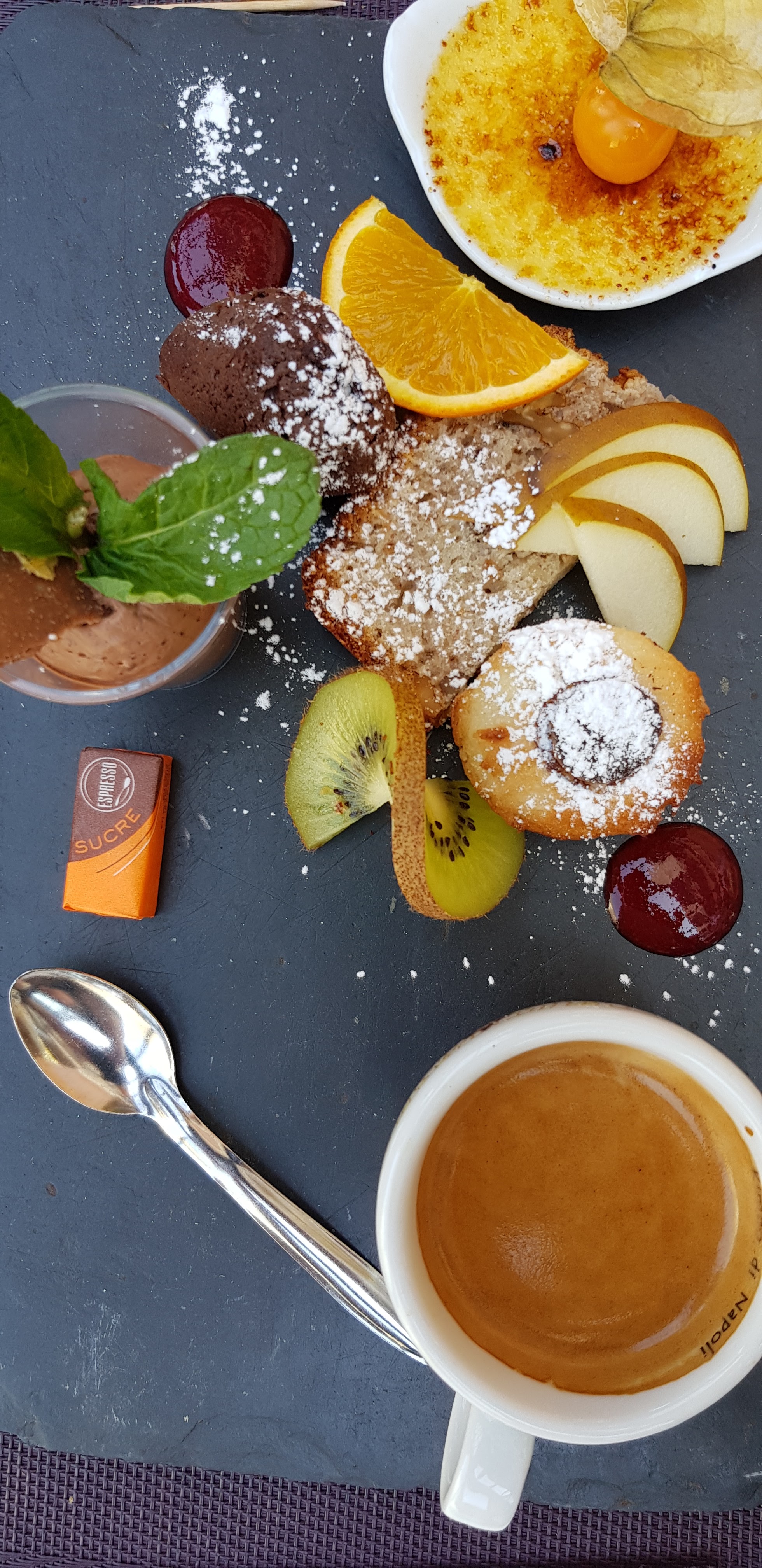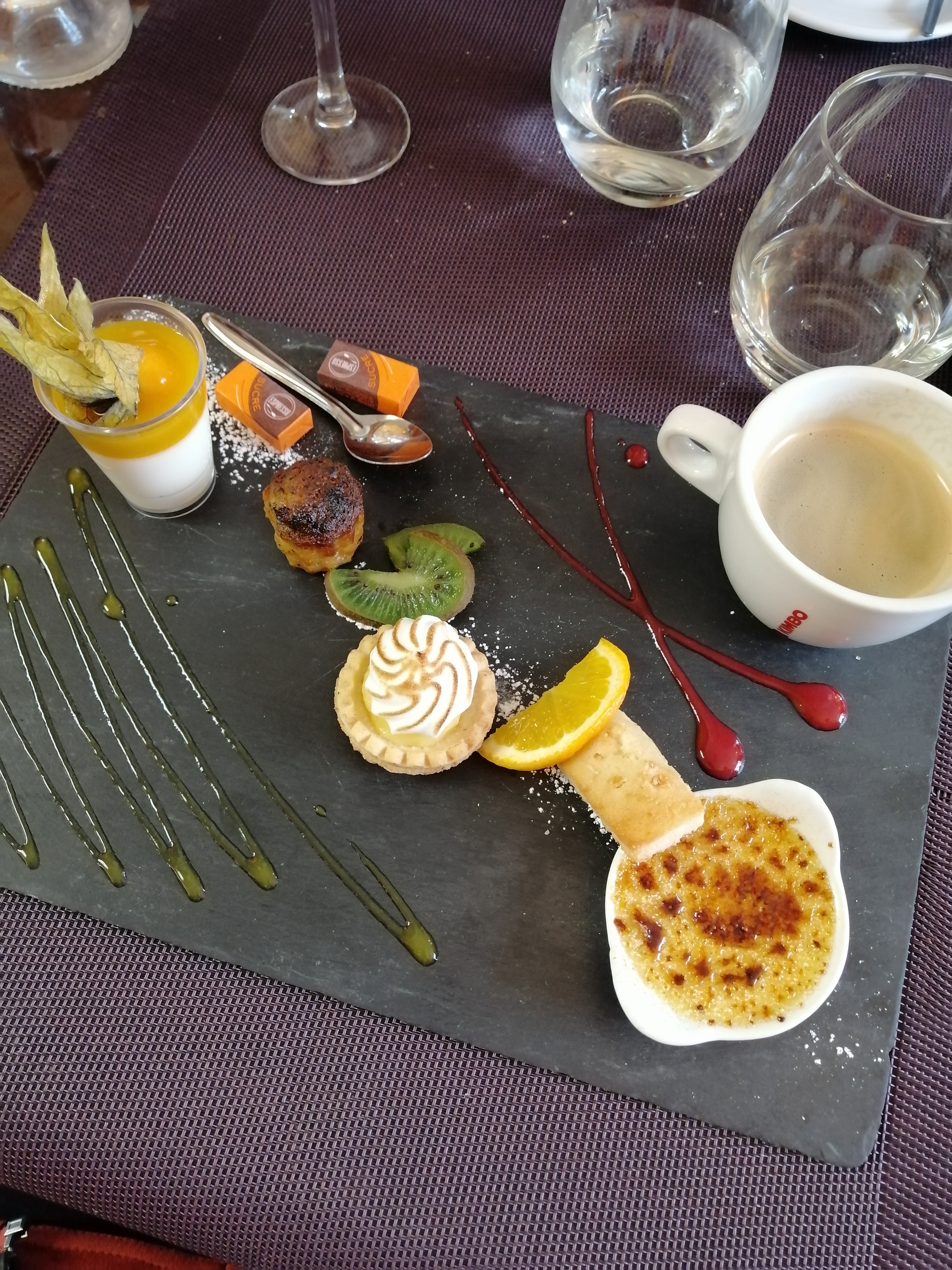 Lieu sympa plat principal très bon mais vraiment dommage pour le café gourmand vraiment NON gourmand du tout .à revoir car 2mm de crème brûlée et des biscuits très sec en pleine chaleur sans parler de la verrine de fraise si on peut appeler ça comme ça .