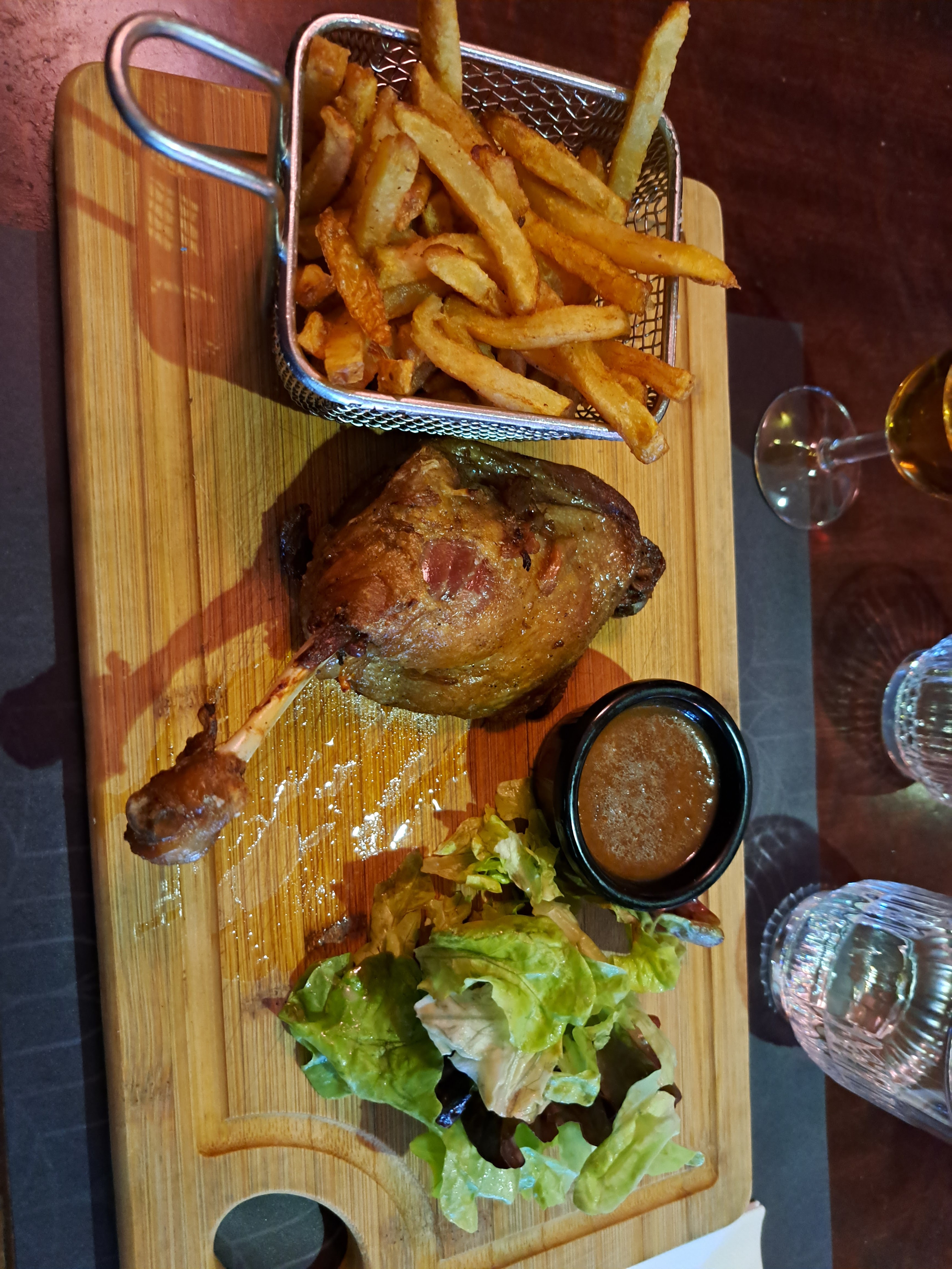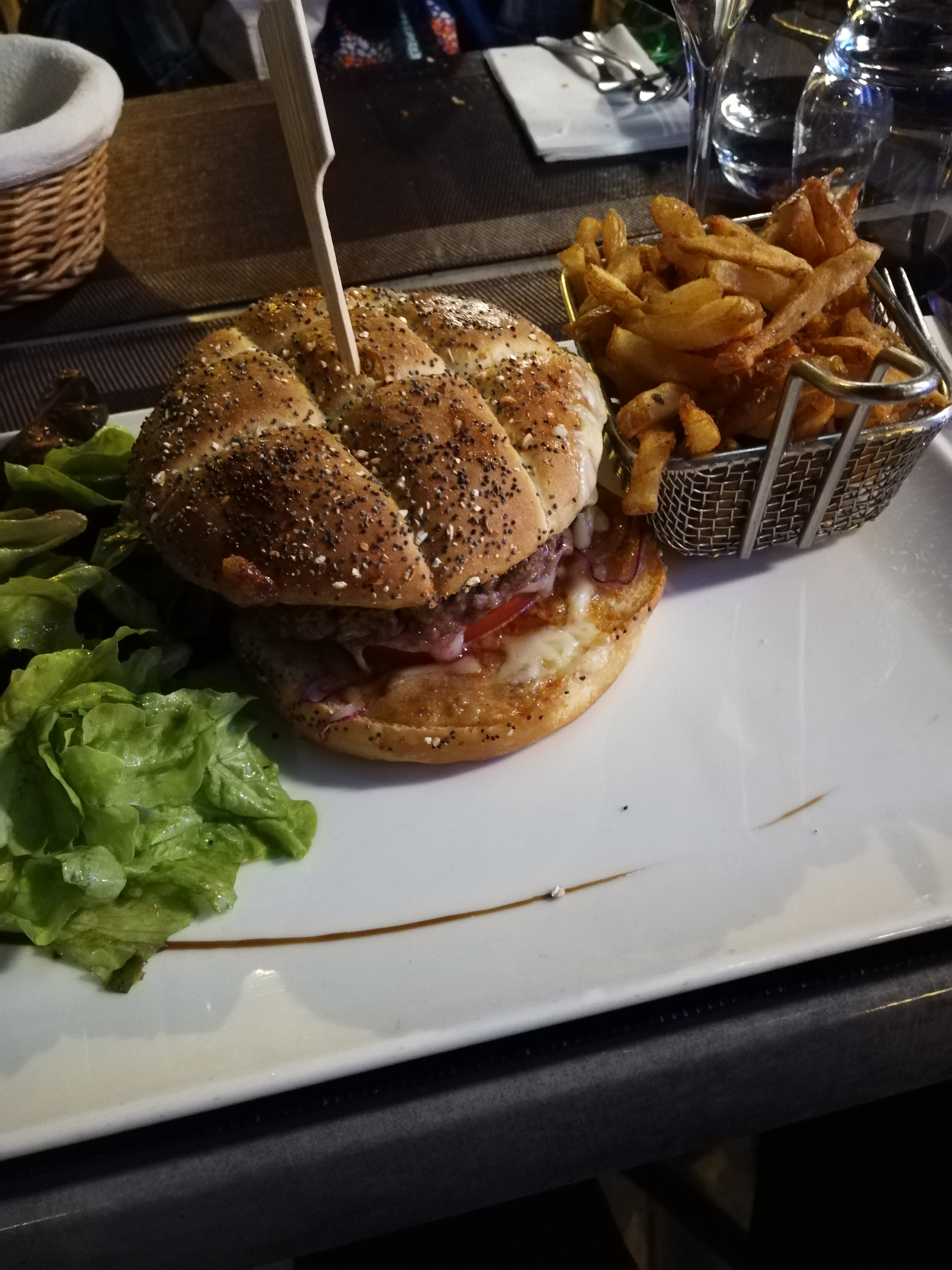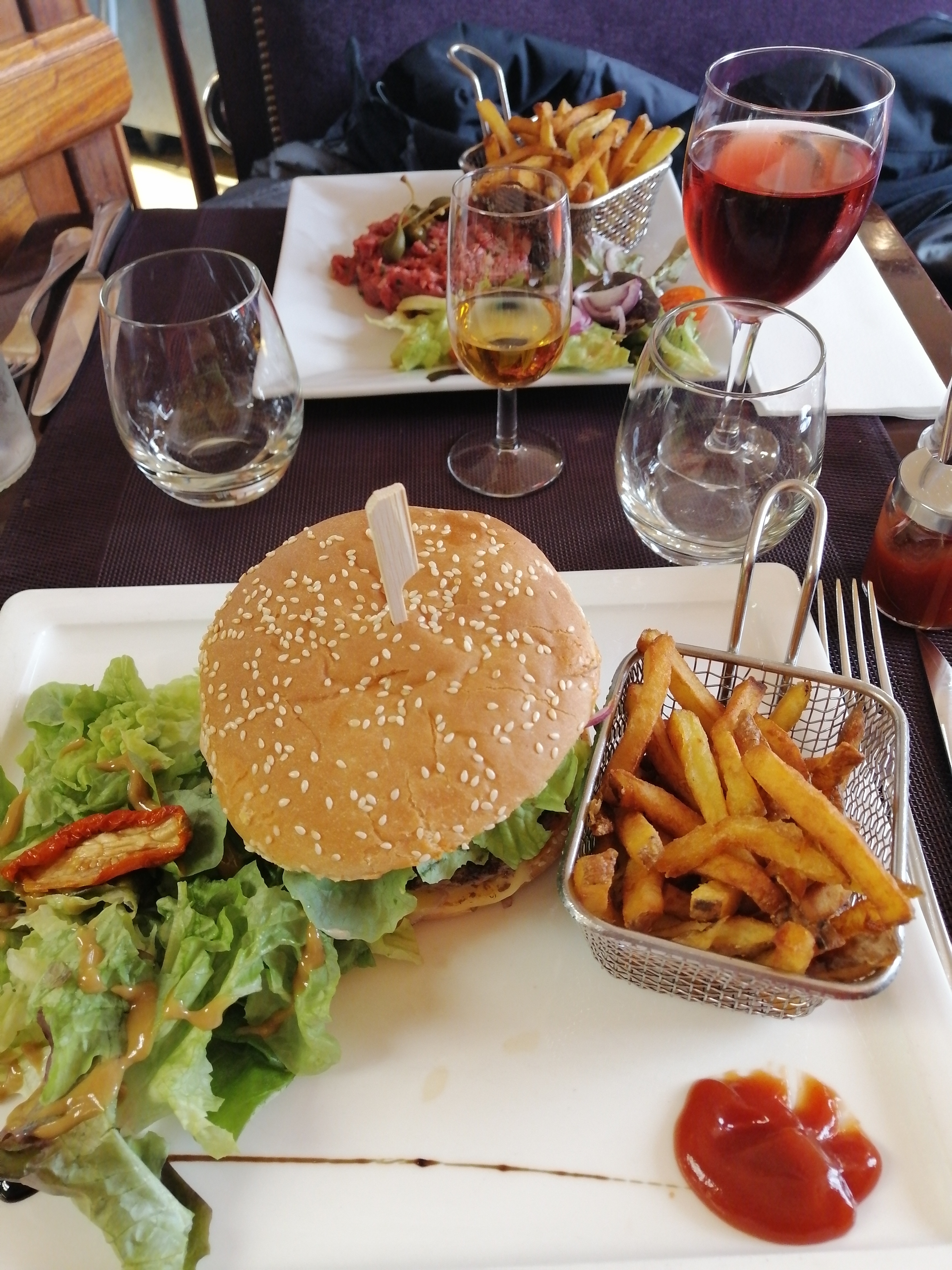 Avis mitigé Personnel très sympathique et agréable Apéro avec beaucoup de glace pilée mais pas de paille du coup j'ai attendu ça fonde pour boire mon cocktail Entrées Crevettes bonnes (mayonnaise très bonne) avec un verre blanc sec, conseillé par la serveuse avec un arrière goût d'eau mais de base je suis pas fan des blancs secs Charcuteries bonnes sans beurre ni cornichons (dommage) Burger et frites bonnes mais arrivé limite froid (Que l'on m'a réchauffé volontiers 😊) Desserts Tiramisu fraise revisité j'ai adoré le crémeux citron mais un peu trop d'écrasé de spéculos à mon goût Fondant chocolat a satisfait Plat bon mais sans plus (mon estomac n'a pas supporté quelque chose a moins cela soit dû au faite que j'ai bu la glace pilée dans mon cocktail) Total 69€ (je n'ai pas vérifié le ticket)