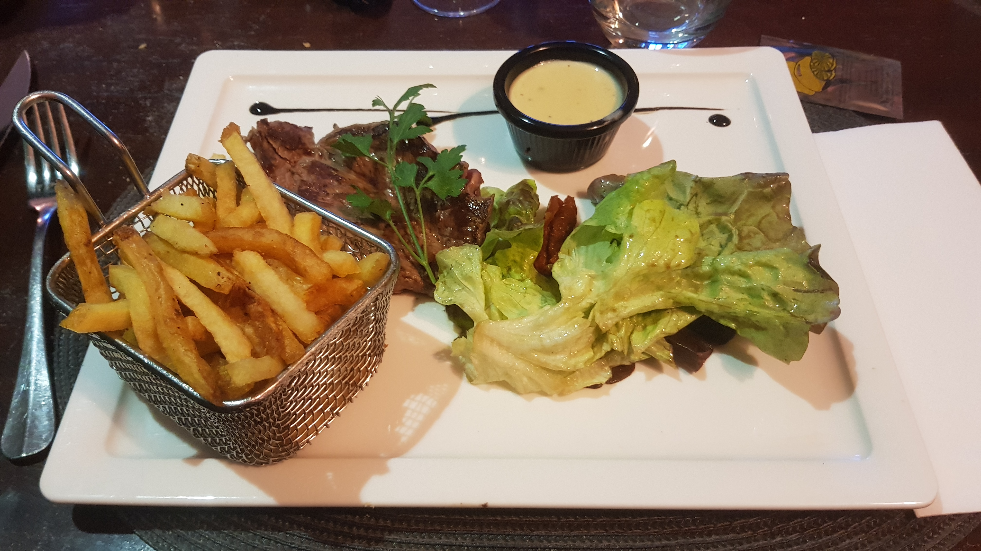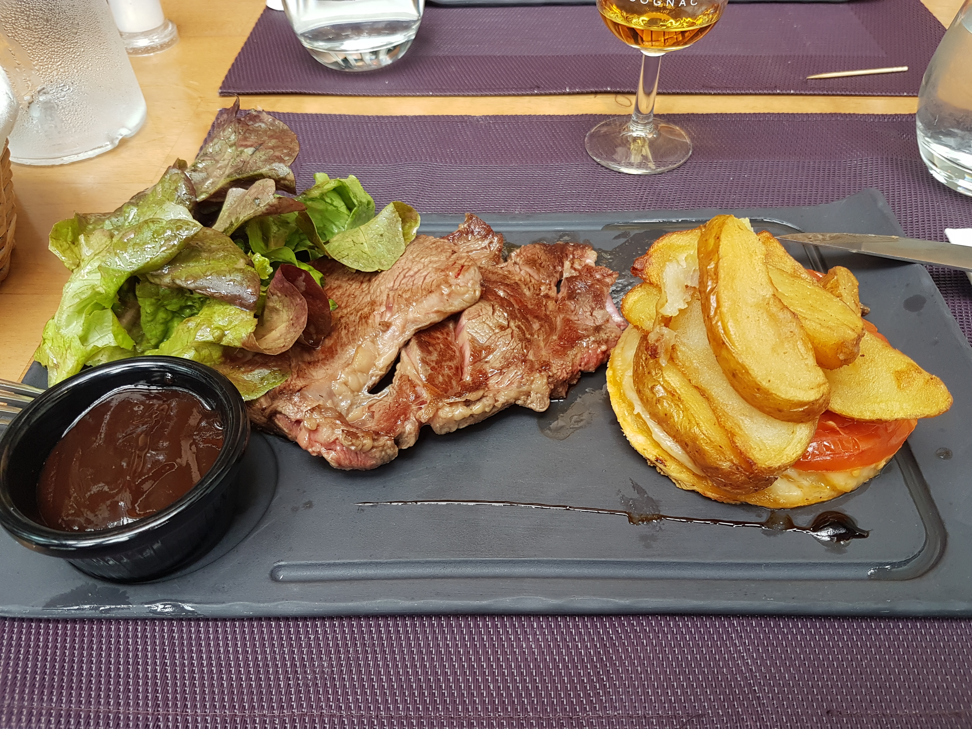 Attention ne venez pas en tenue décontracté dans ce restaurant car tout de suite les serveur vous le font bien ressentir, kir pas frais,salade césar manque de sauce et plus de salade que d autre ingrédients, les olive pas fraîche, la viande était correcte,donc si vous venez à cognac pour une compétition ou autre n oublie pas de venir bien habillé dans ce restaurant.