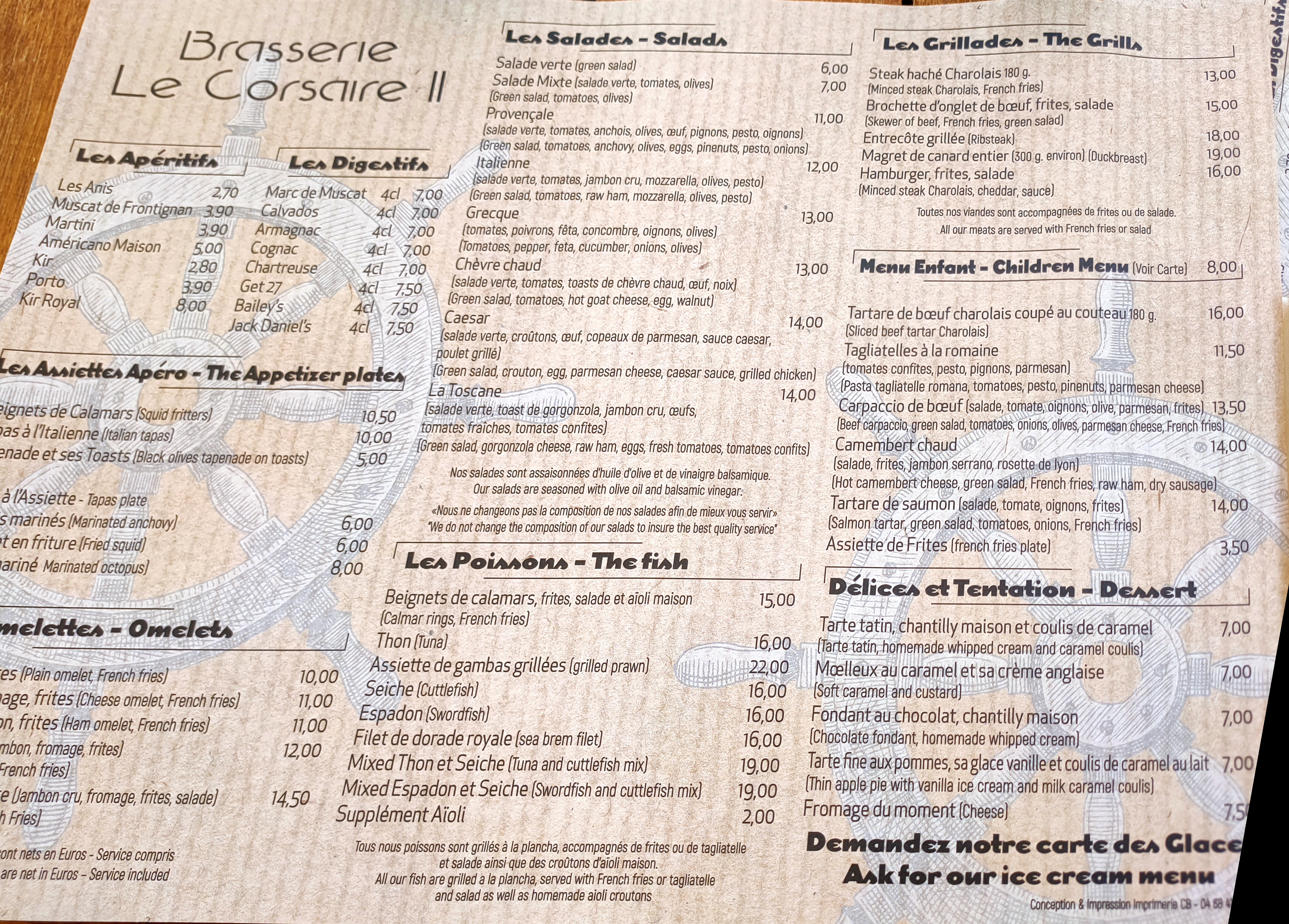 Nous séjournons depuis 15 ans régulièrement dans le quartier des Quilles, le Corsaire est un lieu incontournable pour nous . Situé à 2 minutes de la plage, en face du port il est agréable d'y boire un verre, manger une glace.,ou prendre un repas. La carte est copieuse en choix , il y en a pour tous les goûts. Le rapport qualité prix est excellent. Les Patrons et L'équipe en place sont à l'image de leurs accents qui chantent agréables, souriants , accueillants, et qui s'adaptent et sont à l'écoute du client.. La clientèle, est aussi bien touristique, que locale et nous constatons le même accueil pour tous. Nous recommandons le Corsaire.
