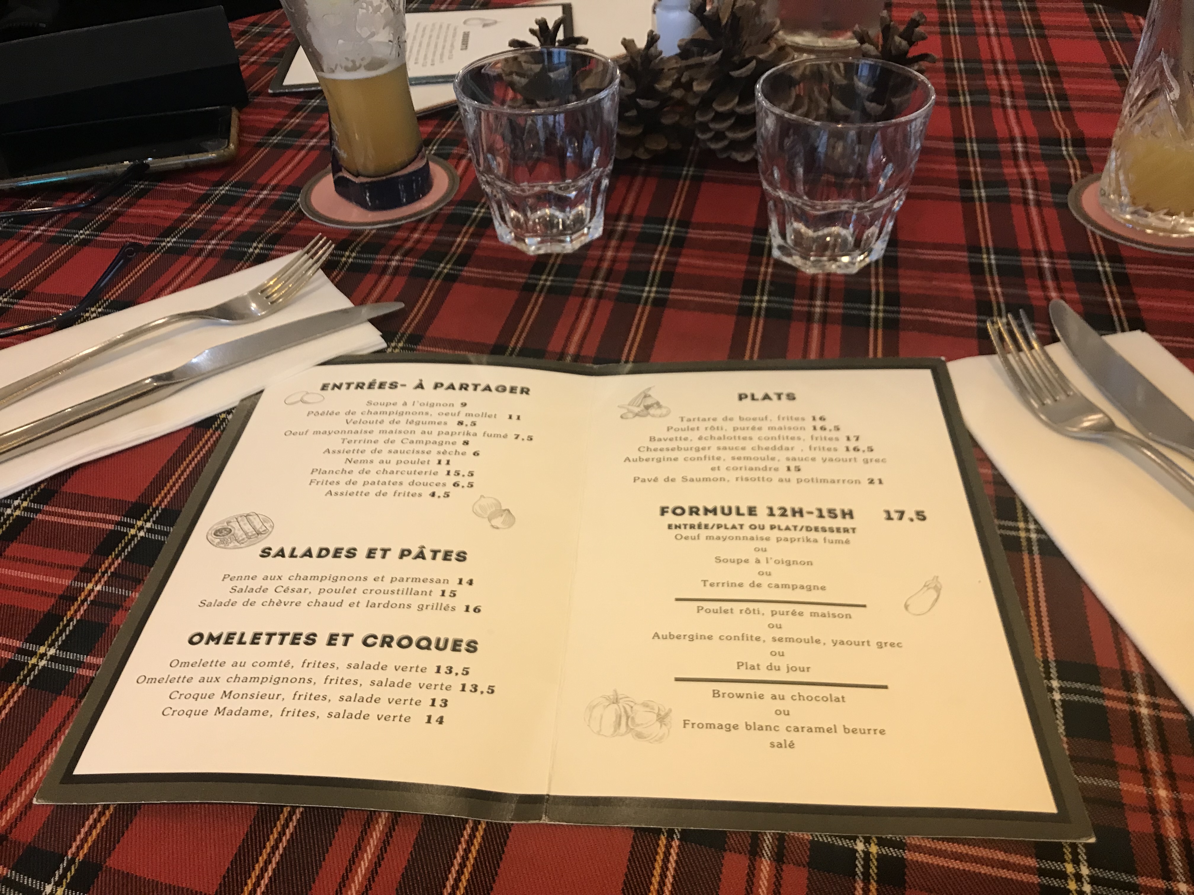 Bon rapport qualité prix 10,5 le croque monsieur avec frite et salade assez copieux par contre je n ai pas vraiment apprécié le dessert dommage serveur super serviable et à l écoute de ses clients ambiance agréable avec une grande télévision pour les matchs de foot Ils font aussi du happy hour !