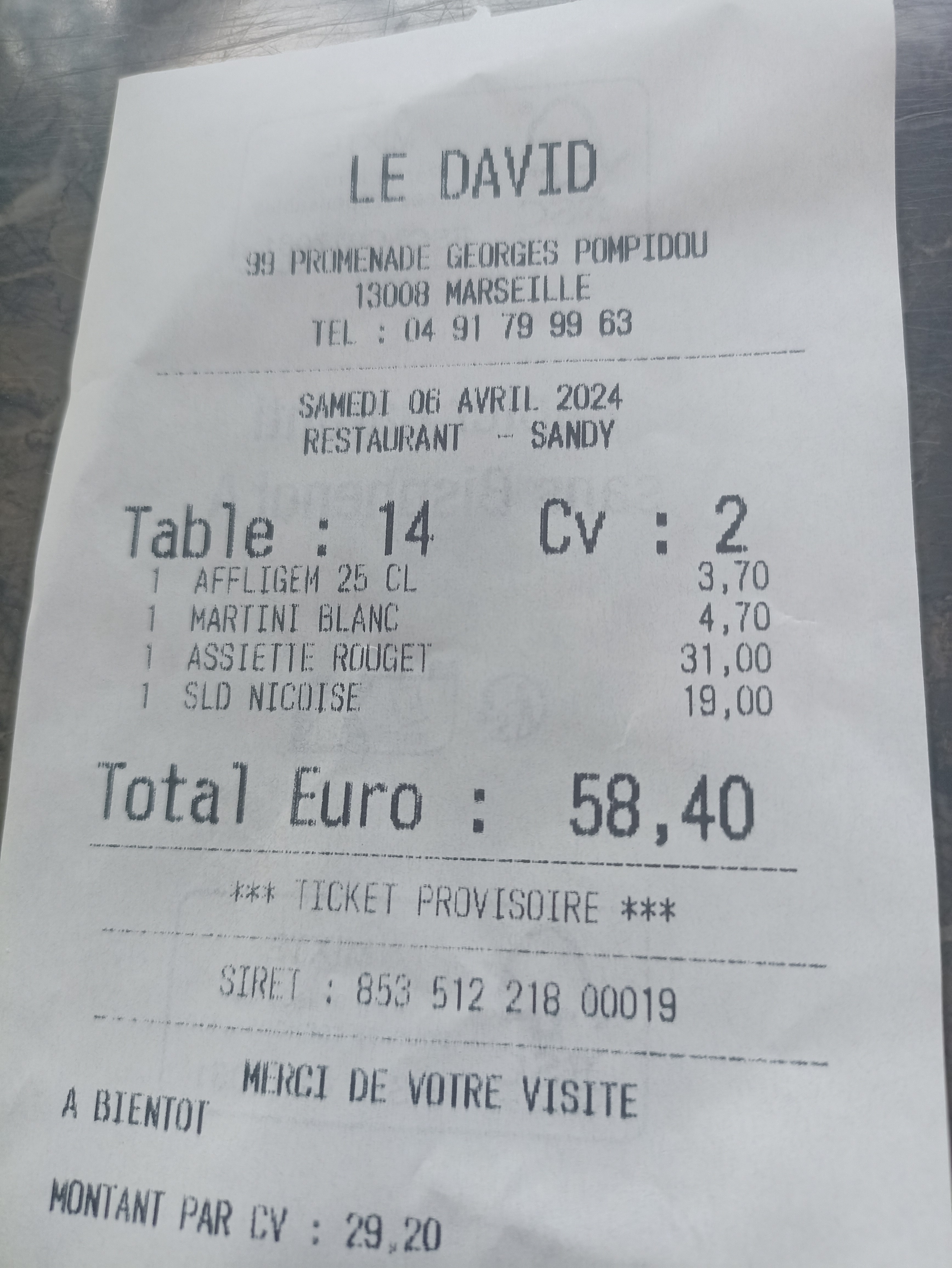 Le David est une institution marseillaise. J'y vais depuis 35 ans ! Bien sûr, il y a eu des changements de propriétaires, et l'âme première n'y est plus. Cependant, le personnel est compétent, et c'est toujours agréable d'y aller.