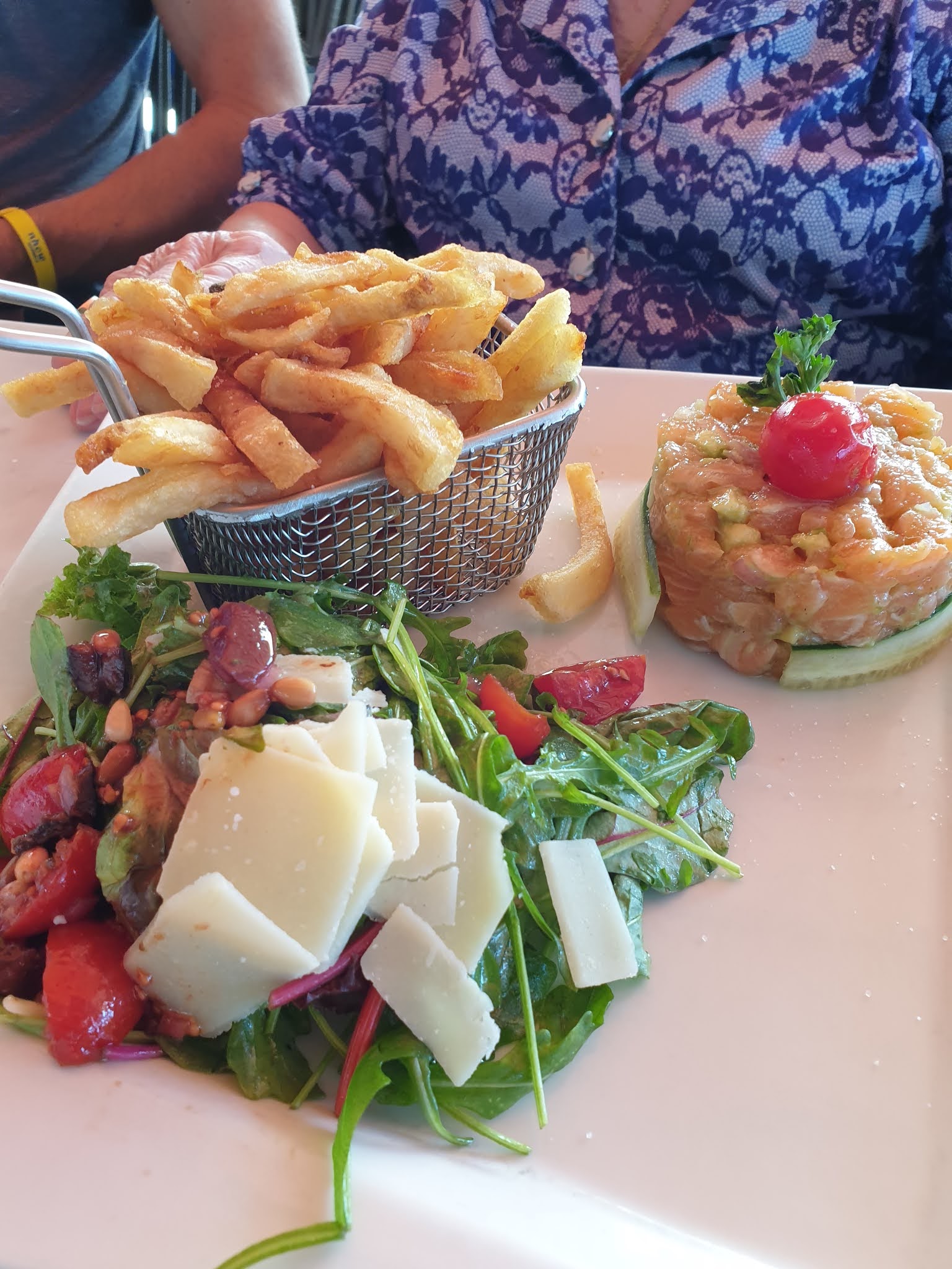 Arrivés sur place, choix entre l'intérieur climatisé ou l'extérieur abrité du soleil. Le choix se porte sur l'extérieur. Les serveurs sont sympas, souriants, à l'écoute, réactifs. La brasserie est propre et le service rapide. Les prix sont très corrects. Les plats sont copieux, bons et la marchandise fraîche. Les photos : 1/ César de saumon (sauce César, saumon fumé, tomates, salade verte croquante et croûtons de pain) 2/ Tartare de bœuf avec panier de frites et mélange de salades, tomates 3/ Poke Bawl de saumon (sauce, saumon, avocat, chou rouge, salade verte croquante) 4/ Tartare de saumon avec panier de frites et mélange de salades, tomates 5/ Café gourmand (très gourmand) ! Parking en face de la brasserie. Je recommande !