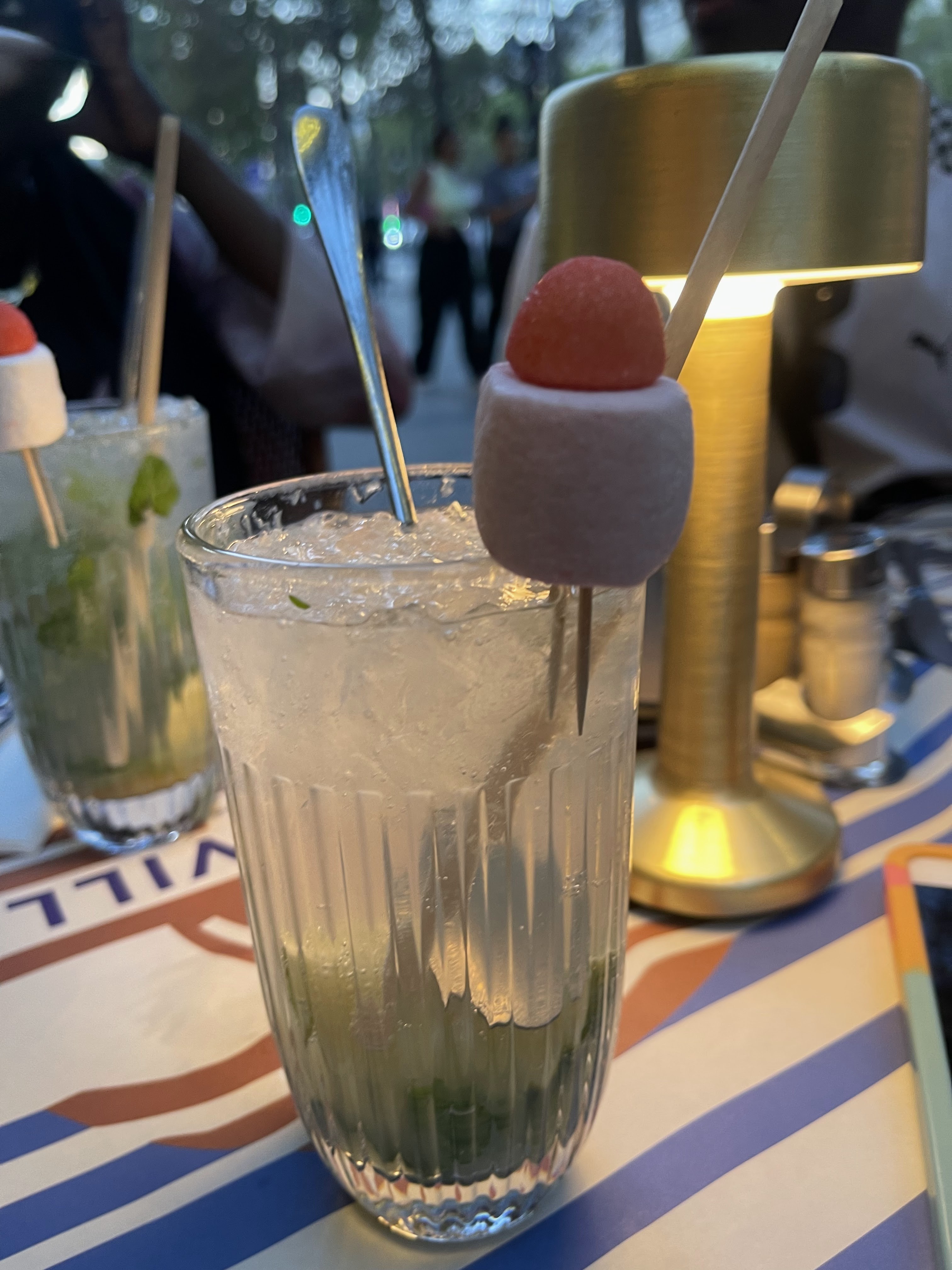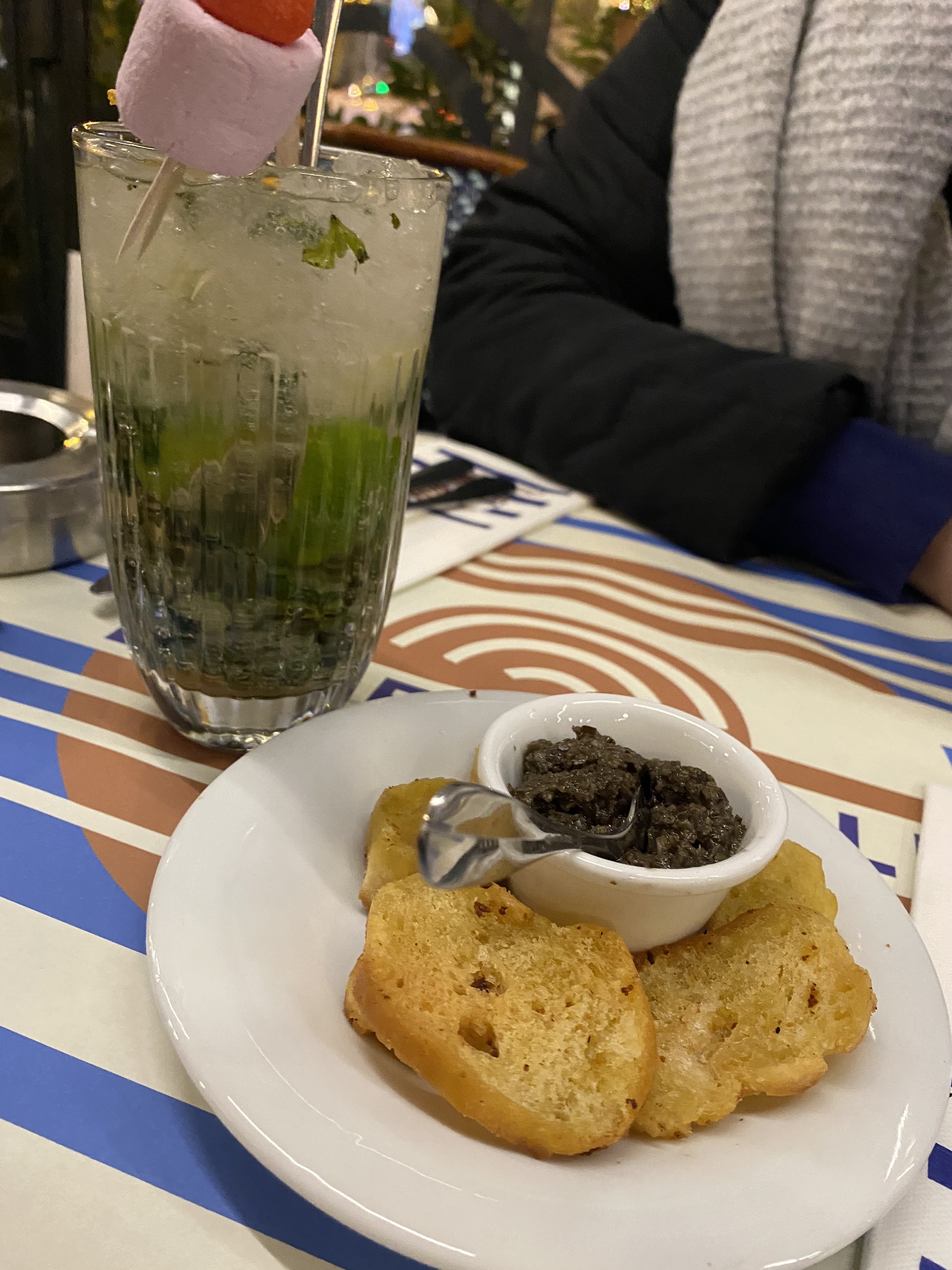 Nous sommes allés boire un verre le soir. Le temps était venteux et froid, mais le balcon était chaud et confortable. Il n’y avait peut-être pas beaucoup de monde parce que c’était en semaine et que le personnel était sympathique. Nous avons commandé du Negroni, savoureux et bien conçu. Le prix était un peu cher, mais la boisson en valait la peine.