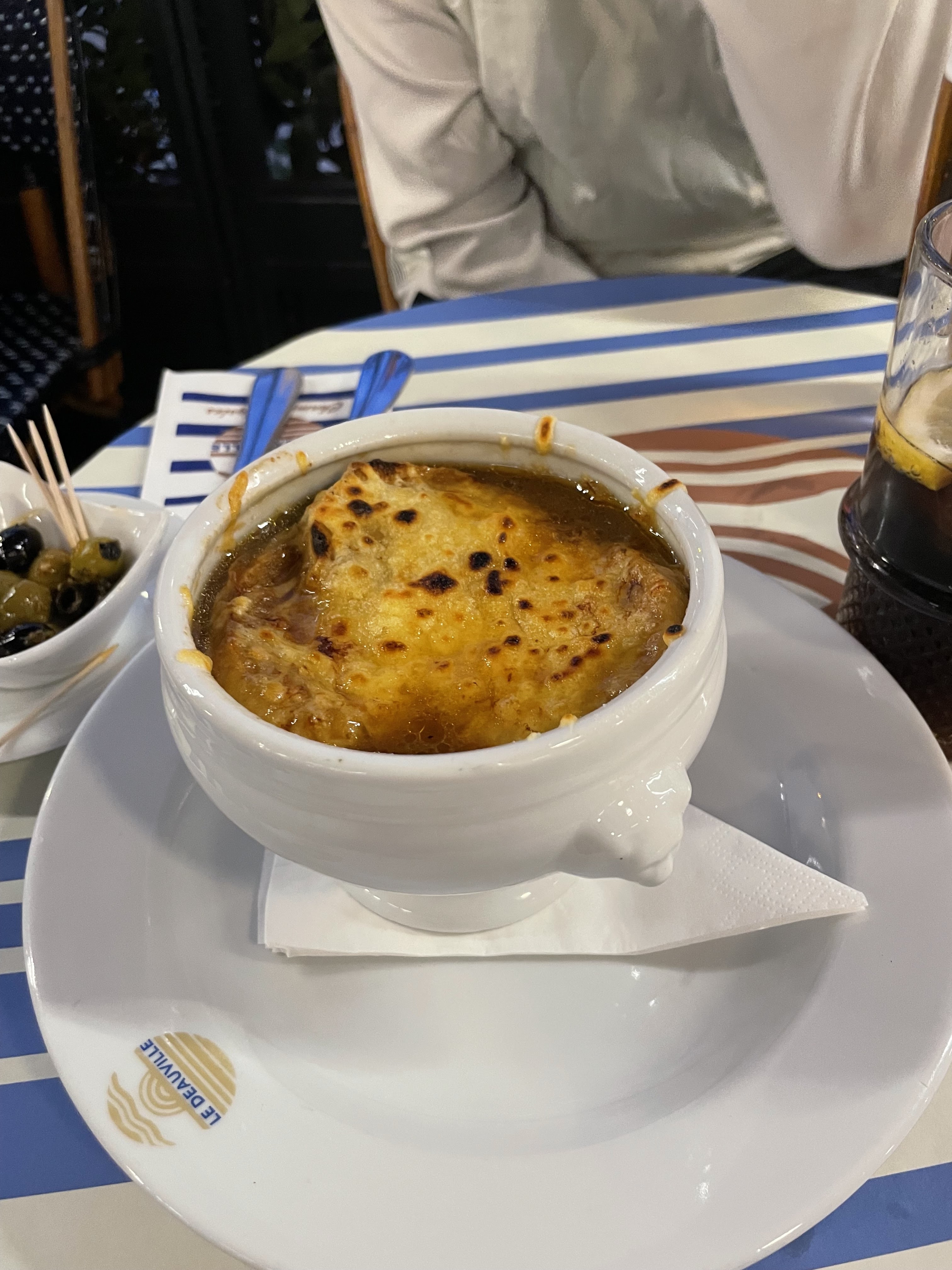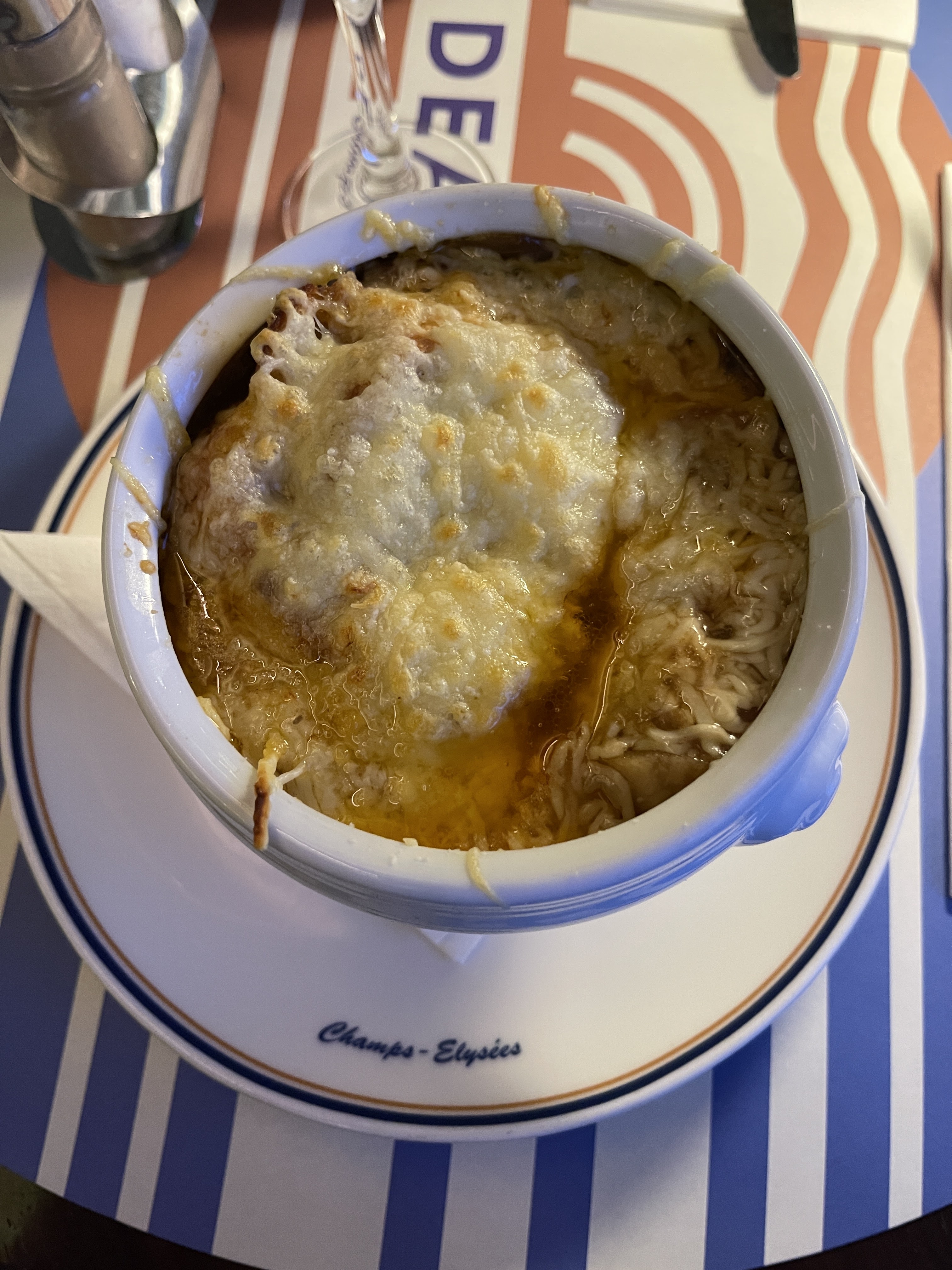 Nous nous sommes arrêtés pour une collation un jour de pluie. Le chocolat chaud avec de l'alcool était incroyable (honnêtement, je ne pourrais pas le reproduire si j'essayais). La soupe à l'oignon était bonne aussi !