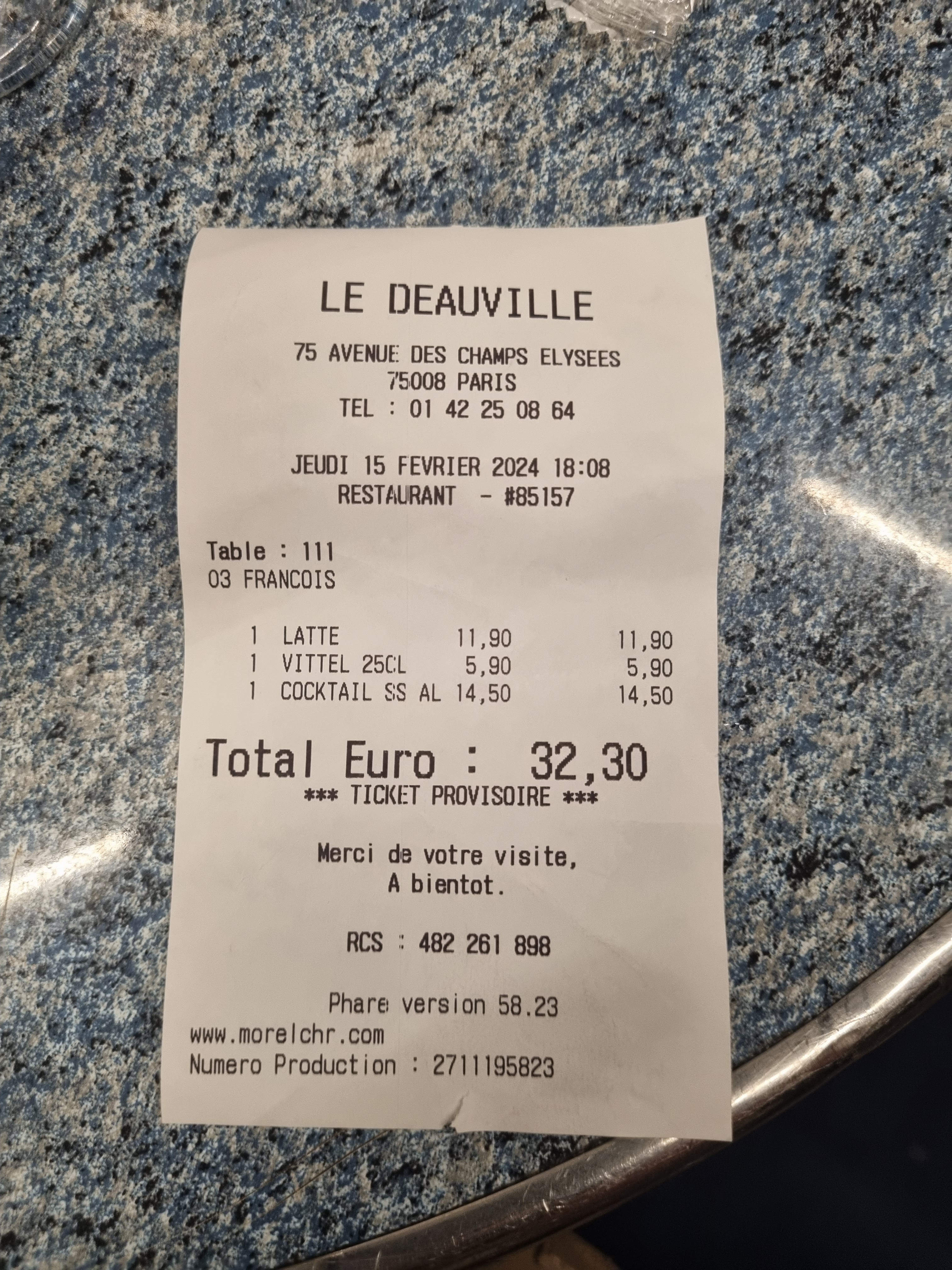 Avec nos amis nous nous sommes arrêté pour prendre un verre. On se prend la remarque ah et le monsieur ne prend rien? Je vous ai pourtant ma meilleure table! ... je sais qu'on est à Paris champs élysée... mais pour autant si on dépense pas 50 euros pour boire un verre on est pas assez bien? Si mon ami n'avait pas soif je dois l'obliger à boire? De plus pour sameilleure table elle n'était pas nettoyée correctement et nous nous sommes retrouvés avec tous les vêtements salis par de la diarrhée de pigeon étalé sur les cotés de la table... je sais pas si c'est normal sur Paris mais pas chez nous, habitant pourtant un endroit touristique sur la Côte d'Azur... et puis bon le sourire est bien évidemment inexistant. Bref... j'ai pas les mots 😂 continuez comme ça 👏🏻