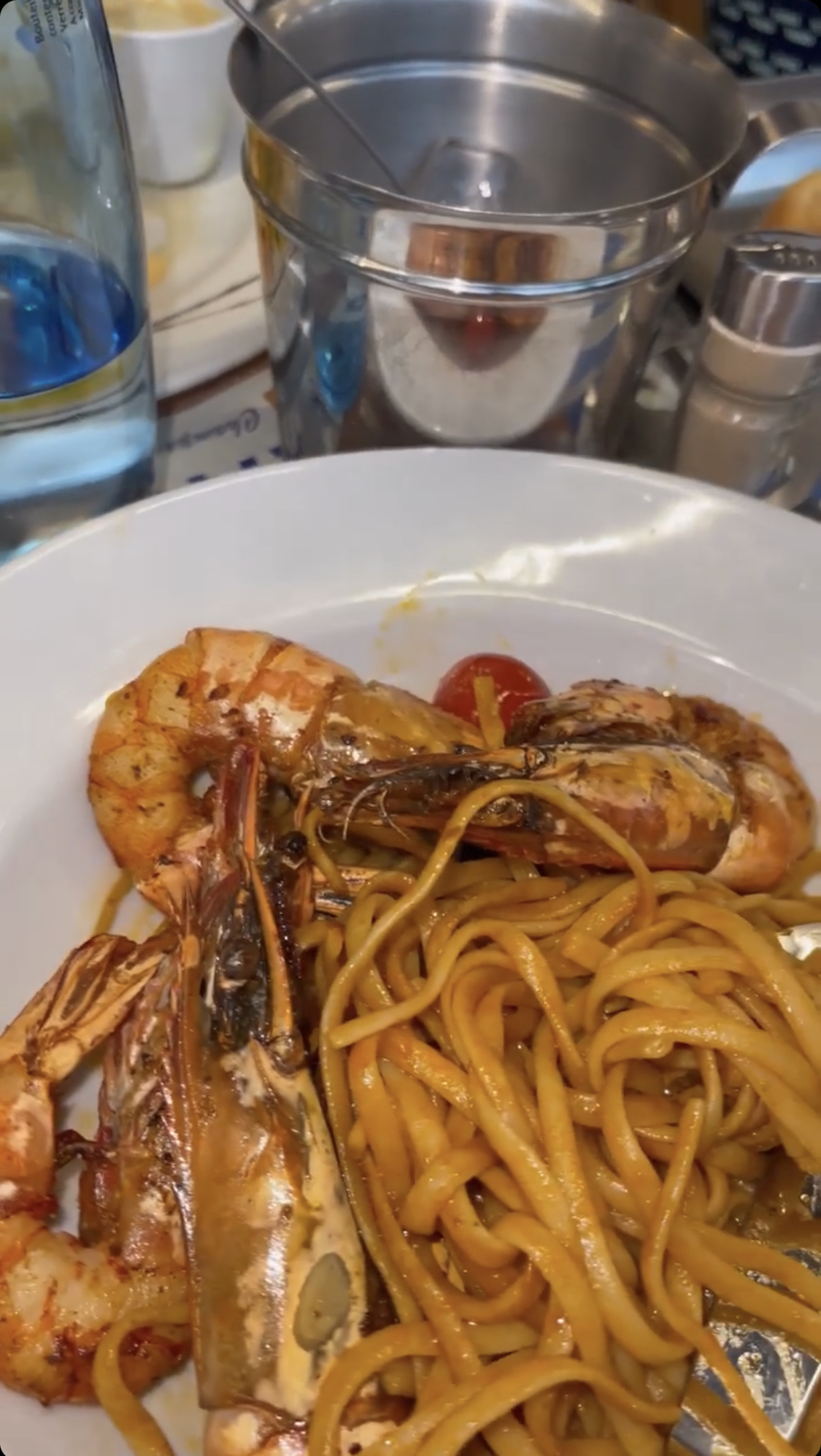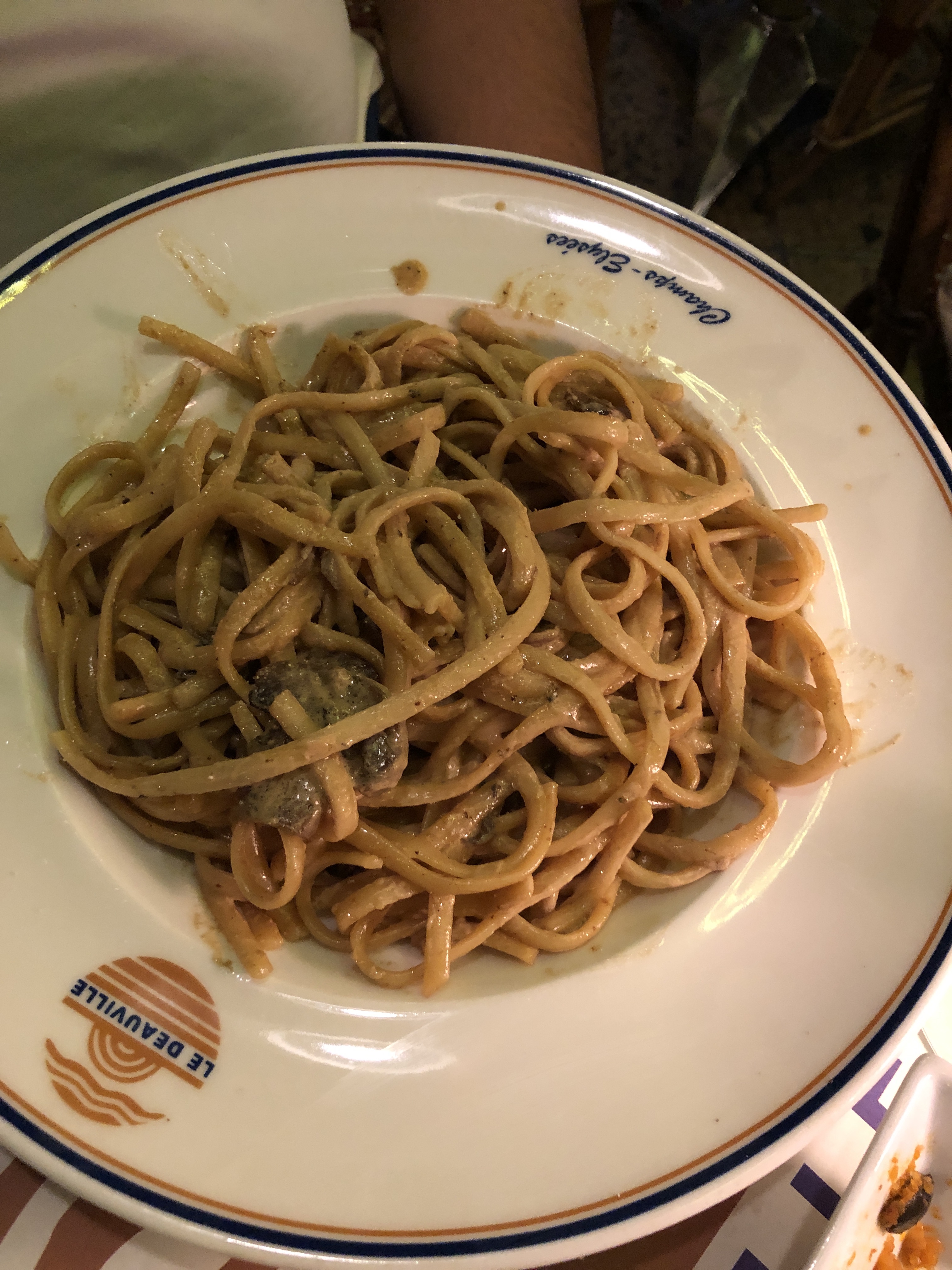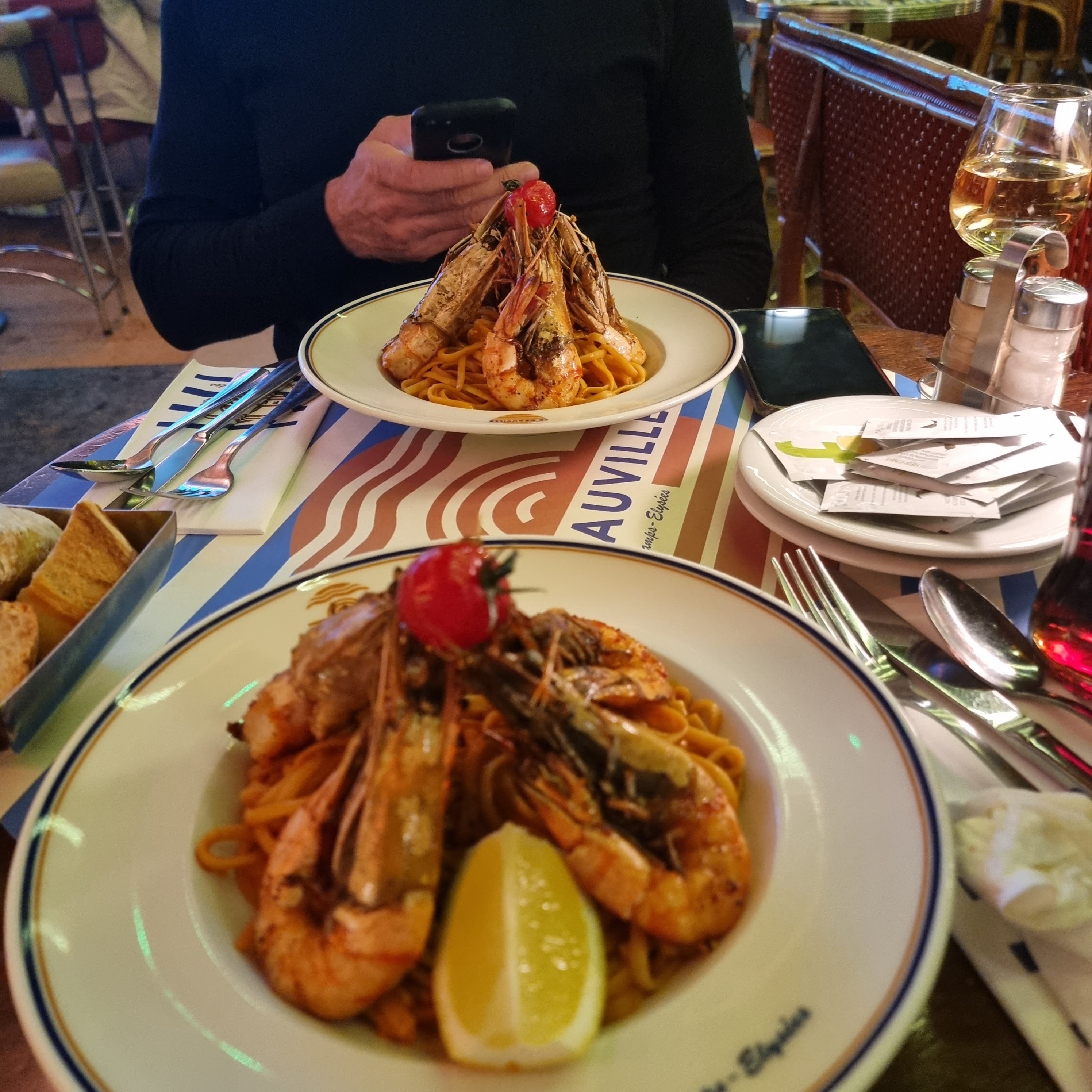 Le plat n’était vraiment pas mal, (des pates aux crevettes ) mais c’est surtout les crêpes qui sont délicieuses ! Des Crêpes ultra tendres au caramel beurre sallé et boule de glace vanille 😍 Juste très très dommage que à l’extérieure, il n’y ait pas de quoi fumeur car manger et se prendre des odeurs de tabac et autres dans la face peu vite gâcher l’appetit…