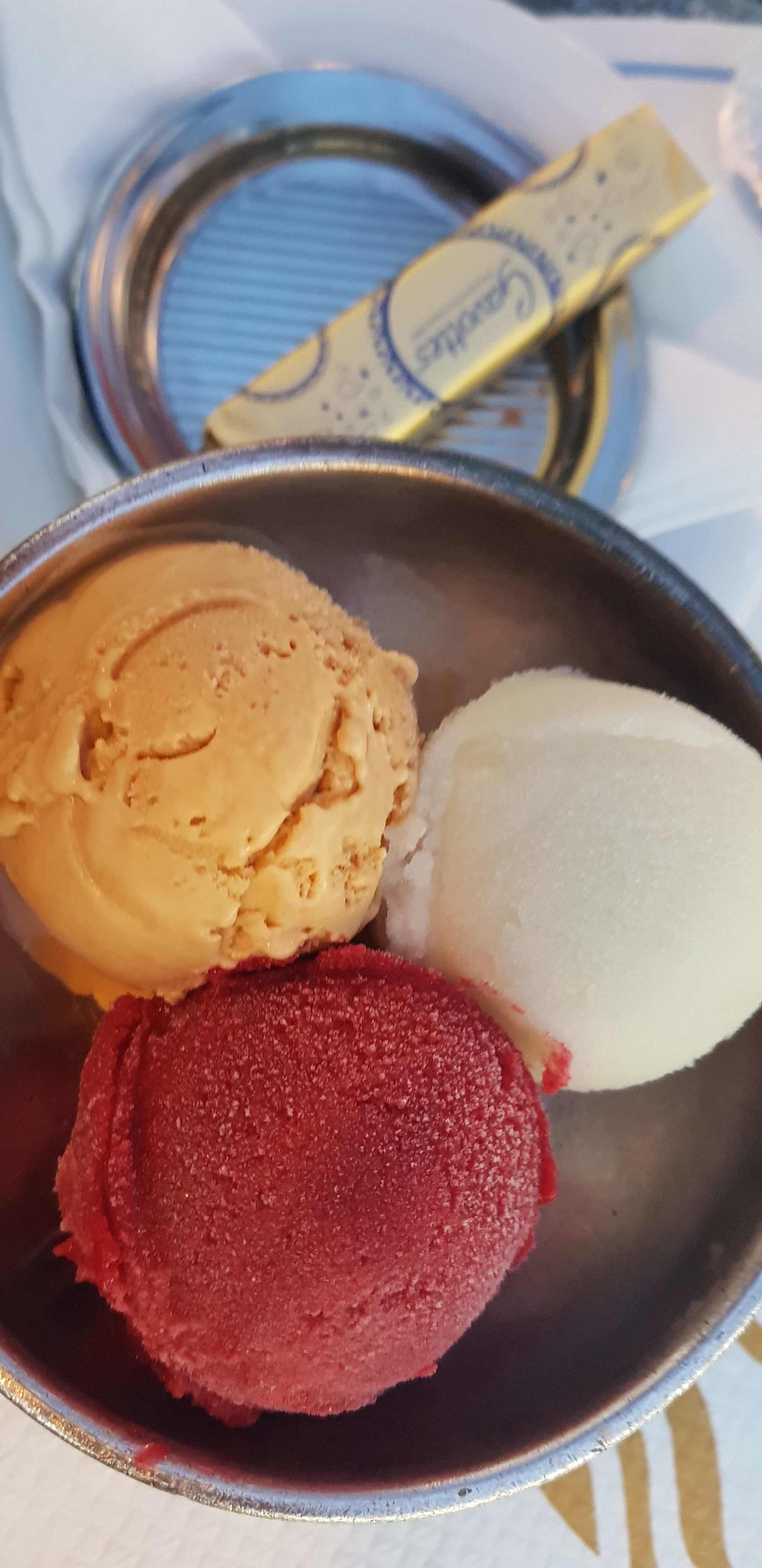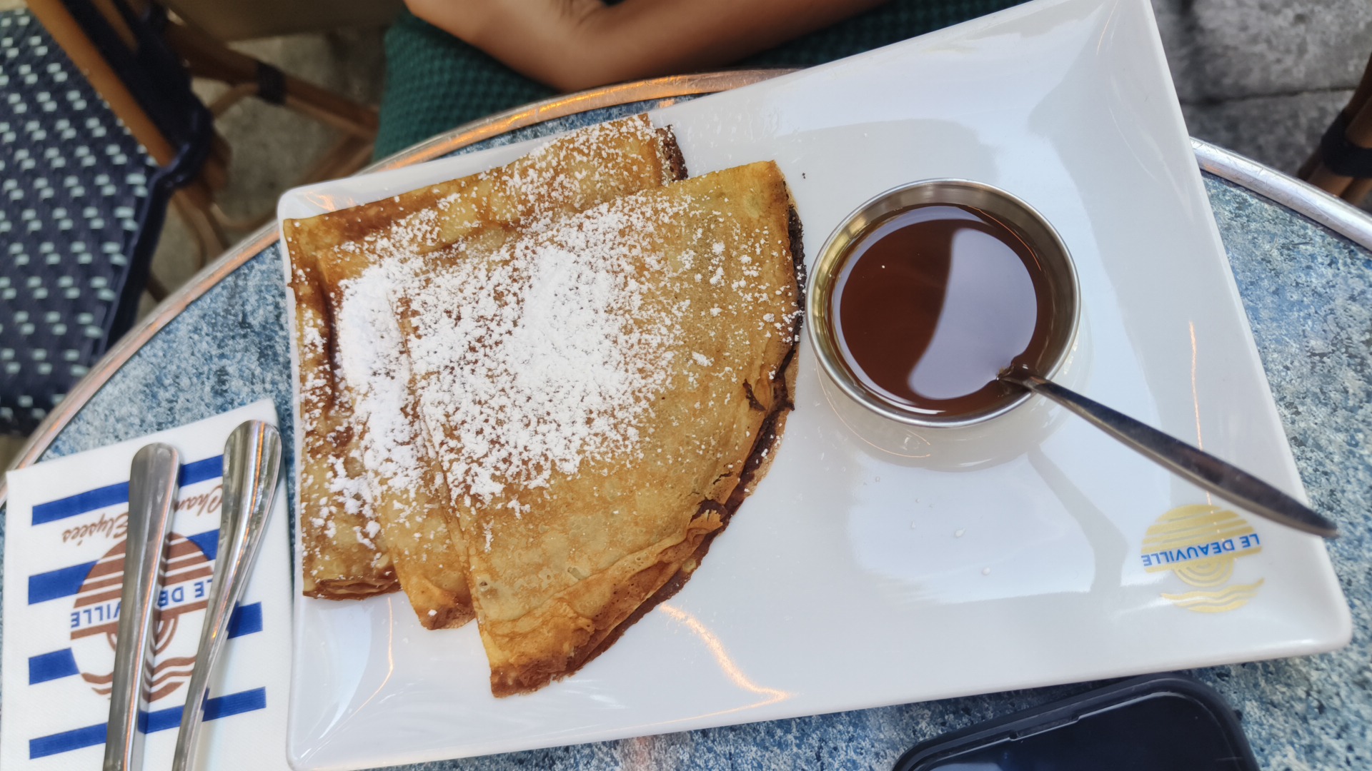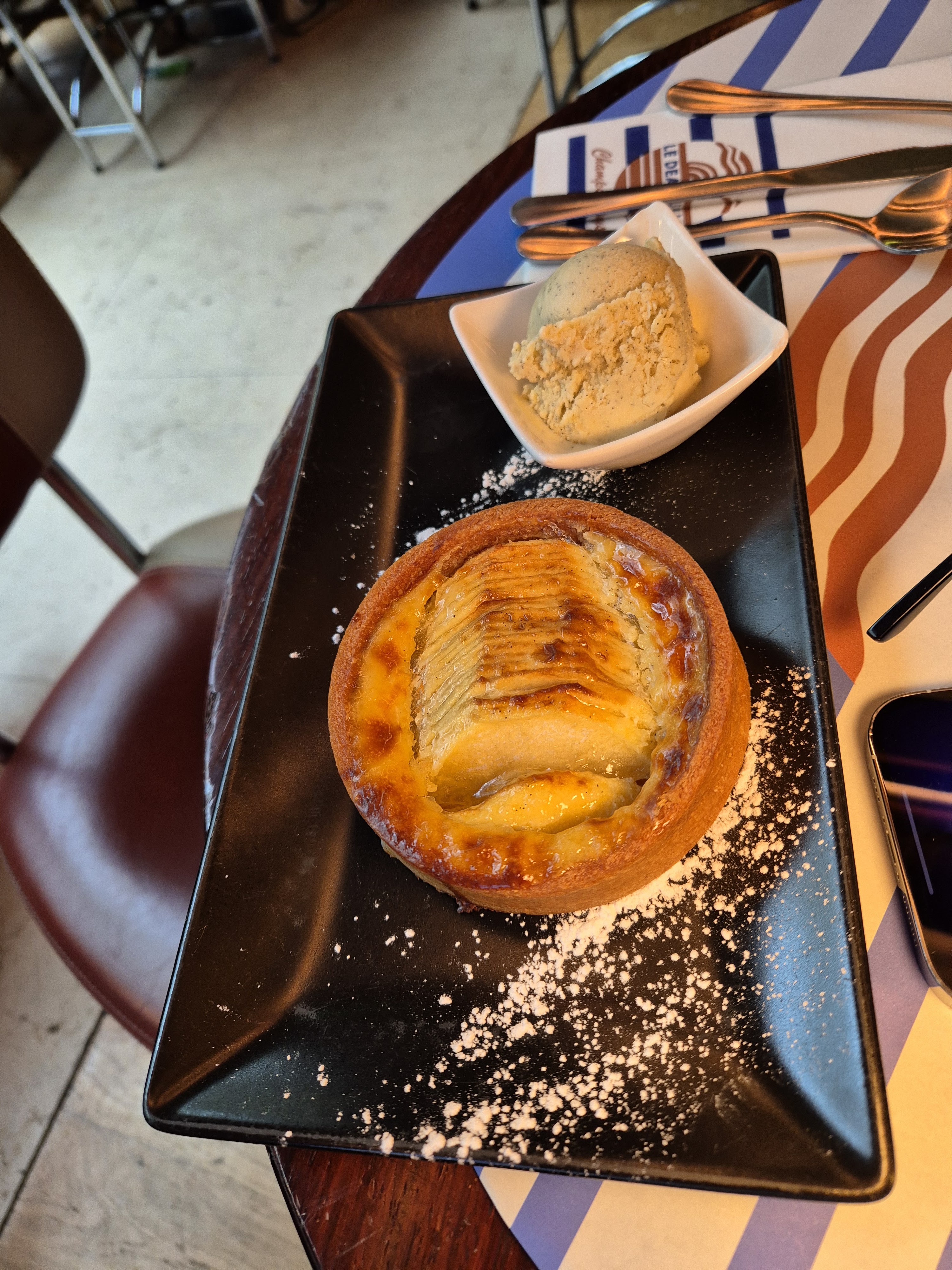 Le plat n’était vraiment pas mal, (des pates aux crevettes ) mais c’est surtout les crêpes qui sont délicieuses ! Des Crêpes ultra tendres au caramel beurre sallé et boule de glace vanille 😍 Juste très très dommage que à l’extérieure, il n’y ait pas de quoi fumeur car manger et se prendre des odeurs de tabac et autres dans la face peu vite gâcher l’appetit…