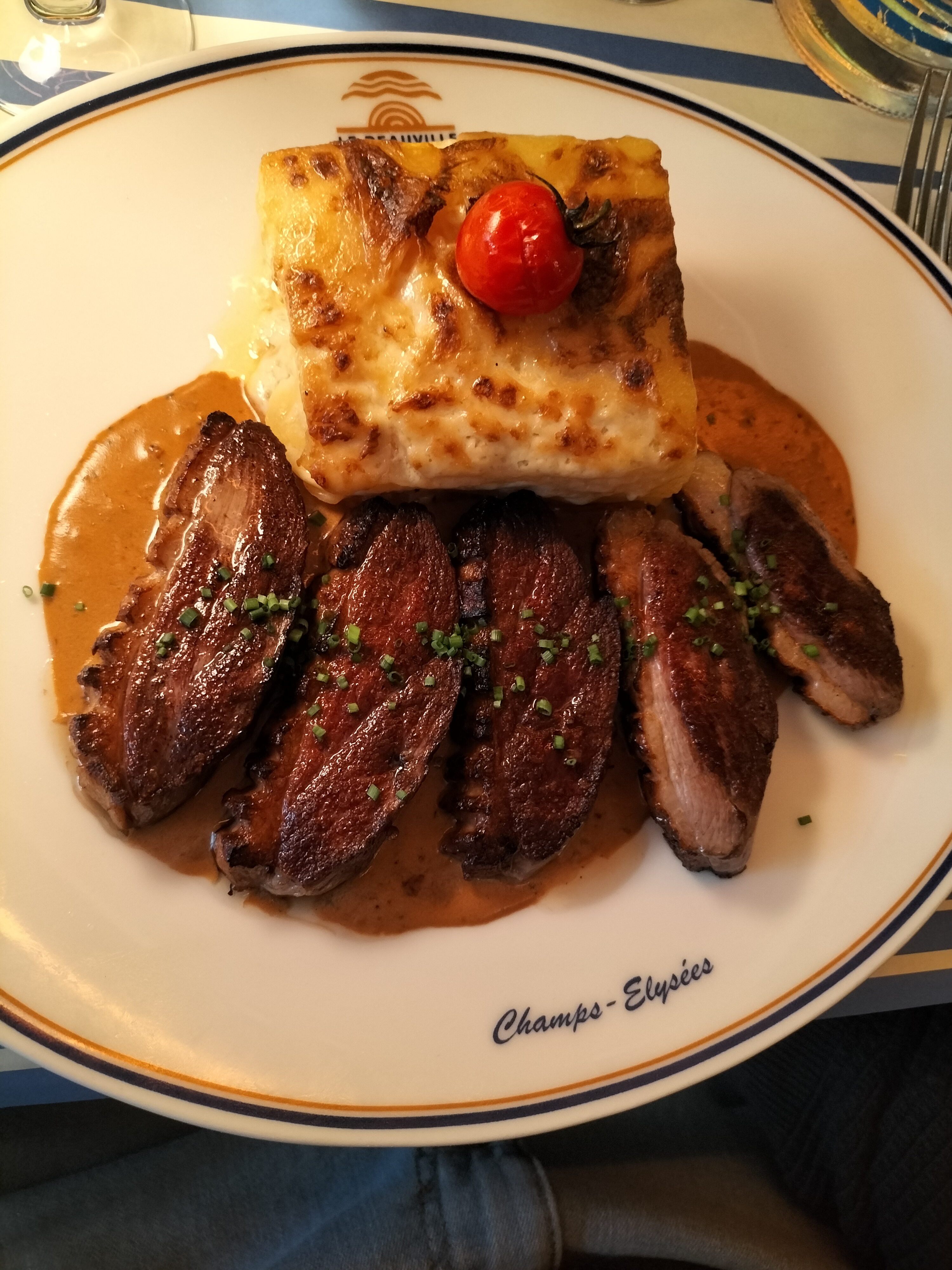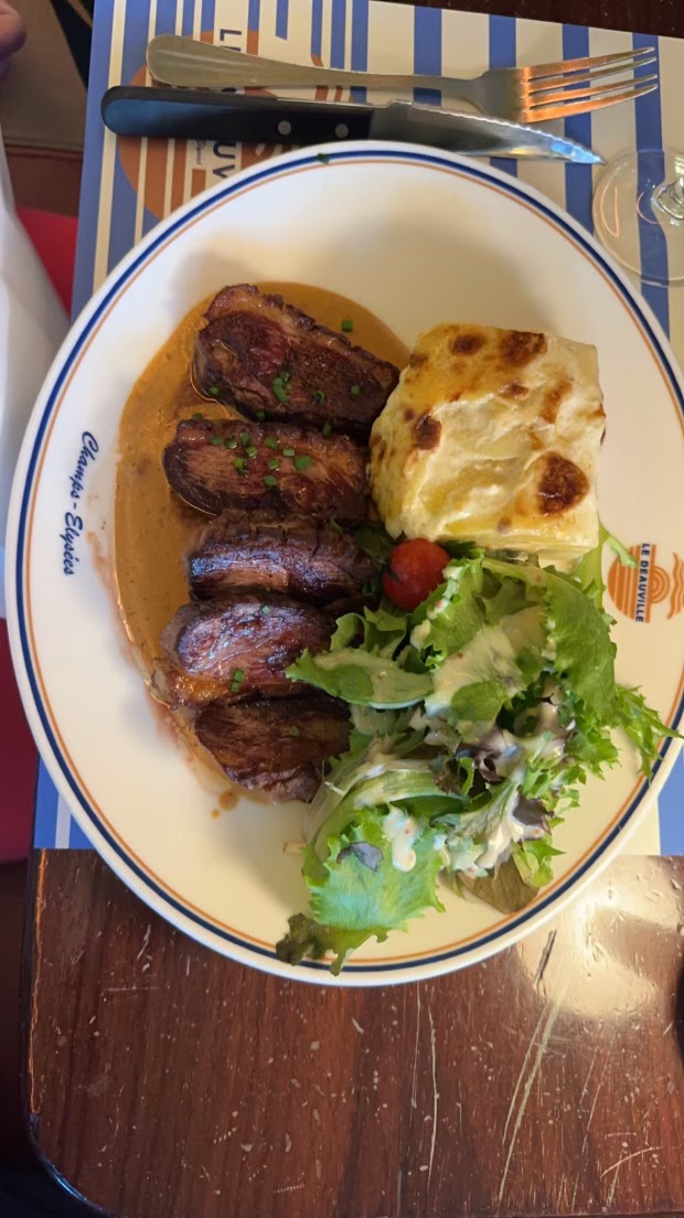 Je voudrais donner mon avis sur le repas que j'ai pris. Mon choix était le gigot d’agneau . Il était accompagné de pommes de terre avec une crème fraîche entre chaque couche. C'était tellement délicieux que je n'avais jamais mangé ce type de pommes de terre auparavant. On aurait dit que ce plat venait du paradis. En plus, la viande était si fraîche, tendre et savoureuse qu'elle fondait dans la bouche. Je tiens également à remercier Philippe pour son accueil chaleureux et son service exceptionnel, il a rendu l'atmosphère encore plus agréable. Merci à l'équipe du restaurant Deauville Champs-Élysées.