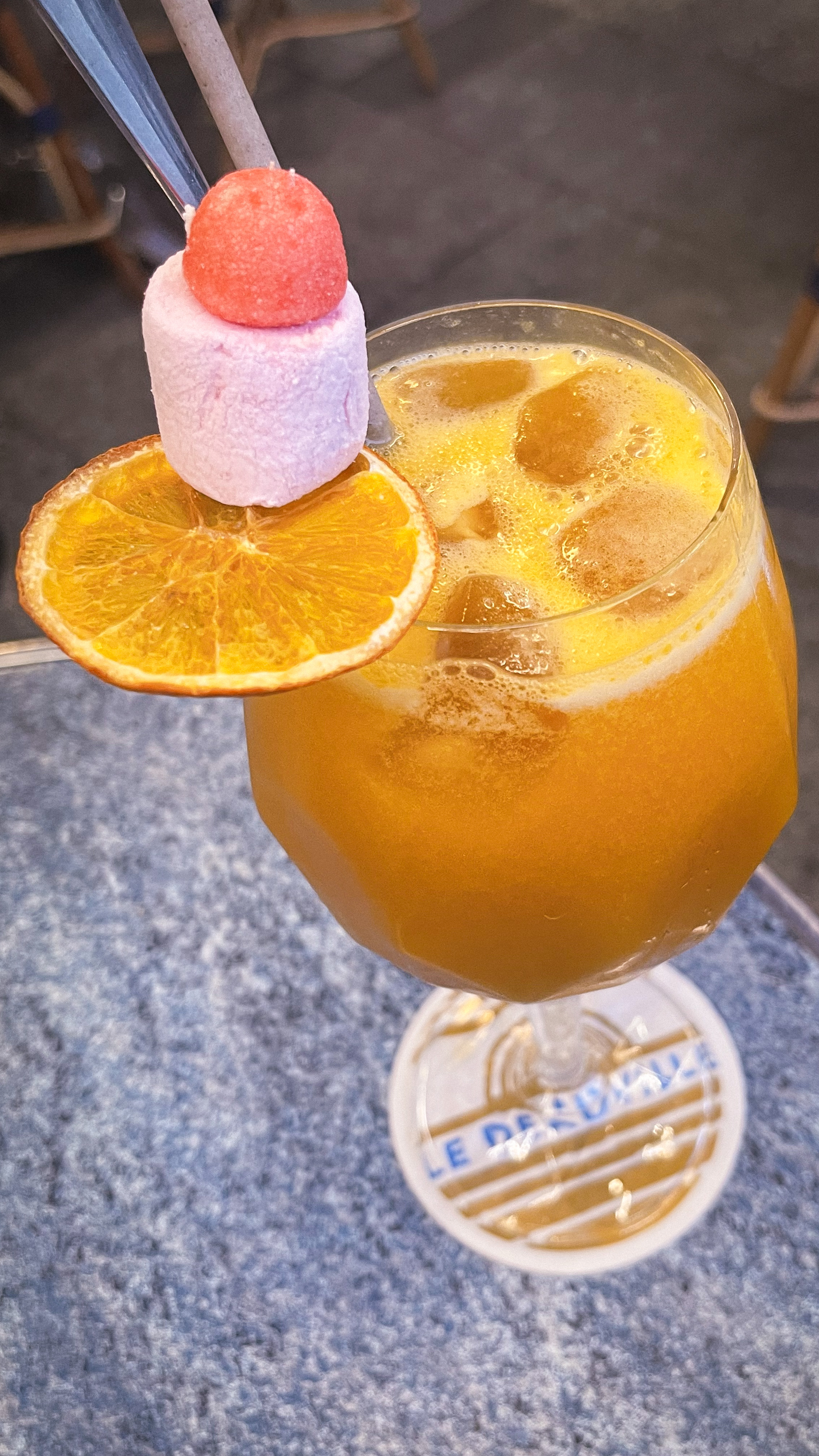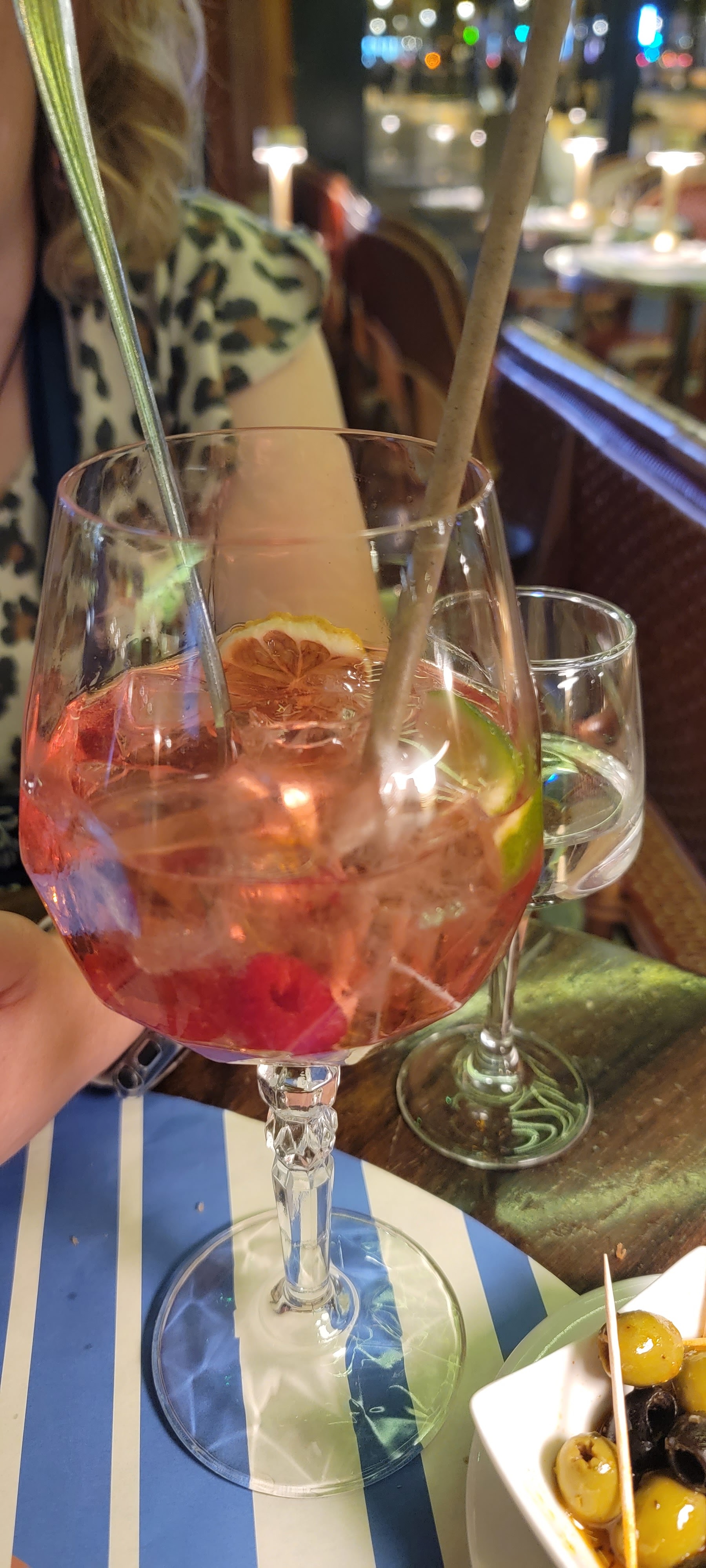Fish and chips d'escargots niçois… Negroni et verre d'eau Vittel. La niçoise et les escargots étaient savoureux mais le poisson et les frites pas tellement. Tout en donnant à l'expérience globale un service à 5 car c'était sympathique, nourriture 4, lieu 3. Mais sur les Champs Élysée, lors d'une promenade très chargée du dimanche après-midi, c'était un bon répit ! Venu c'est 3 étoiles pour quelques fumeurs à proximité… il faut que les gens vapotent plus à Paris. 5 étoiles pour un v délicieux Negroni🥃.