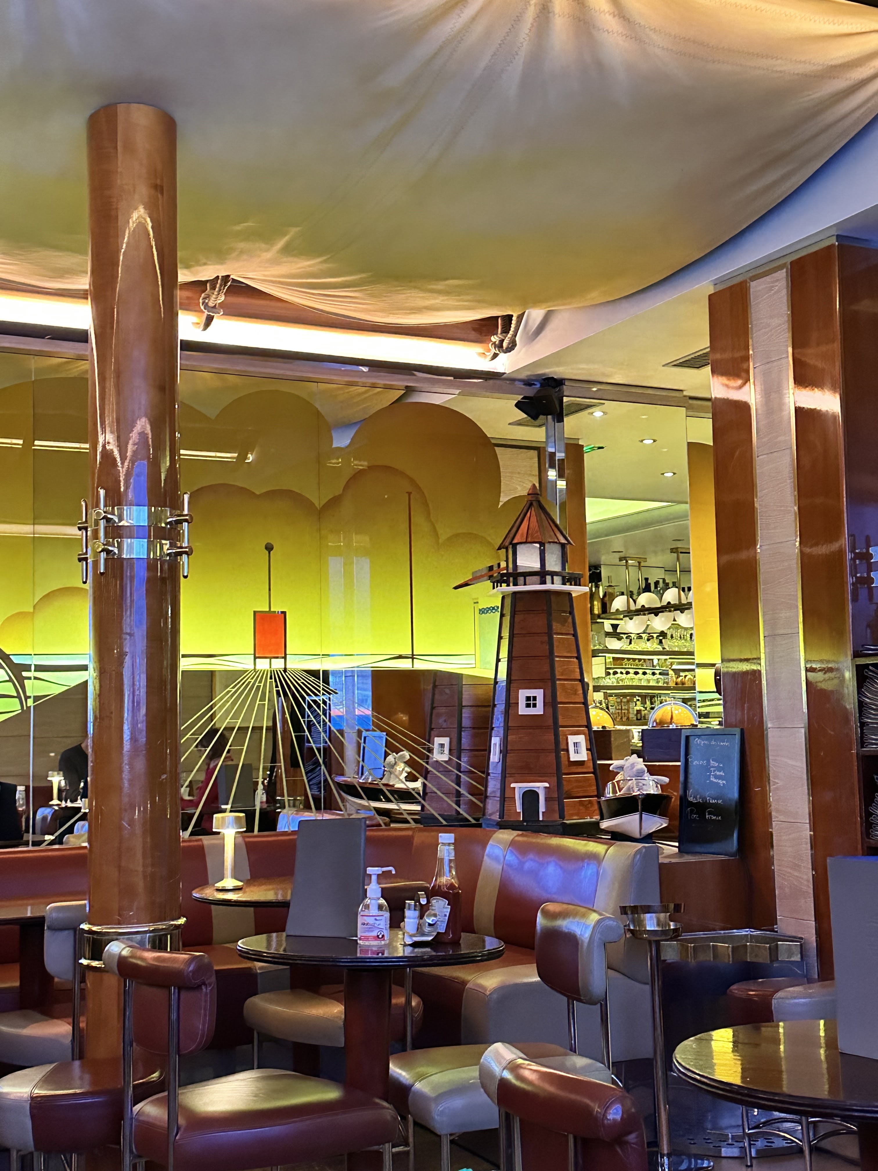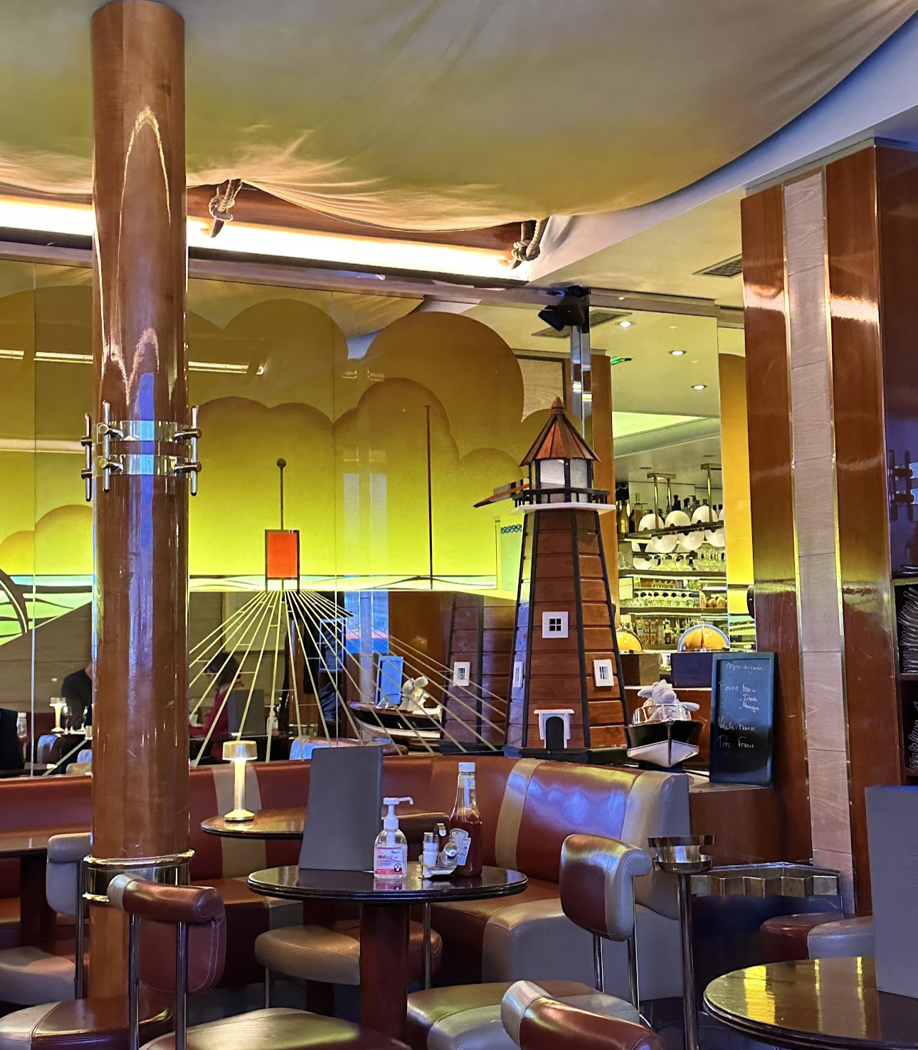 Notre groupe était très intéressé par Marins. Le restaurant est un grand navire, orné d'immenses voiles et doté d'immenses écrans de projection. Les vagues vous donnent l'impression d'être sur la côte et l'atmosphère est très relaxante. Créateur : Hubert de Givenchy (le créateur de la robe noire d'Audrey Hepburn dans « Breakfast at Tiffany's »?)Restaurant sur le thème des marins inspiré des navires.