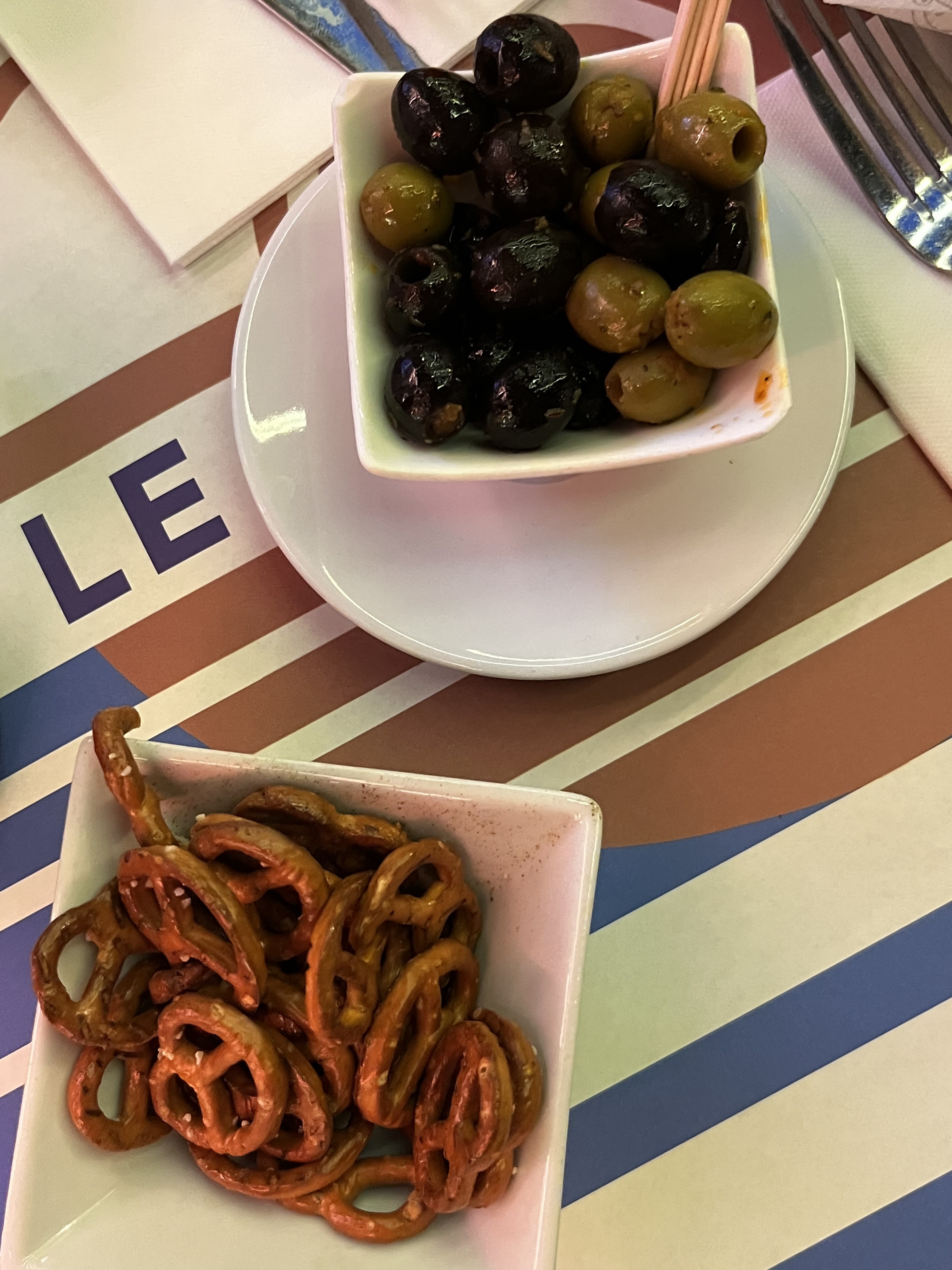 Café en plein air sympa mais beaucoup de tables donc un peu à l'étroit. J'ai pris le sandwich au poulet croustillant avec des frites et c'était très bon avec un petit pain très léger et un poulet croustillant très tendre. Ce sont des frites et j'avais espéré que les françaises seraient spectaculaires mais Meh. Il y avait des olives gratuites et le vin était bon. Soyez prêt à dépenser 50 euros pour le déjeuner
