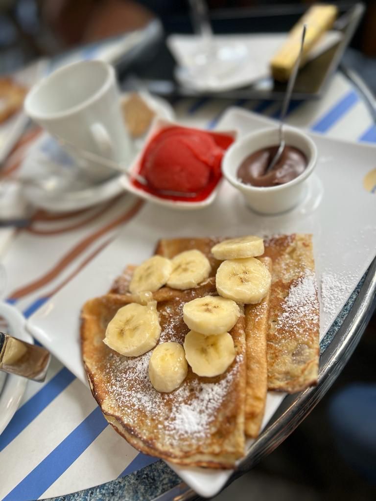 Nous avons été attirés par les bonjours amicaux du personnel dans la rue et le reste n'a pas été déçu. Le personnel ici était vraiment amusant, notre serveur avait une tonne de personnalité et en faisait une expérience formidable. Nous partageons une soupe à l'oignon française pour commencer, si vous ne mangez pas de soupe à l'oignon française en France, que faites-vous ? J'ai aussi eu un spritz d'aperol vraiment délicieux. Mon repas principal était une salade chaude au fromage de chèvre. C’était une portion généreuse que je n’arrivais pas à terminer. Mon boulet et ma chaîne avaient un filet et les pommes de terre dessus changeaient la vie. Il en a parlé toute la nuit. Terminez le tout avec une crêpe banane et Nutella. Nous avons mangé dehors, ce qui était étonnamment chaud car il faisait assez frais, mais manger sur la terrasse est la façon de le faire à Paris. L'intérieur est également adorable. On pouvait dire qu’ils étaient occupés mais n’avaient aucun problème avec le service et le recommandons vivement.