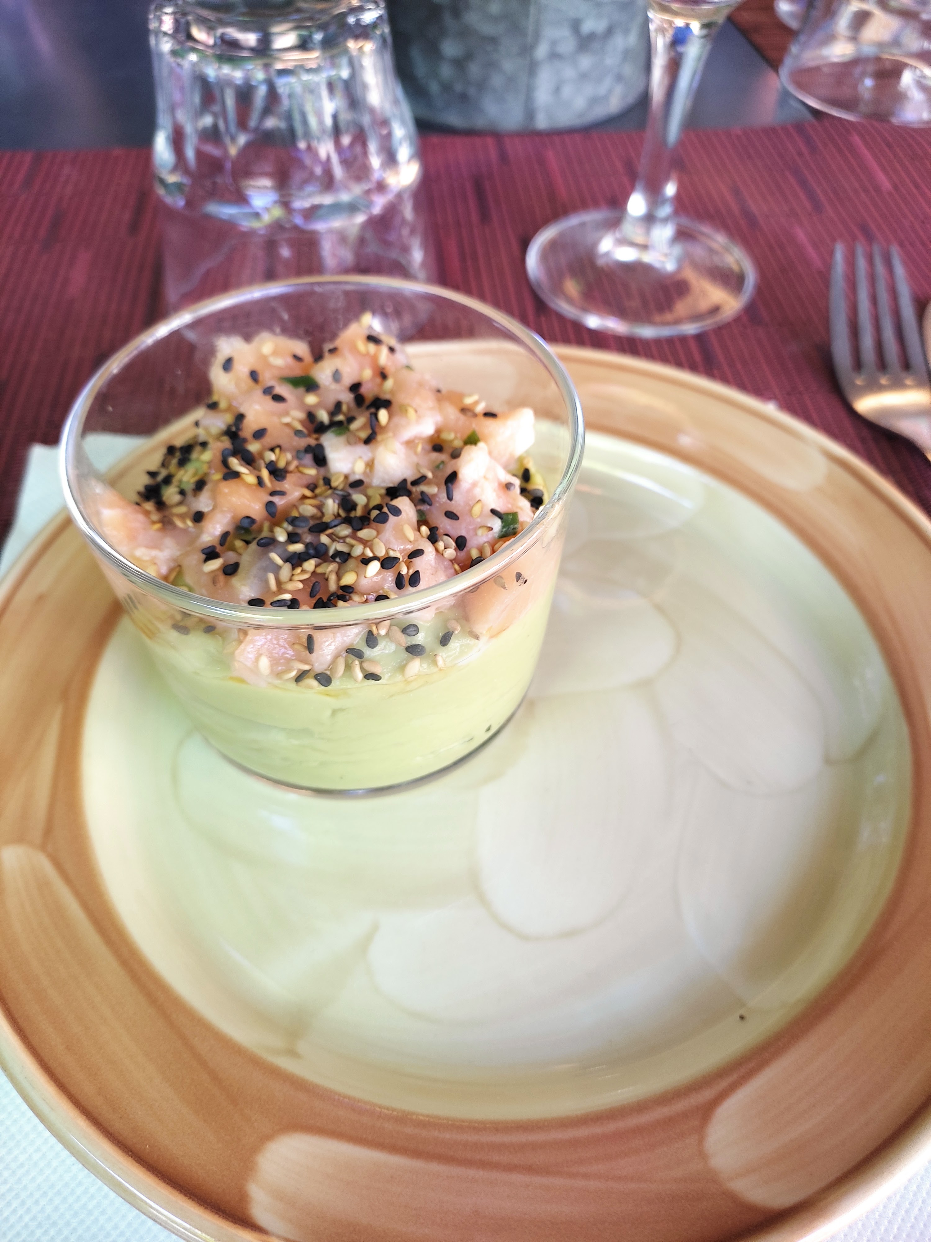 Grande salade au saumon mariné et brunoise de mangue....il fallait chercher la brunoise ...5 minuscules dès de saumon perdus dans une énorme quantité de salade mesclun.. Dommage le cadre est très beau