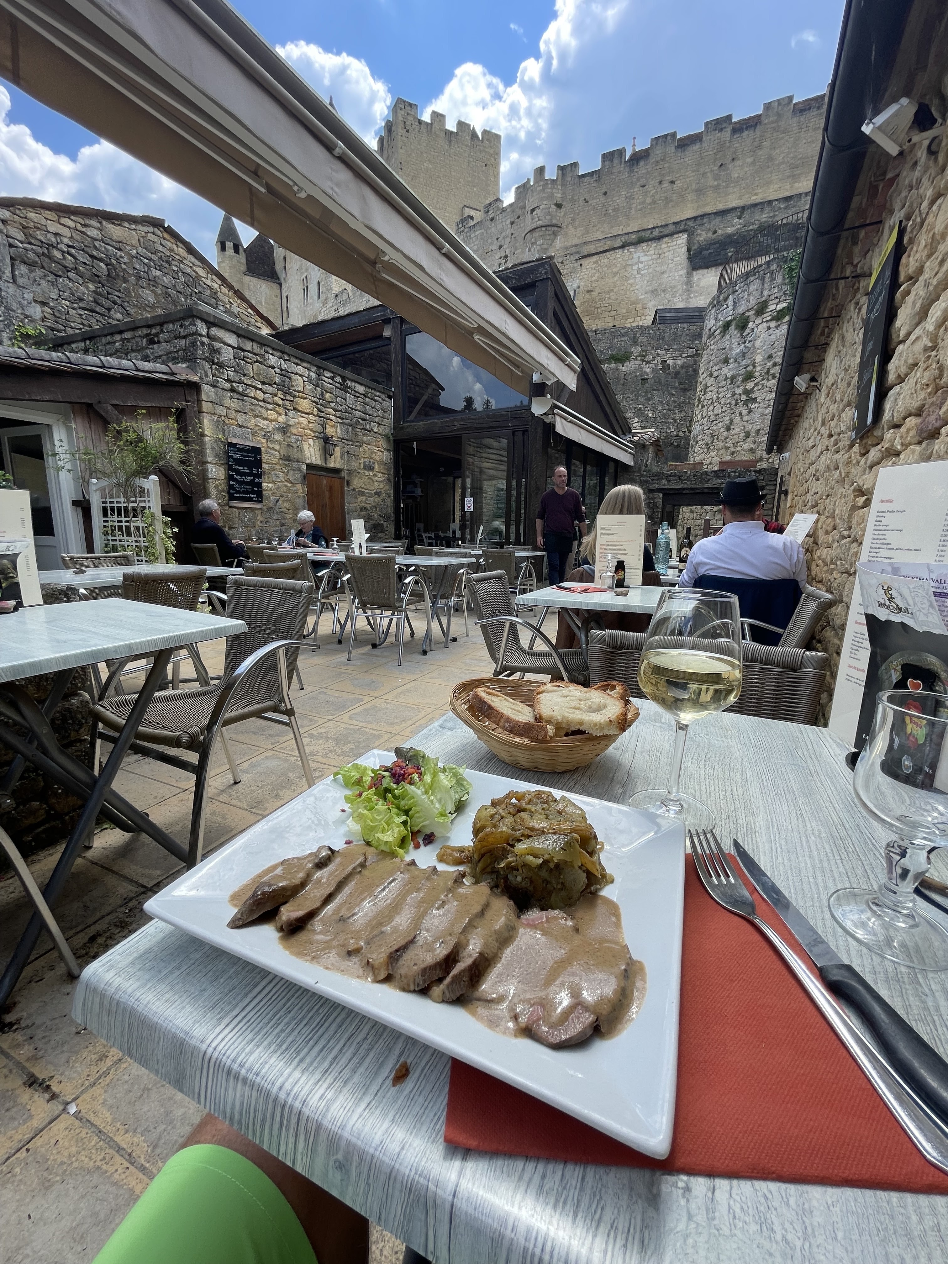 Bien placé a la sortie du château. Menu enfant très bien et buger perigourdin très bon et copieux. Présentation des assiettes soignée et aromates provenant de la terrasse. Service agréable mais pas rapide a cause du monde, pour lequel je retire une étoile.