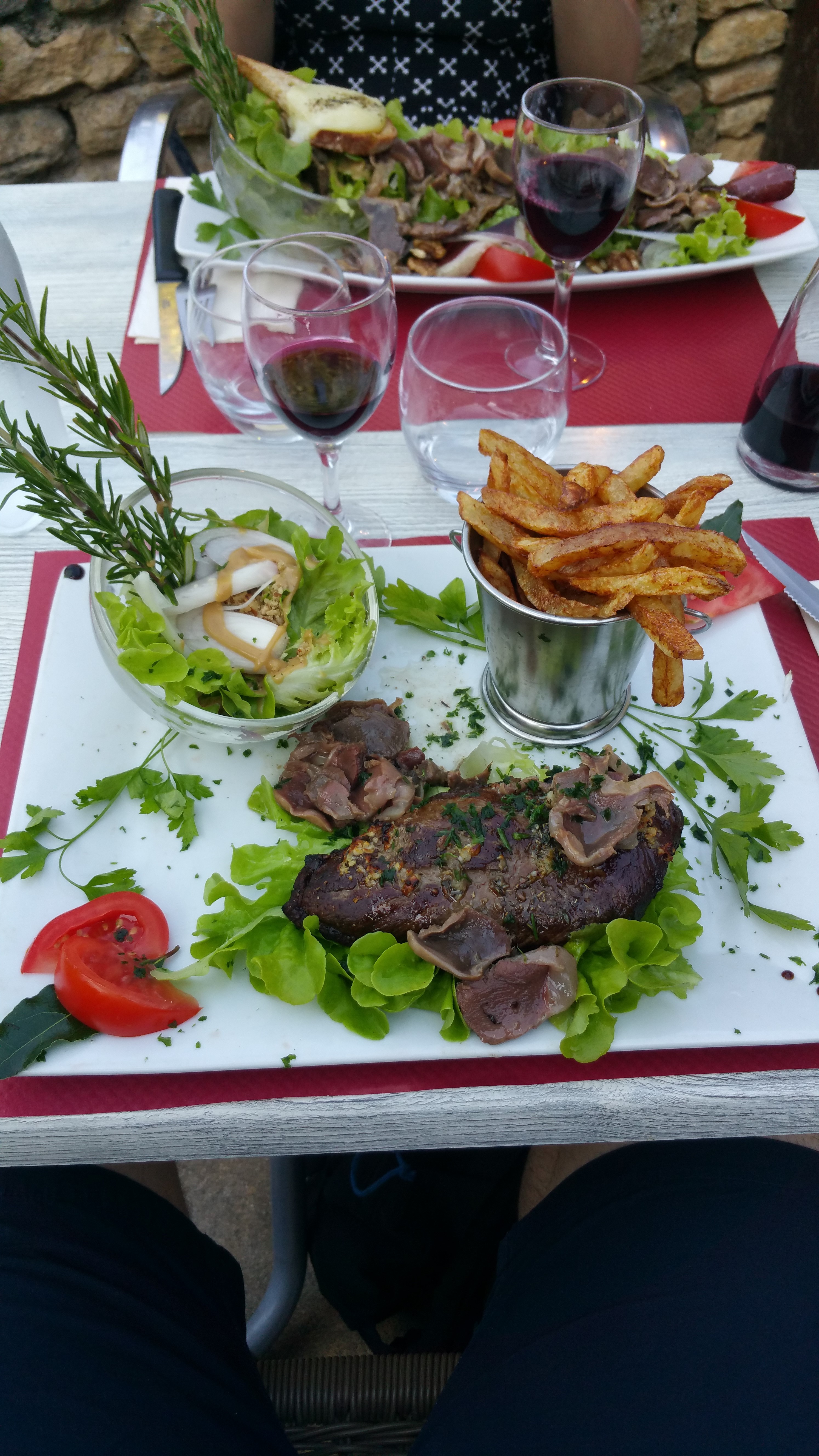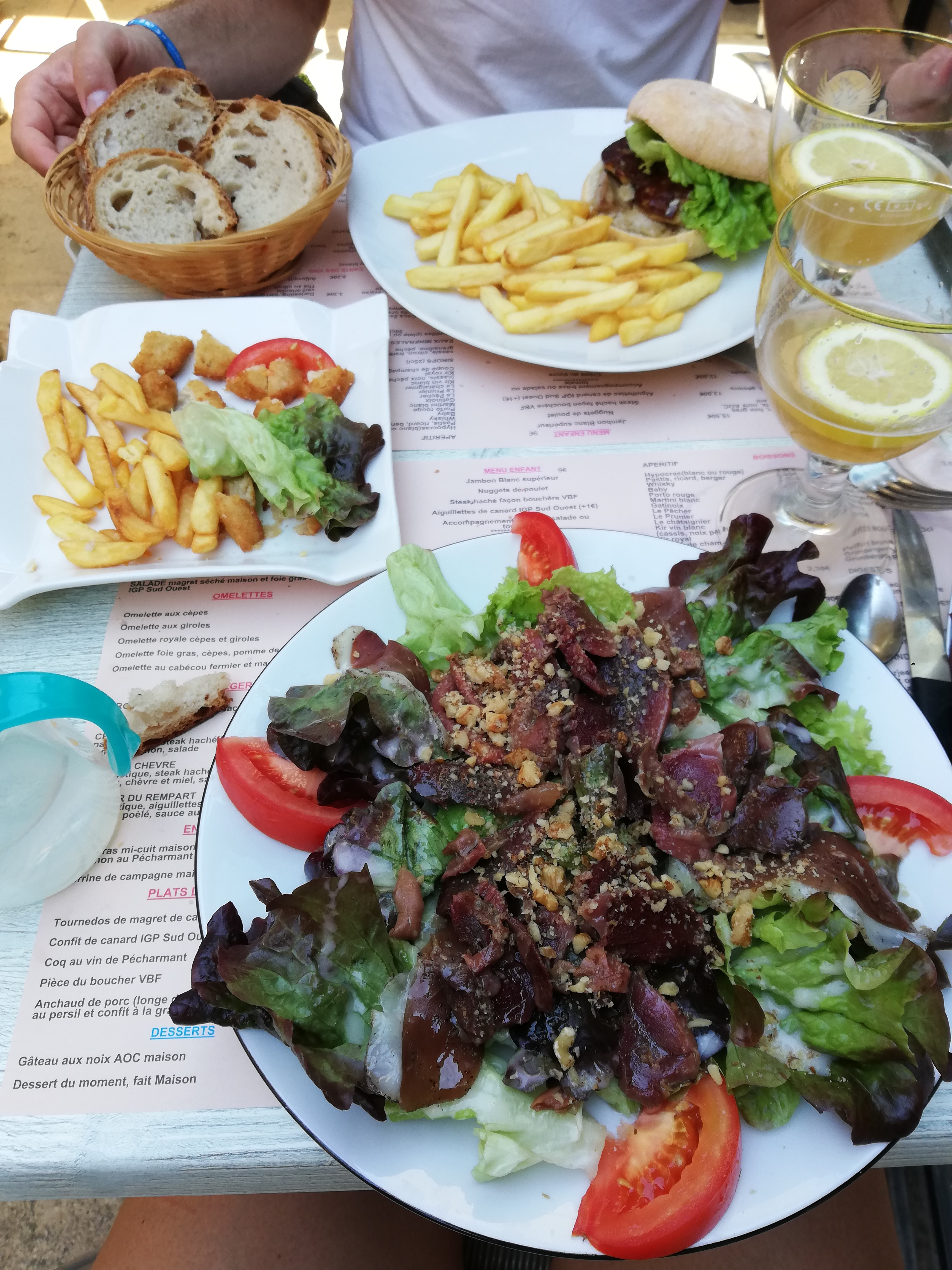 tres deçue, 50 min d'attente, ils étaient dans le jus, certains plats sont tres basiques (salade, burger, confit de canard,bref rien de fou ! on demande une cuisson saignante, elle arrive à point) nous n'avions, ni pain, ni sel, si poivre, ni serviettes, bref un attrape touriste en face du chateau une aubaine pr eux, j imagine pas en plein été...