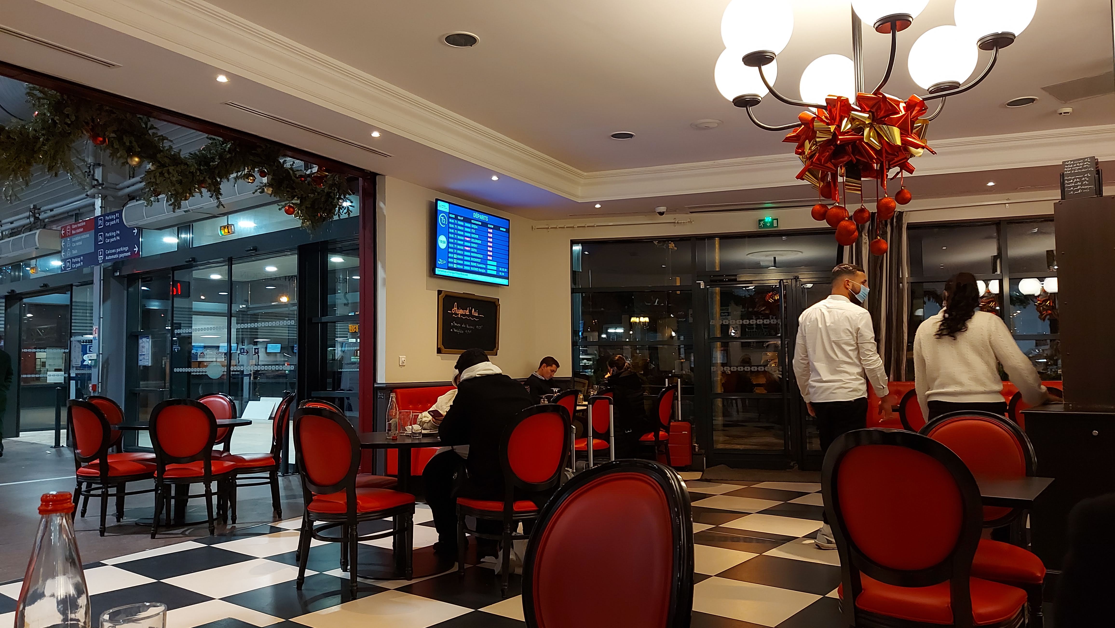 Dommage que les serveuses n’aient qu’une envie, aller dormir à 21h alors que le restaurant ferme à 23h. Elles nettoient la salle et interdisent aux clients certaines tables afin de fermer plus tôt. Nous les avons entendu le dire entre elles et aux clients ! Impressionnant pour un restaurant d’aéroport !
