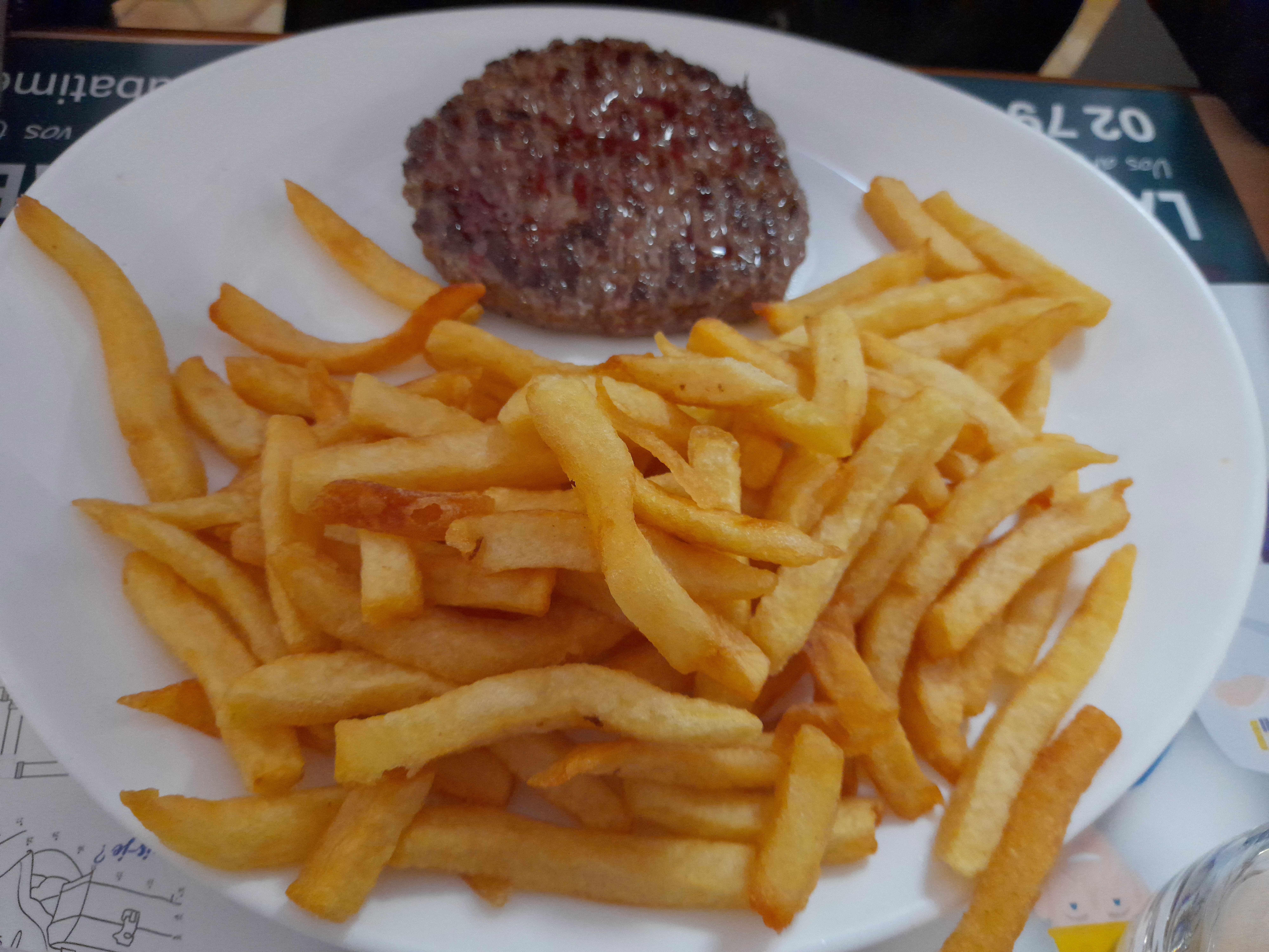 Ce n'était pas bon, du steak haché avec des frites. Aucun goût et les frites étaient sales. Seulement un morceau de cuir et quelques frites dans l'assiette, pas de garniture ni de légumes. Le steak était bien cuit et très sec. Je ne mangerais pas ici.