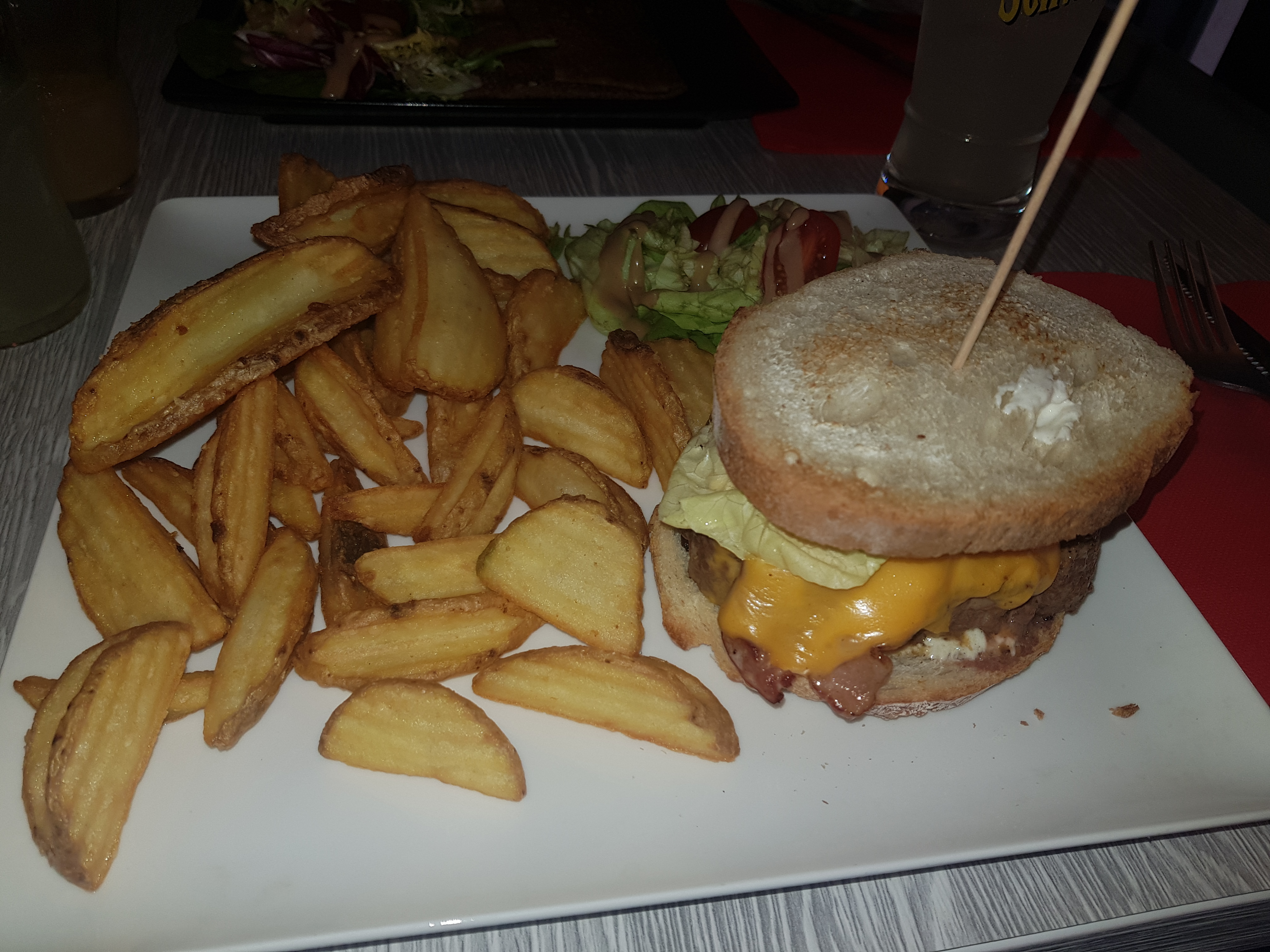 Bien accueilli par le patron mais la suite moins bonne... Service long, on a commandé des boissons pour les recommander au moment de la commande des plats. Nous avons dû demander les cartes... sans quoi nous n'aurions pas pu commander. Burgers rien d'exceptionnel. Pain à revoir, le fromage n'était pas fondu et le bacon cramé (noir brûlé et non pas juste trop grillé) L'ambiance est sympa il y a de quoi tenir un bon restaurant mais quelques points à améliorer. Après plus de 6/7 tables.. le service semble dépassé.