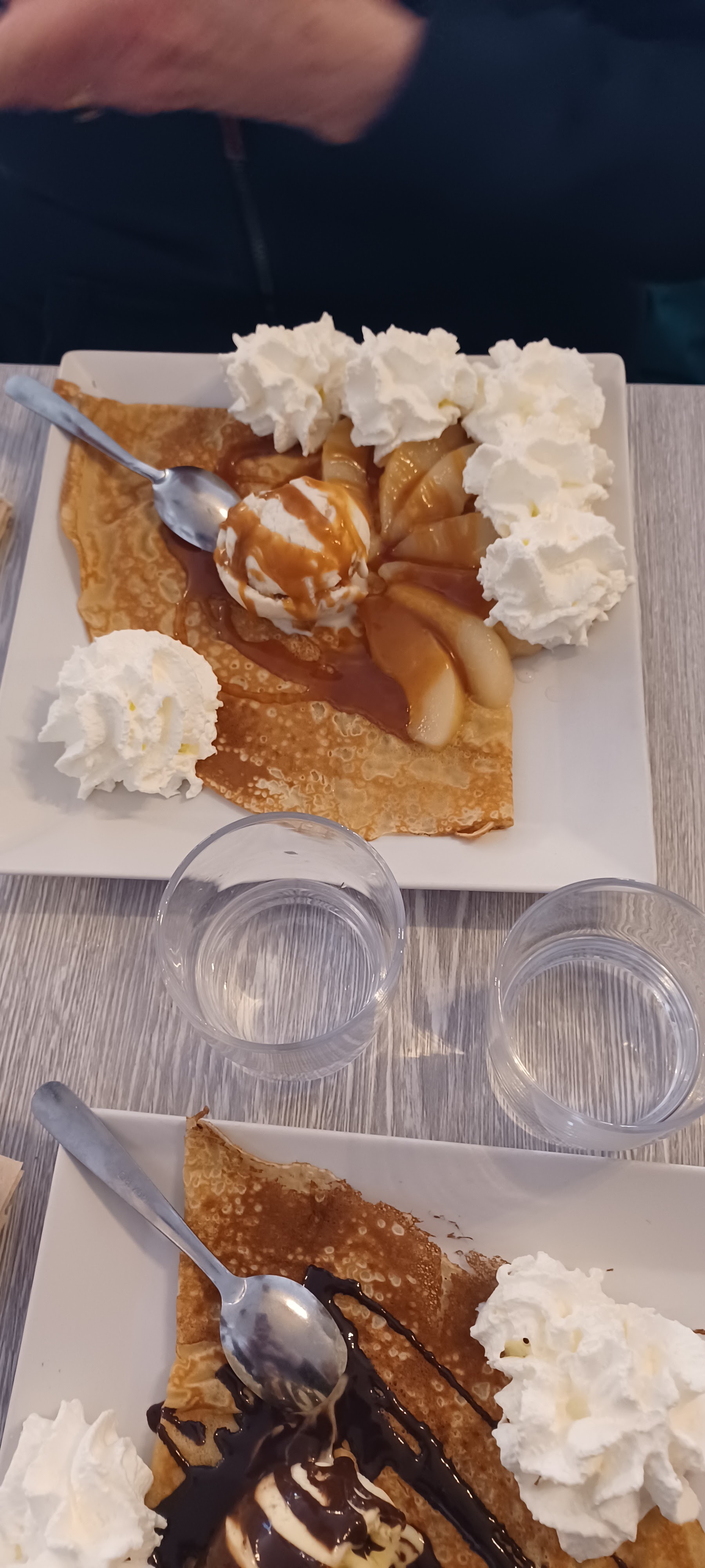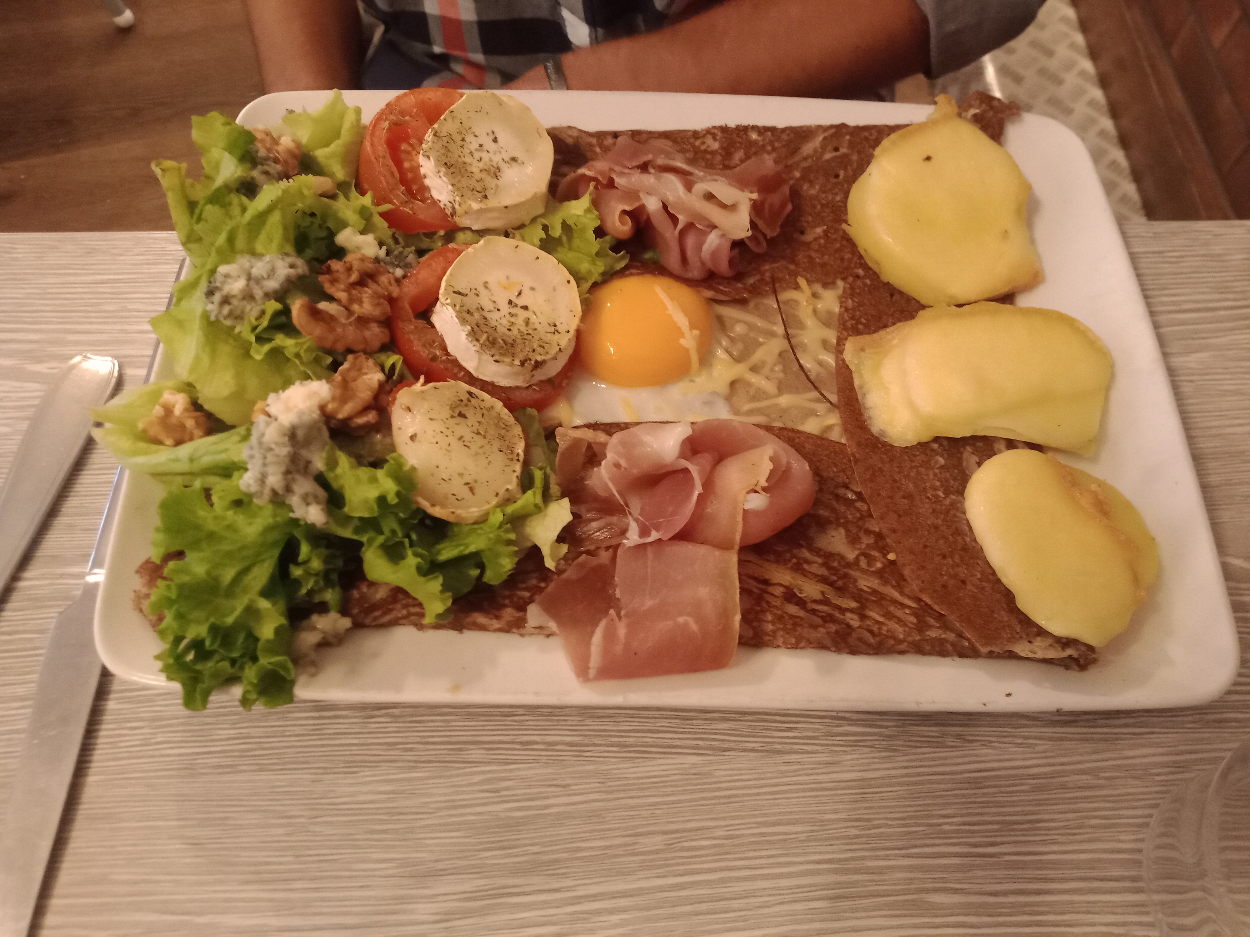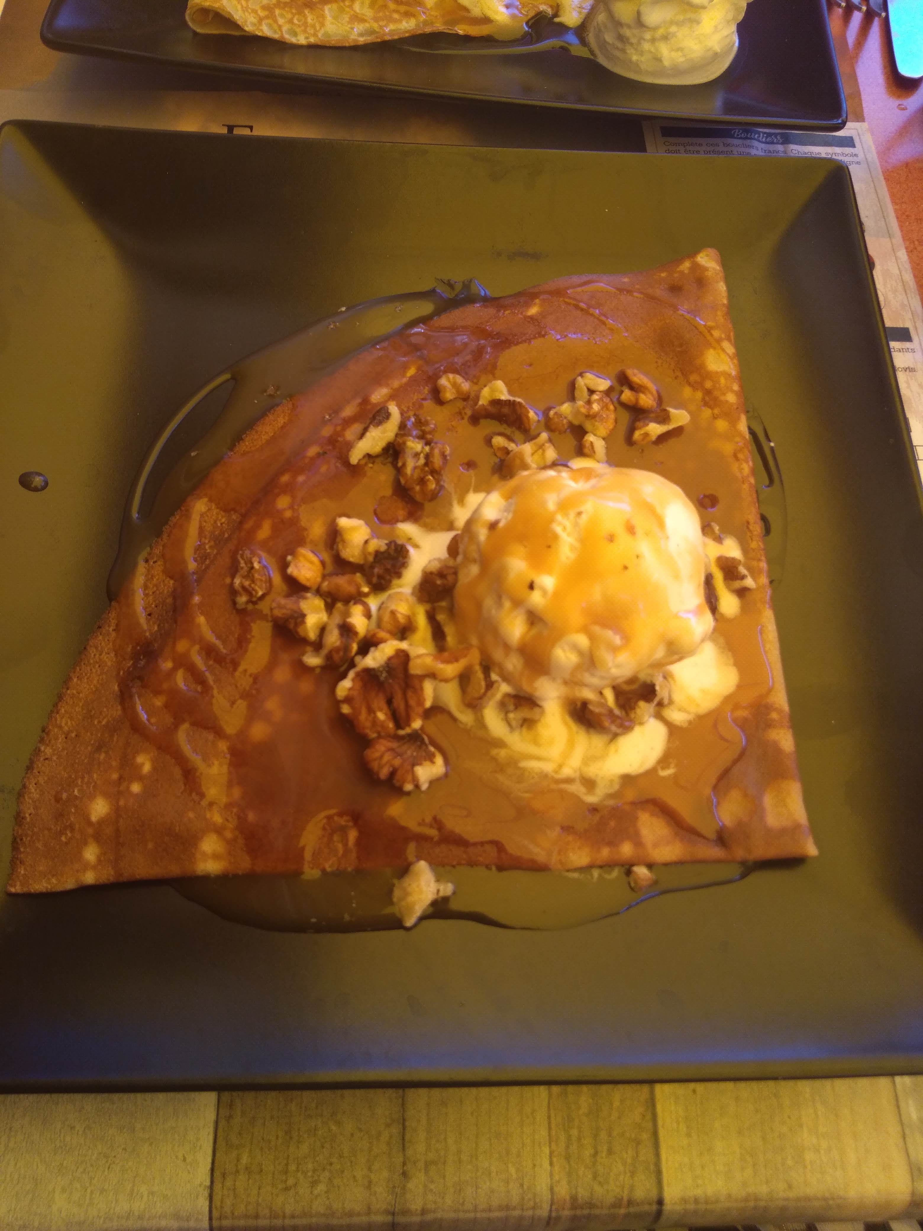 Nous avons été très bien accueillis malgré l’heure tardive pour déjeuner, 14h30...nous avons pu manger un délicieux hamburger avec ses frites ainsi qu’une galette de sarrasin à la tartiflette. En dessert : crêpes de froment : bananas : glace banane, bananes, chocolat et crème chantilly, et une crêpe caramel. Nous avons très bien mangé pour un prix raisonnable à deux : 42€ boissons incluses.