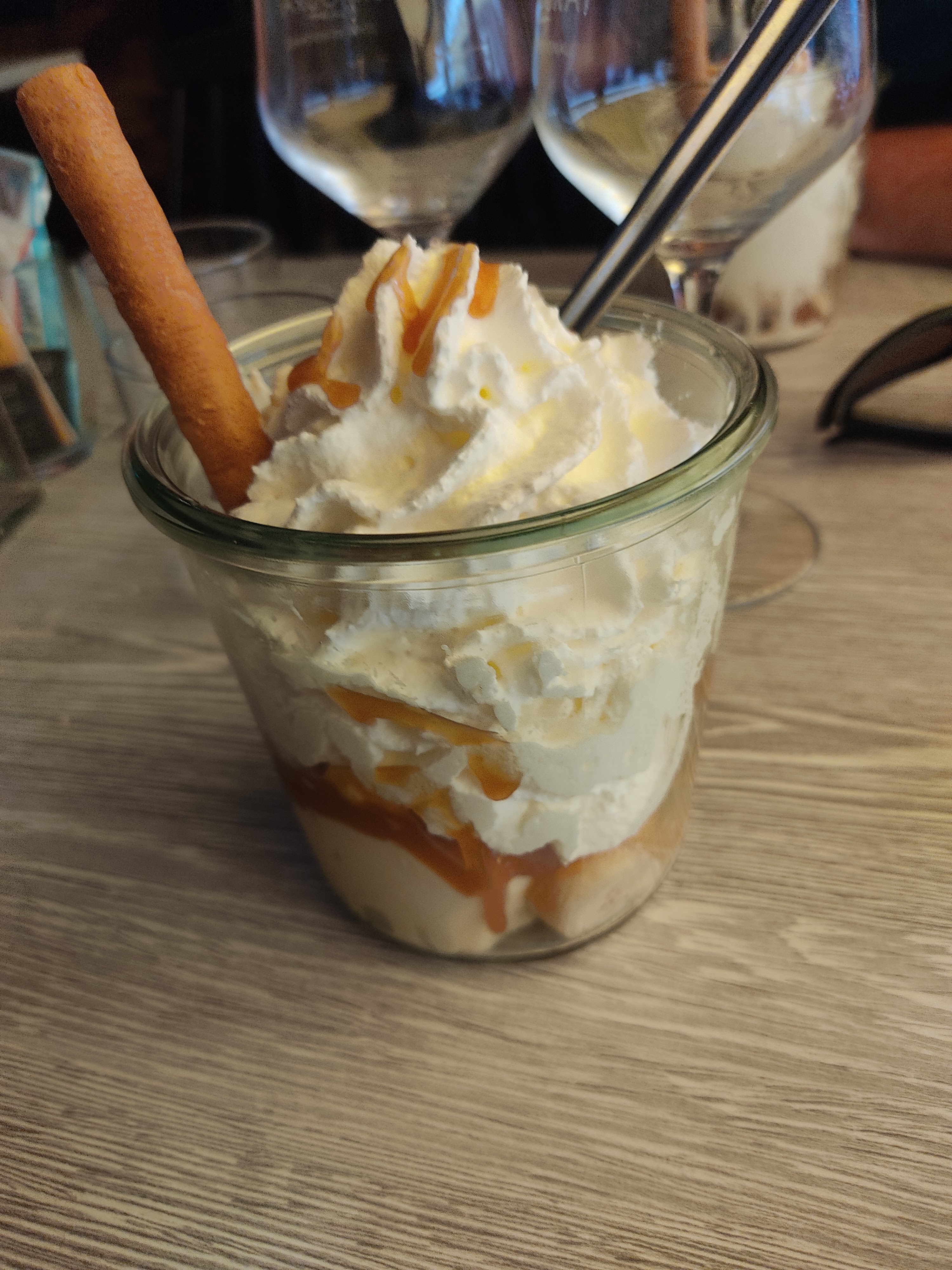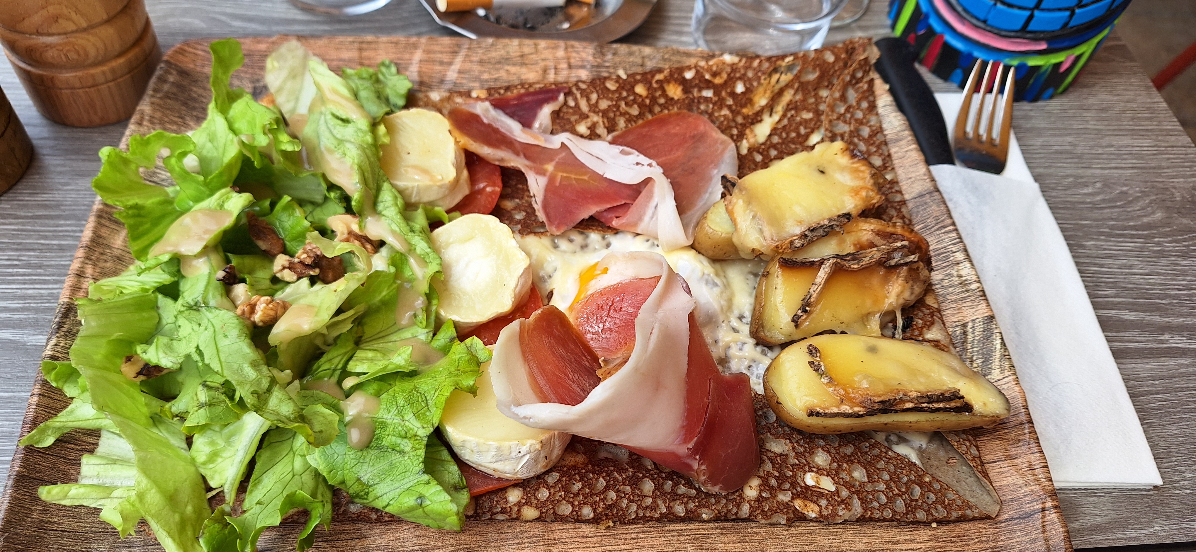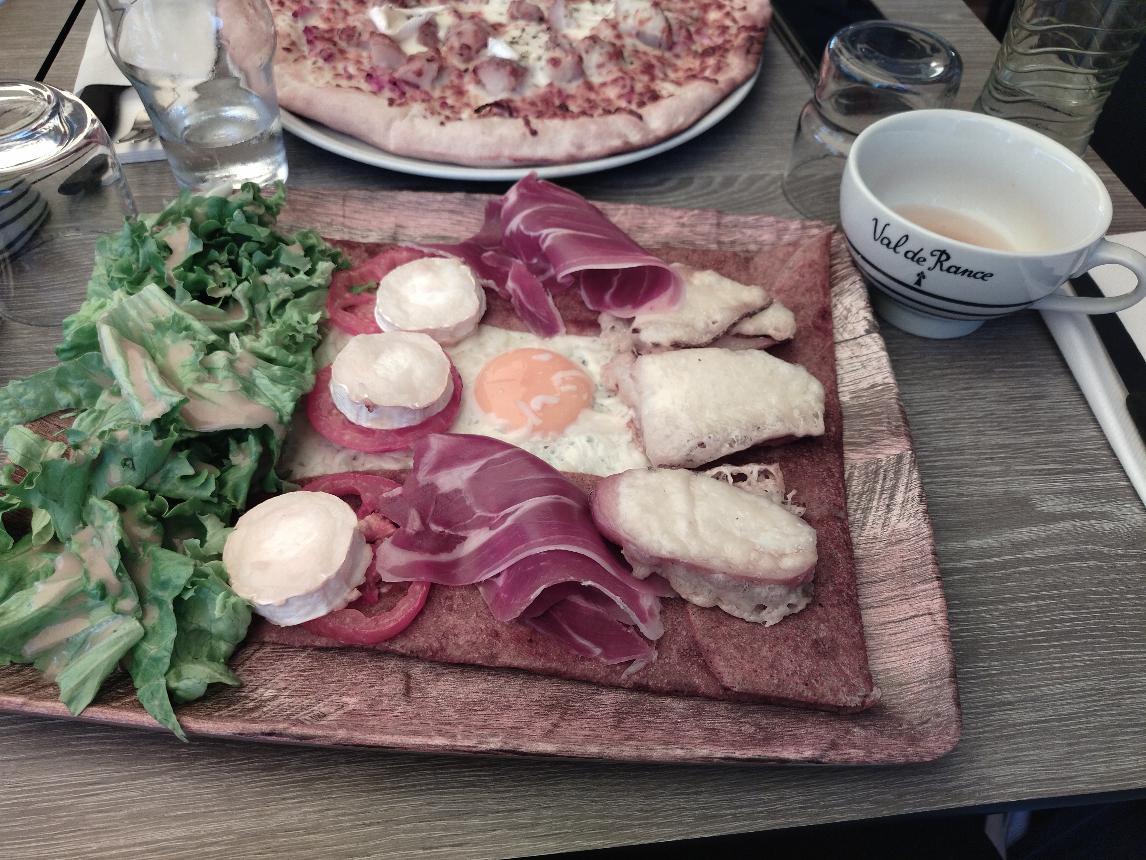 Nous avons été très bien accueillis malgré l’heure tardive pour déjeuner, 14h30...nous avons pu manger un délicieux hamburger avec ses frites ainsi qu’une galette de sarrasin à la tartiflette. En dessert : crêpes de froment : bananas : glace banane, bananes, chocolat et crème chantilly, et une crêpe caramel. Nous avons très bien mangé pour un prix raisonnable à deux : 42€ boissons incluses.
