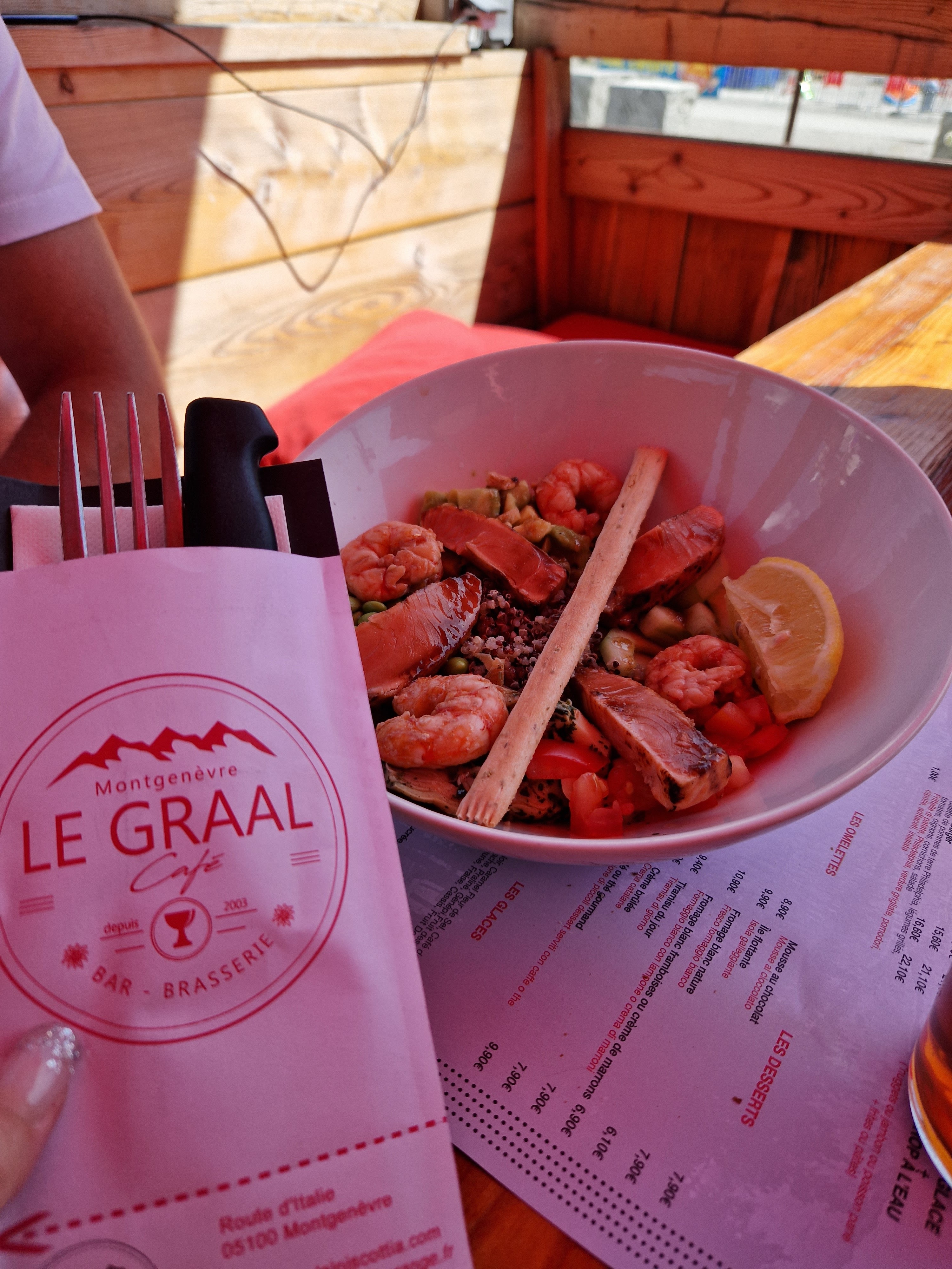 Réussir à manger équilibré (ou pas pour les gourmands !), vite et bien, avec le sourrir compris aux pieds des pistes : assez rare à Montgeneve ! 👌