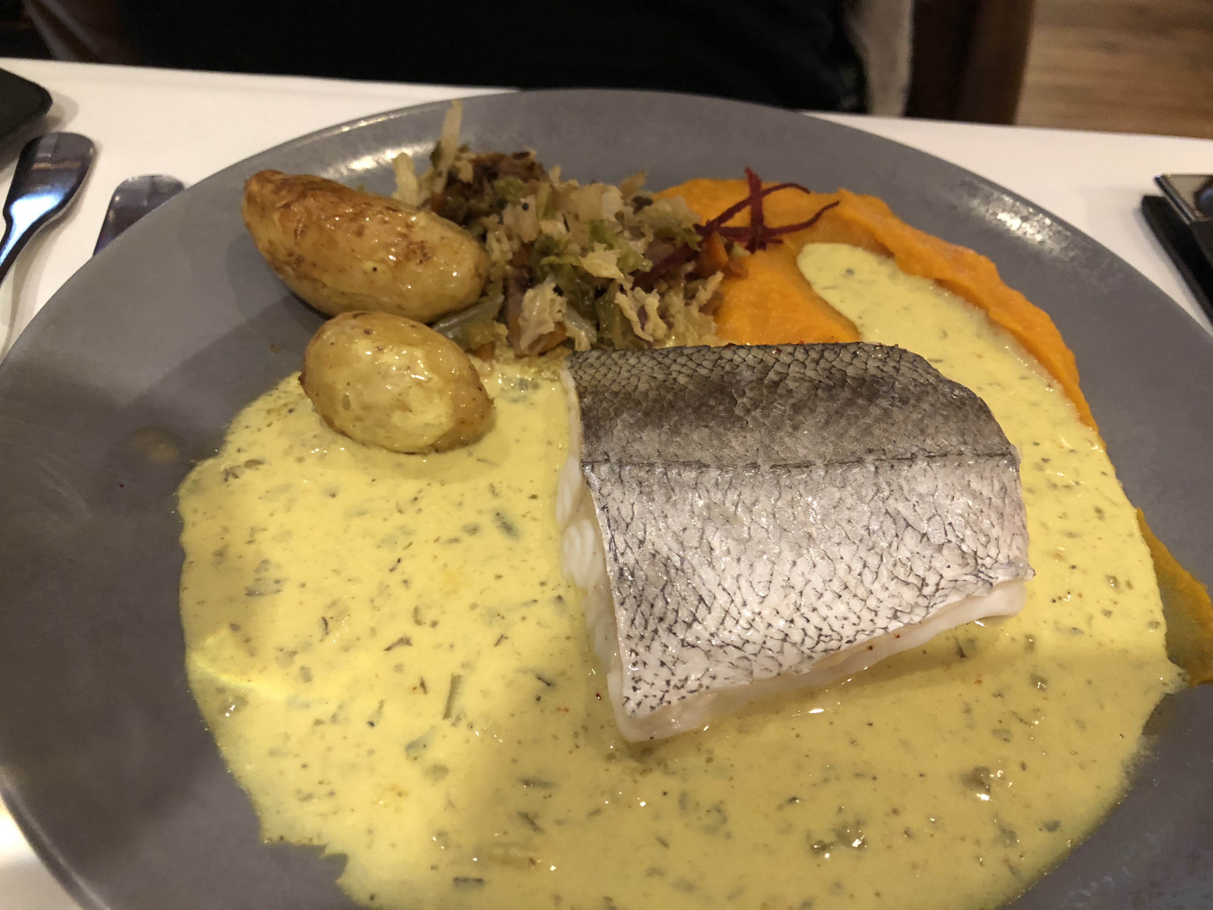 La formule à 27 euros reste cher pour ce que l'on mange. Le plat principal : le merlu, en fait est un flan sans goût. Dommage car l'accompagnement était bon. La tarte aux poires doit être achetée en grande surface car c'est exactement pareil. Déçu car le cadre est sympa et l'accueil chaleureux. Les serveurs sont speeds. En fait la nourriture n'est pas à la hauteur du tarif. Il doit y avoir beaucoup de surgelés. Dommage !!!