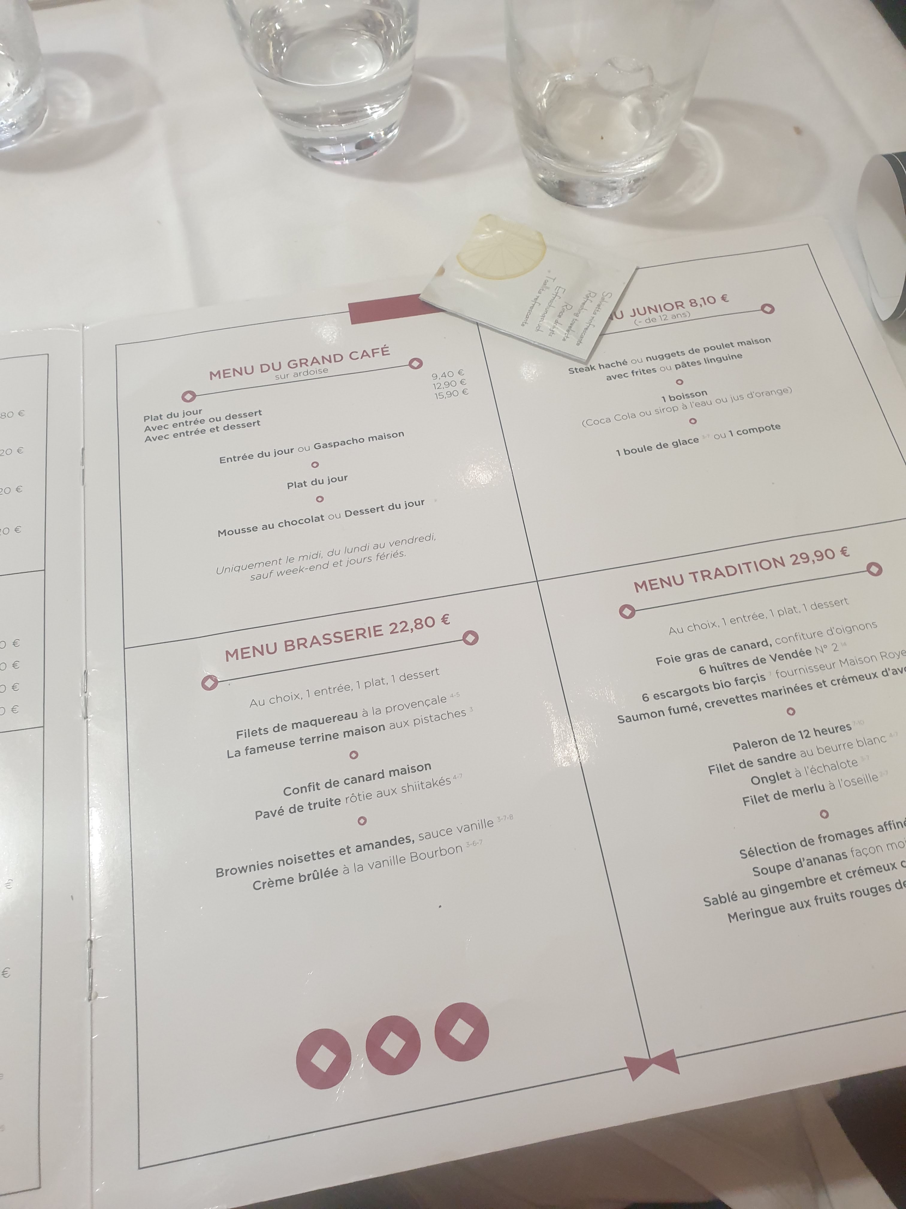 Comme d'habitude un détours au Grand Café à Cholet...sur la route des Vacances. Service excellent, personnel prévenant...belle présentation de table avec nappe blanche..(😉dans laquelle on ne s'est pas pris les pieds) et c'est très agréable de manger dans ces conditions...😏😜. Bonne continuation et à bientôt.