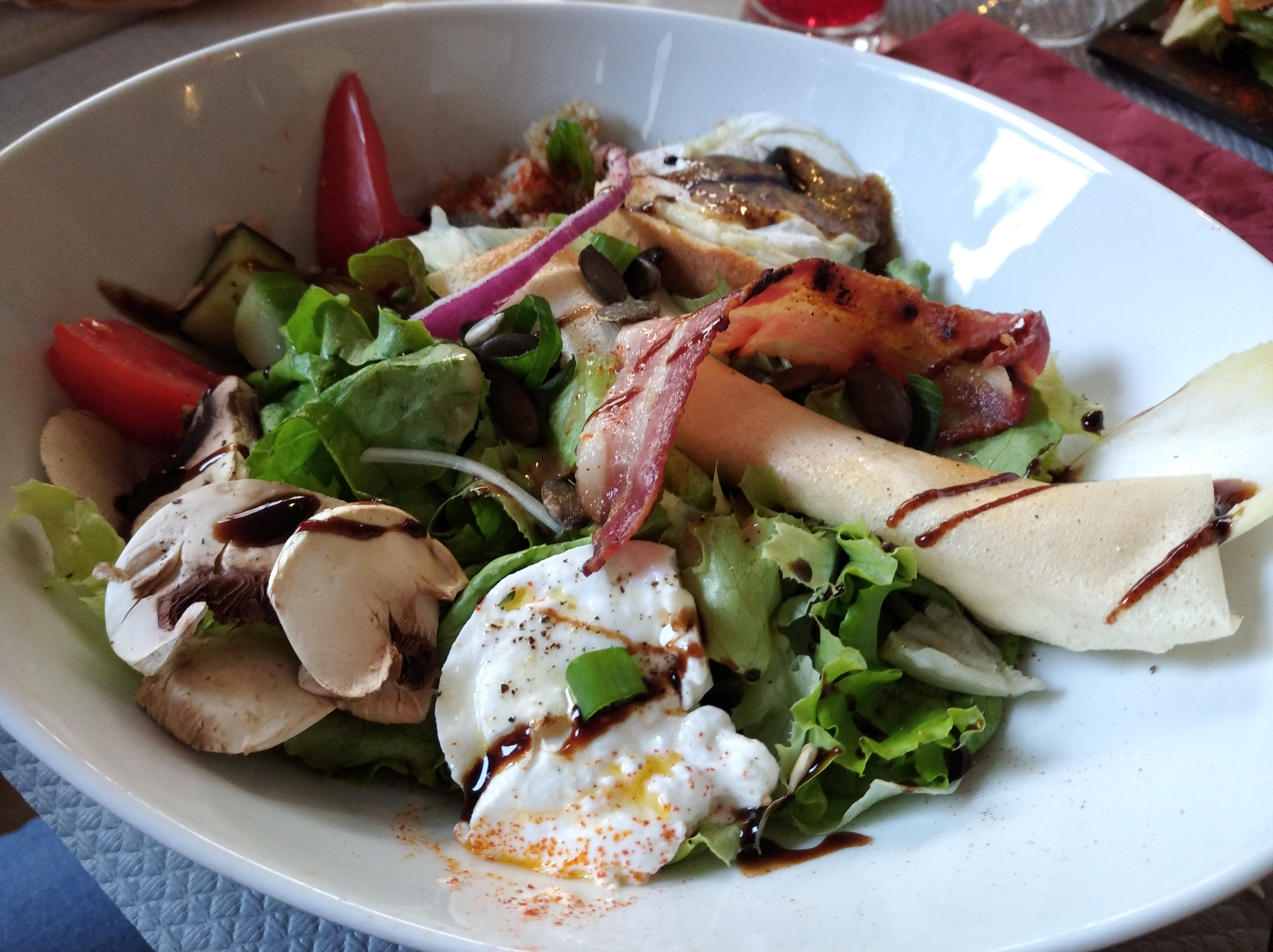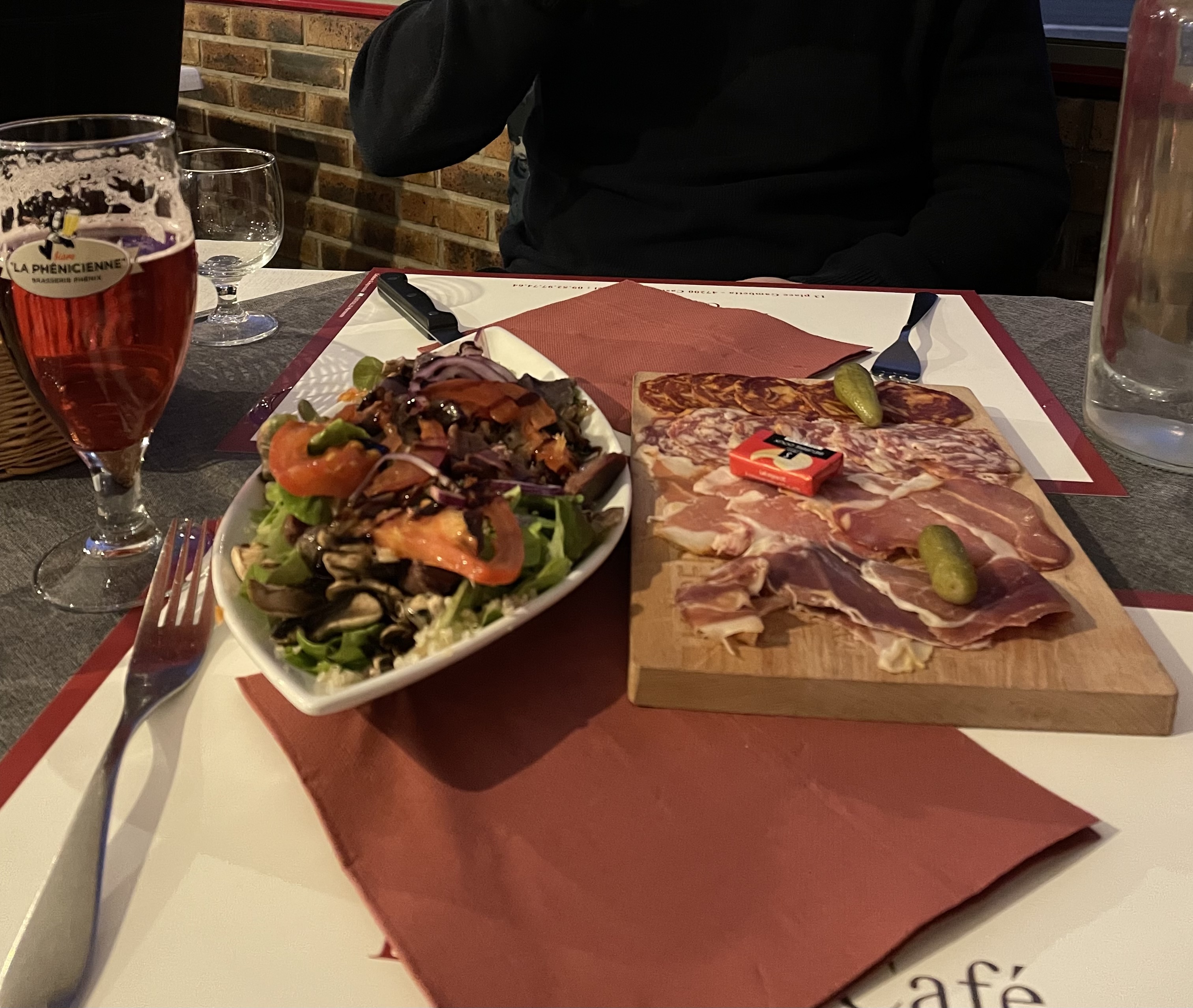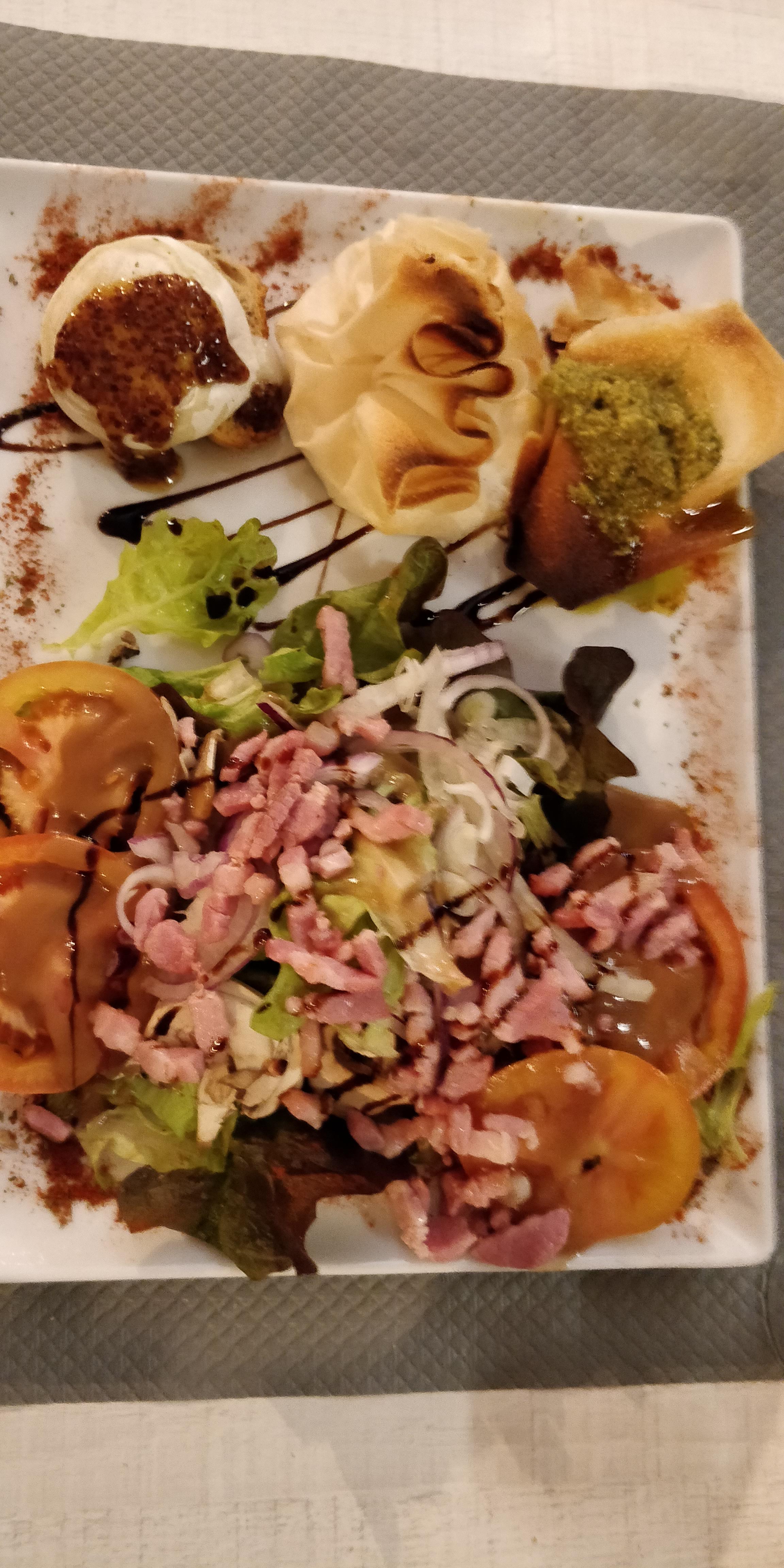 Nous avons pris une salade trilogie de chèvre et une pizza grand café, concernant la salade qui contenait seulement UNE DEMI (coupée en deux!!) burrata de chèvre, trois pauvres morceaux de poitrine fumée, une aumônière pas croustillante et peu fournie et un petit toast de chèvre pour 16 euros et salade même pas ou à peine assaisonnée.. le plus décevant la pizza pour 16euros d'une taille ridicule au gésier et canard, nous n'avons jamais vu le canard ! et la pâte fine et sèche, nous avons dû nous refaire à manger à la maison ... mais les deux serveurs étaient très agréables.