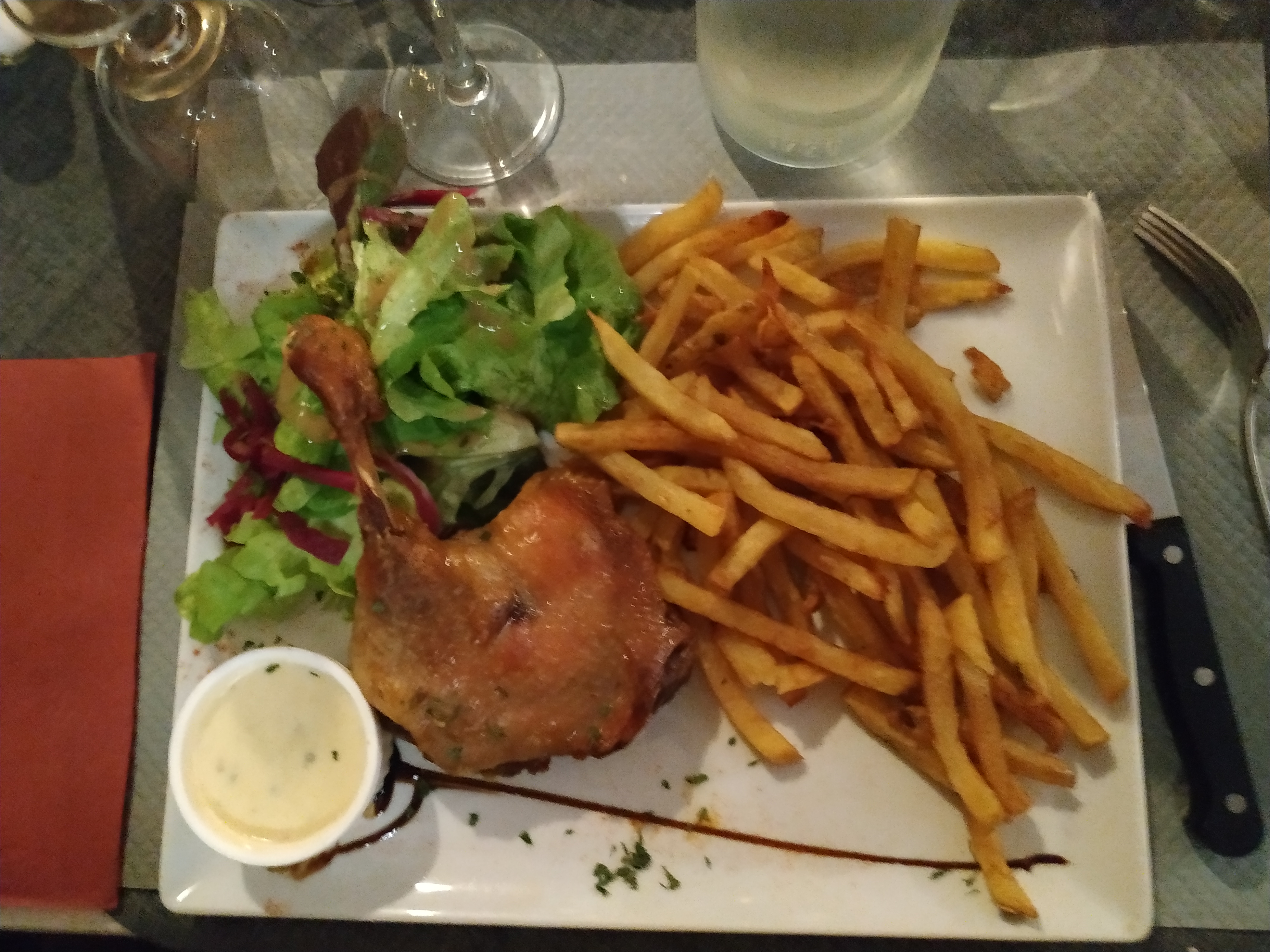 J ai trouvé ma cuisses de canard un peu sec par endroit dur les frittes ça va le dessert bof