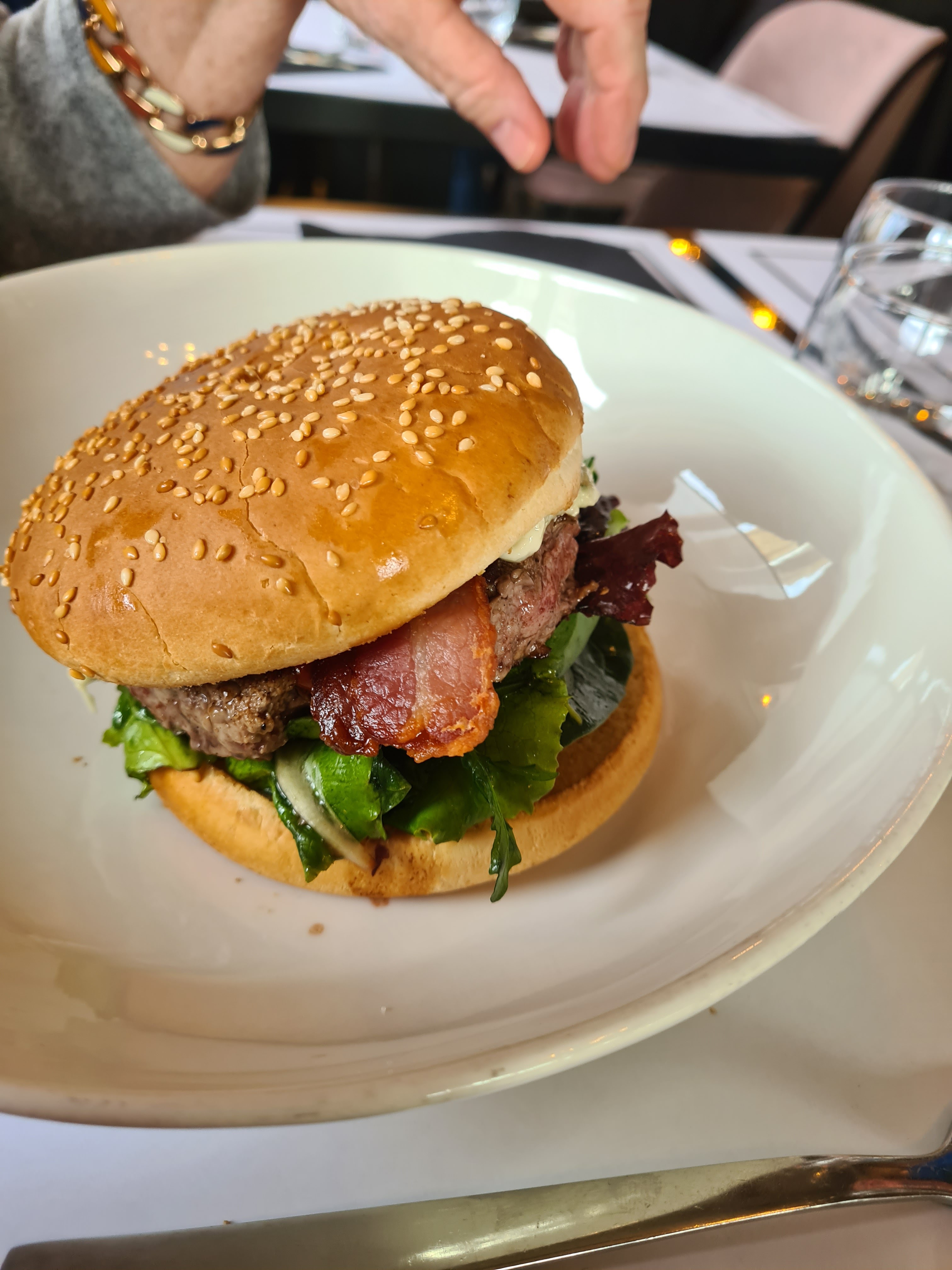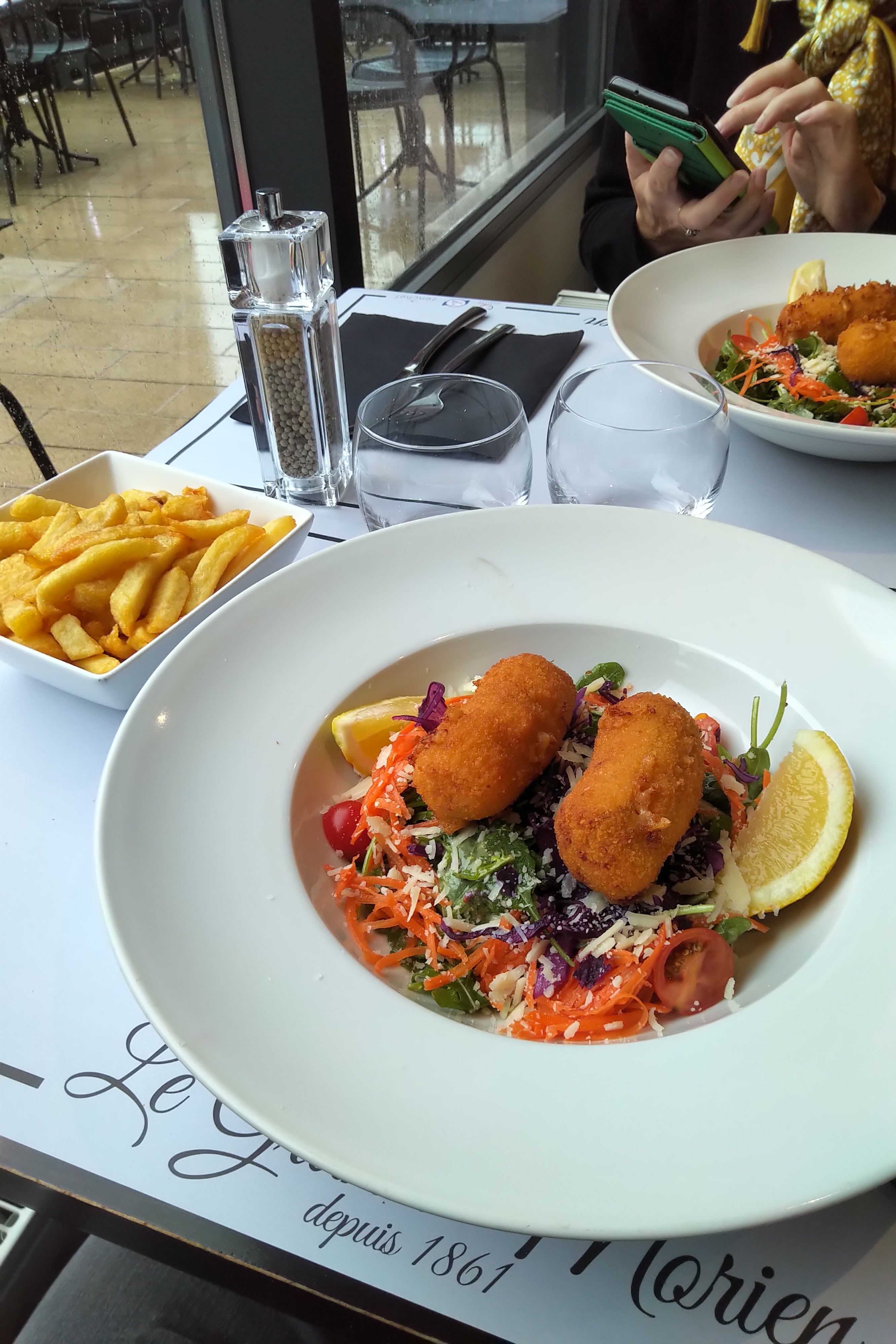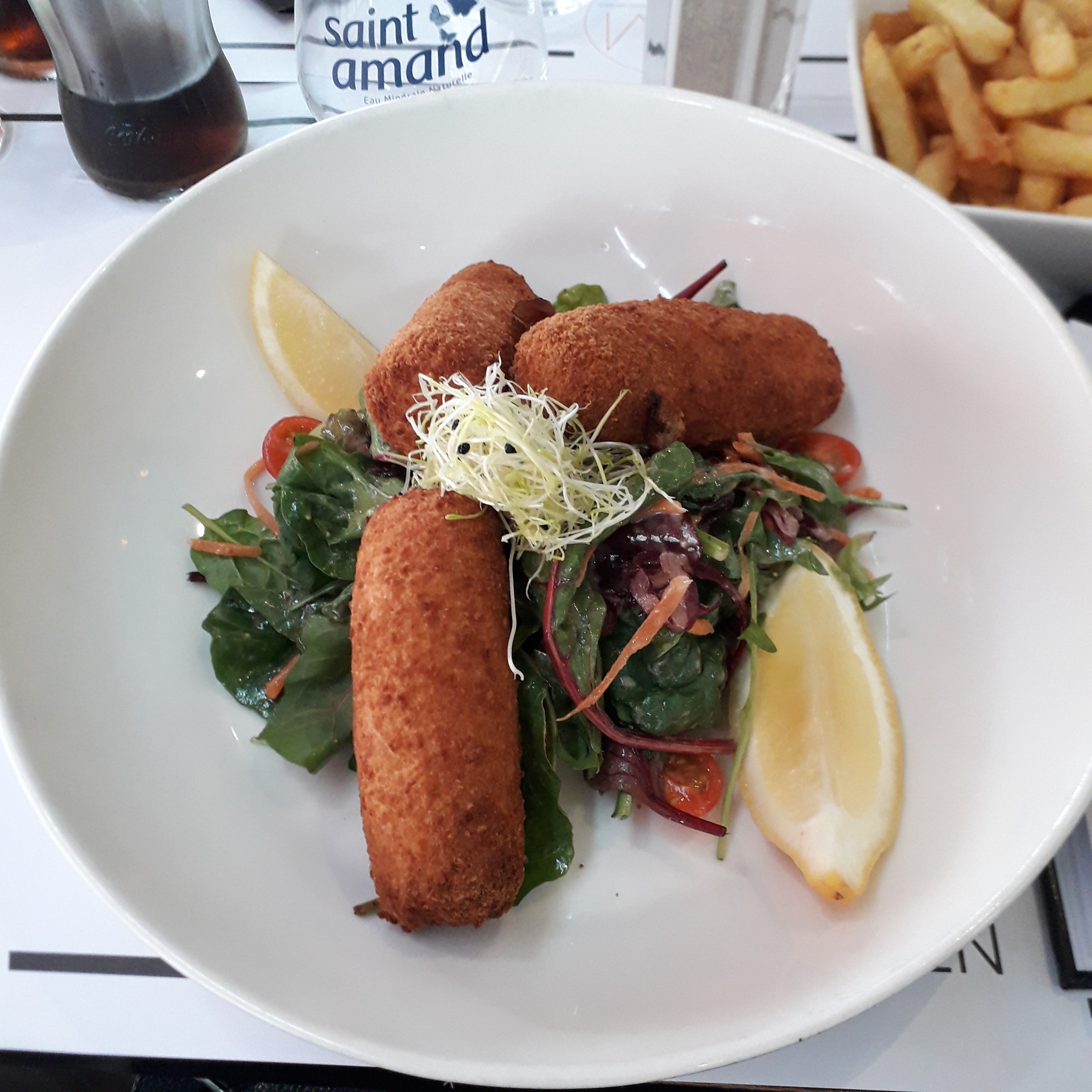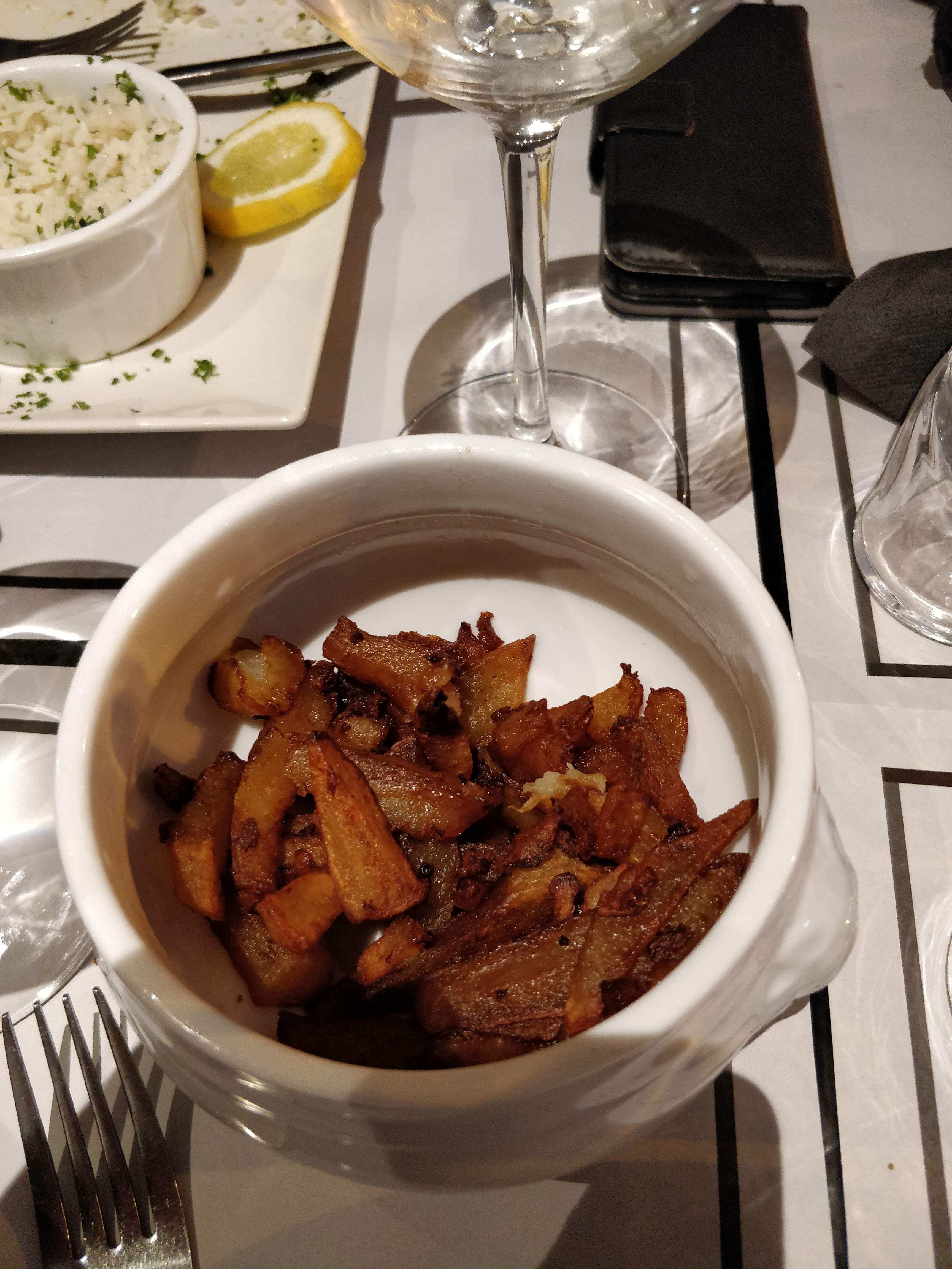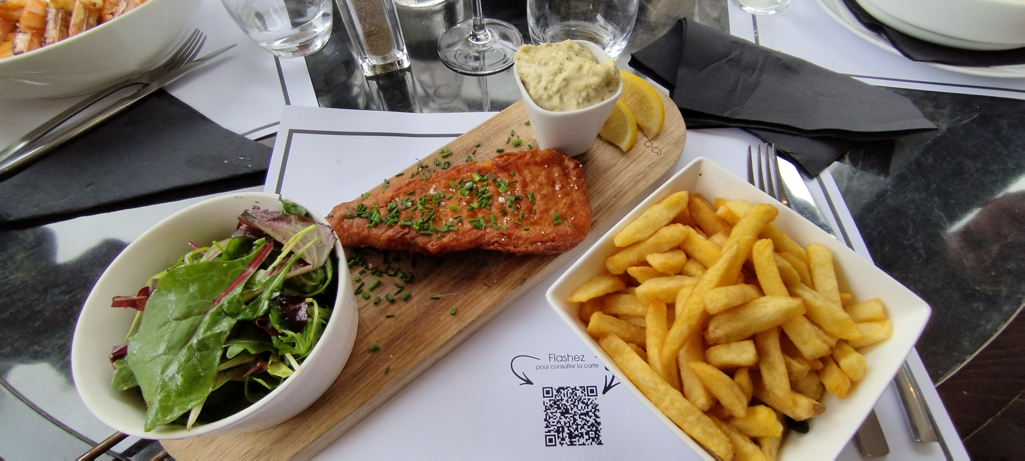 Accueil et service rien à redire, J'ai pris un hamburger et ma femme du saumon je crois... En tout cas très bon. Et les desserts super bons également ( café gourmand et profiteroles). Ça aurait vraiment pû être parfait si les frites n'avaient pas été immangeables ( je n'en ai mangé que 3 ) Vraiment vraiment dommage, faire des bonnes frites quand tout le reste est top ça devrait pouvoir se faire.