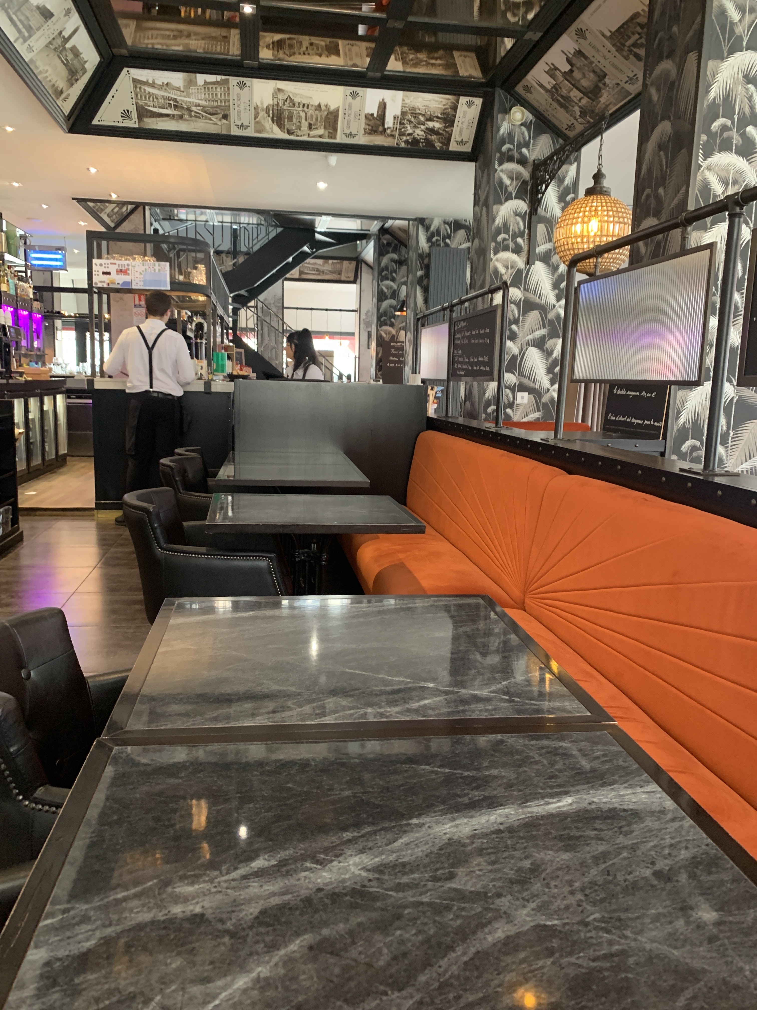 Je ne pensais plus du tout à ce lieu et j'ai été très étonné de voir la super déco quand je suis entré car j'avais encore de vieux souvenirs de ce lieu comme étant un café assez bourgeois. Le plat avec le poisson était une tuerie ! La sauce au pois ne sentait pas trop le pois mais qu'est-ce qu'elle était bonne ! Un plat de poisson bien gourmand avec les pâtes façon risotto, c'est top. Et assiette jolie. Le service était top. Le RDC était rempli. C'est vrai que c'est animé voire bruyant pour certains. Nous sommes allés à l'étage et là haut l'ambiance est plus calme, la vue est pas mal. J'ai goûté un peu du burger aussi. Visuellement, il ne donnait pas envie et la belle assiette ne convenait pas pour ce burger qui semblait bien seul (les frites étaient servies à côté), je conseillerais de choisir un autre plat ou une ardoise. En revanche, en goûtant, la viande était super bien cuite et le bacon croustillant était digne de s'appeler Bacon ! Y a que le bun qui m'a déçu. Bref, une belle surprise !