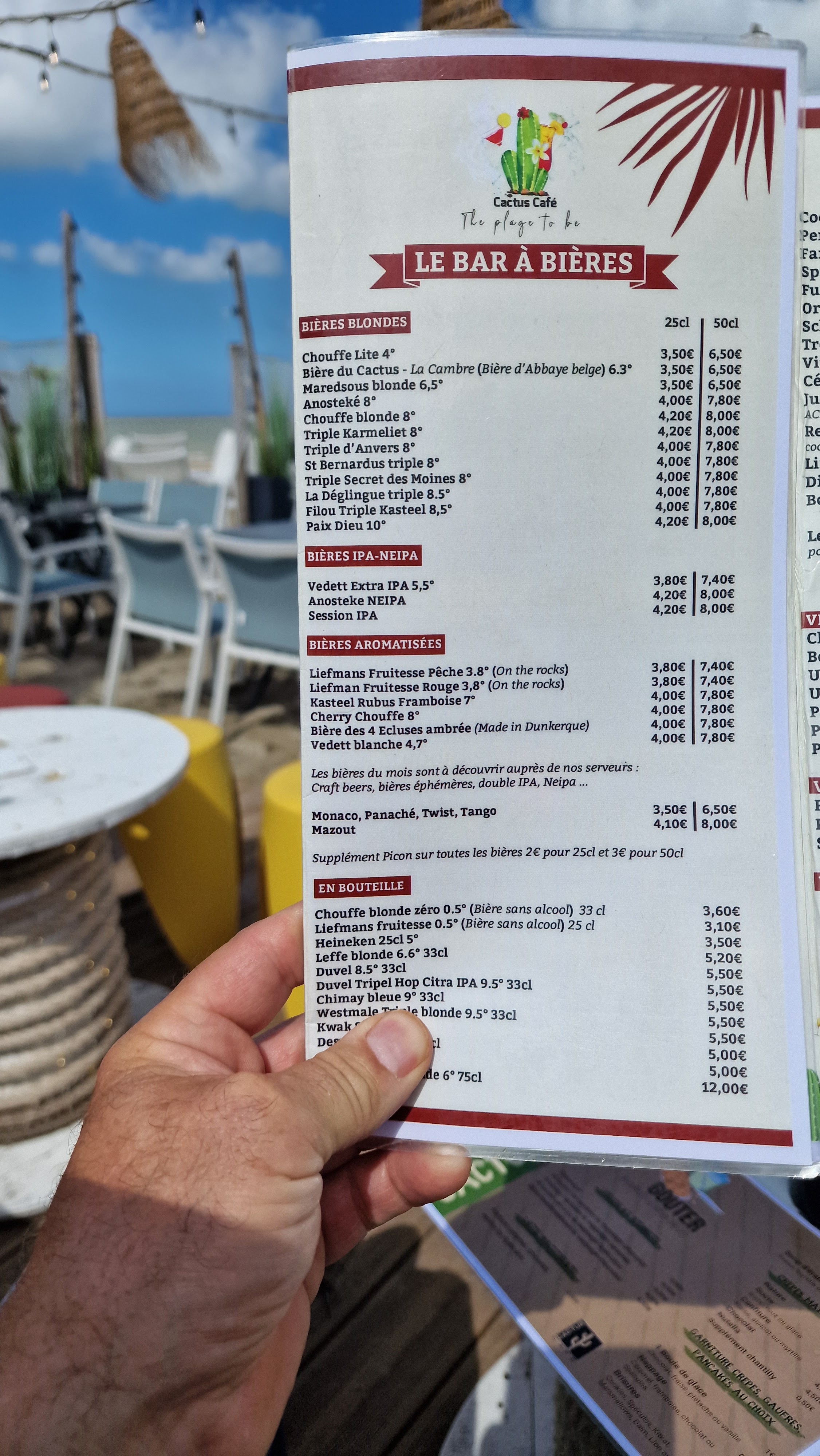 Très déçu par la note. Il y a une différence entre faire du commerce et escroquer les gens. Nous avons payé 6.2 euros pour une Lifmans fruité. La même consommation les pieds dans le sable et seulement à 2km de distance coûte 3.8 euros. Voir photo !